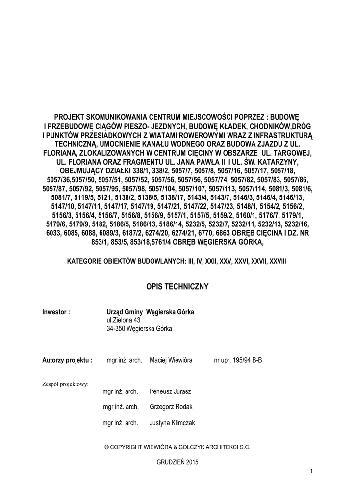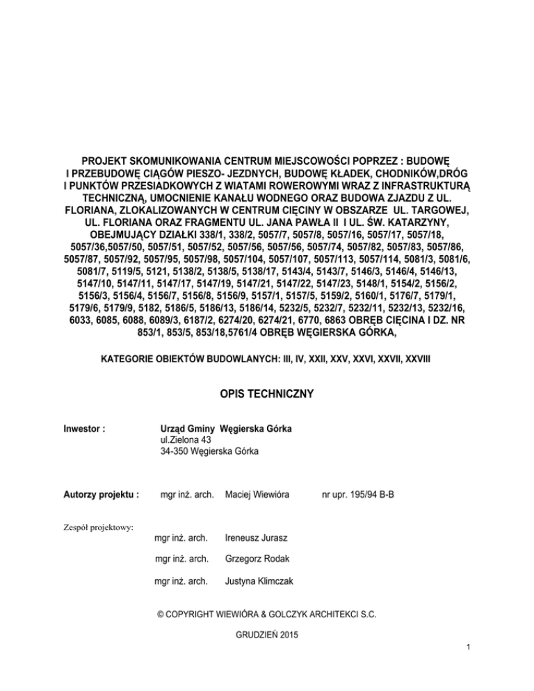 PROJEKT SKOMUNIKOWANIA CENTRUM MIEJSCOWOŚCI POPRZEZ : BUDOWĘ I PRZEBUDOWĘ CIĄGÓW PIESZO- JEZDNYCH, BUDOWĘ KŁADEK, CHODNIKÓW,DRÓG I PUNKTÓW PRZESIADKOWYCH Z WIATAMI ROWEROWYMI WRAZ Z INFRASTRUKTURĄ TECHNICZNĄ, UMOCNIENIE KANAŁU WODNEGO ORAZ BUDOWA ZJAZDU Z UL. FLORIANA, ZLOKALIZOWANYCH W CENTRUM CIĘCINY W OBSZARZE UL. TARGOWEJ, UL. FLORIANA ORAZ FRAGMENTU UL. JANA PAWŁA II I UL. ŚW. KATARZYNY, OBEJMUJĄCY DZIAŁKI 338/1, 338/2, 5057/7, 5057/8, 5057/16, 5057/17, 5057/18, 5057/36,5057/50, 5057/51, 5057/52, 5057/56, 5057/56, 5057/74, 5057/82, 5057/83, 5057/86, 5057/87, 5057/92, 5057/95, 5057/98, 5057/104, 5057/107, 5057/113, 5057/114, 5081/3, 5081/6, 5081/7, 5119/5, 5121, 5138/2, 5138/5, 5138/17, 5143/4, 5143/7, 5146/3, 5146/4, 5146/13, 5147/10, 5147/11, 5147/17, 5147/19, 5147/21, 5147/22, 5147/23, 5148/1, 5154/2, 5156/2, 5156/3, 5156/4, 5156/7, 5156/8, 5156/9, 5157/1, 5157/5, 5159/2, 5160/1, 5176/7, 5179/1, 5179/6, 5179/9, 5182, 5186/5, 5186/13, 5186/14, 5232/5, 5232/7, 5232/11, 5232/13, 5232/16, 6033, 6085, 6088, 6089/3, 6187/2, 6274/20, 6274/21, 6770, 6863 OBRĘB CIĘCINA I DZ. NR 853/1, 853/5, 853/18,5761/4 OBRĘB WĘGIERSKA GÓRKA, KATEGORIE OBIEKTÓW BUDOWLANYCH: III, IV, XXII, XXV, XXVI, XXVII, XXVIII OPIS TECHNICZNY Inwestor : Urząd Gminy Węgierska Górka ul.Zielona 43 34-350 Węgierska Górka Autorzy projektu : mgr inż. arch. Maciej Wiewióra nr upr. 195/94 B-B Zespół projektowy: mgr inż. arch. Ireneusz Jurasz mgr inż. arch. Grzegorz Rodak mgr inż. arch. Justyna Klimczak © COPYRIGHT WIEWIÓRA & GOLCZYK ARCHITEKCI S.C. GRUDZIEŃ 2015 1 I. SPIS ZAWARTOŚCI PROJEKTU ZAGOSPODAROWANIA TERENU 1. 2. II. Część opisowa Część graficzna Rys. nr 001 – Projekt zagospodarowania terenu 1:1000 Rys. nr 002 – Projekt zagospodarowania terenu ,,A'' 1:500 Rys. nr 003 – Projekt zagospodarowania terenu ,,B”” 1:500 Rys. nr 004 – Projekt zagospodarowania terenu ,,C'' 1:500 Rys. nr 01 – Detal 1 skala 1:100 Rys. nr 02 – Detal 2 skala 1:100 Rys. nr 03 – Detal 3 skala 1:100 Rys. nr 04– Detal 4 skala 1:100 Rys. nr 05– Detal 5 skala 1:100 Rys. nr 06 – Detal 6 skala 1:100 Rys. nr 07 – Detal 7 skala 1:100 Rys. nr 08 – Detal 8 skala 1:100 Rys. nr 09 – Detal 9 skala 1:100 Rys. nr 10 – Detal 10 skala 1:100 Rys. nr 11 – Detal 11 skala 1:25 DANE PODSTAWOWE 1. Temat projektu. Projekt budowy i przebudowy ciągów pieszo- jezdnych, budowy kładek, chodników, i punktów przesiadkowych z wiatami rowerowymi wraz z infrastrukturą techniczną, umocnienia kanału wodnego oraz budowa zjazdu z ul. Floriana, zlokalizowanych w centrum Cięciny w obszarze ul. Targowej, ul. Floriana oraz fragmentu ul. Jana Pawła II i ul. Św. Katarzyny, obejmujący działki 338/1, 338/2, 5057/7, 5057/8, 5057/16, 5057/17, 5057/18, 5057/36,5057/50, 5057/51, 5057/52, 5057/56, 5057/56, 5057/74, 5057/82, 5057/83, 5057/86, 5057/87, 5057/92, 5057/95, 5057/98, 5057/104, 5057/107, 5057/113, 5057/114, 5081/3, 5081/6, 5081/7, 5119/5, 5121, 5138/2, 5138/5, 5138/17, 5143/4, 5143/7, 5146/3, 5146/4, 5146/13, 5147/10, 5147/11, 5147/17, 5147/19, 5147/21, 5147/22, 5147/23, 5148/1, 5154/2, 5156/2, 5156/3, 5156/4, 5156/7, 5156/8, 5156/9, 5157/1, 5157/5, 5159/2, 5160/1, 5176/7, 5179/1, 5179/6, 5179/9, 5182, 5186/5, 5186/13, 5186/14, 5232/5, 5232/7, 5232/11, 5232/13, 5232/16, 6033, 6085, 6088, 6089/3, 6187/2, 6274/20, 6274/21, 6770, 6863 obręb Cięcina i dz. Nr 853/1, 853/5, 853/18,5761/4 obręb Węgierska Górka, w ramach Regionalnego Programu Operacyjnego Województwa Śląskiego 2007-2013, Zintegrowane Inwestycje Terytorialne Subregion Południowy. 2. Lokalizacja. Cięcina, gmina Węgierska Górka 2 3. Inwestor. Urząd Gminy Węgierska Górka 4. Nazwa jednostki projektowej. WIEWIÓRA & GOLCZYK ARCHITEKCI S.C. 34-300 Żywiec ul. Kościuszki 42, tel./fax (033) 8616557 5. Imię i nazwisko projektanta. ARCHITEKTURA: 6. mgr inż. arch. Maciej Wiewióra nr upr. 195/94 B-B Podstawa opracowania. 1) 2) 3) 4) 7. Zlecenie inwestora. Wytyczne i wymagania inwestora. Kopia mapy do celów projektowych w skali 1:500 Zgody właścicieli gruntów objętych opracowaniem. Informacja dotycząca bezpieczeństwa prowadzeniu prac budowlanych i ochrony zdrowia przy W trakcie prowadzenia prac budowlanych należy przestrzegać przepisów dotyczących bezpieczeństwa i higieny pracy, a w szczególności należy zwrócić uwagę na zagrożenia związane z prowadzeniem robót: - hałas (kucie, wiercenia, cięcie) ostre wystające elementy powierzchnie gorące (prace spawalnicze, prace izolacyjne na gorąco) promieniowanie cieplne wysiłek fizyczny W celu zminimalizowania skutków działania zagrożeń na budowie będą stosowane: - odzież robocza, obuwie robocze, rękawice robocze - okulary spawalnicze - ochronniki słuchu - drabiny i pomosty - przerwy w pracy (wysiłek fizyczny) 3 III. PRZEDMIOT OPRACOWANIA. Projekt budowy i przebudowy ciągów pieszo- jezdnych, budowy kładek, chodników, dróg i punktów przesiadkowych z wiatami rowerowymi wraz z infrastrukturą techniczną, umocnienia kanału wodnego oraz budowa zjazdu z ul. Floriana, zlokalizowanych w centrum Cięciny w obszarze ul. Targowej, ul. Floriana oraz fragmentu ul. Jana Pawła II i ul. Św. Katarzyny, obejmujący działki 338/1, 338/2, 5057/7, 5057/8, 5057/16, 5057/17, 5057/18, 5057/36,5057/50, 5057/51, 5057/52, 5057/56, 5057/56, 5057/74, 5057/82, 5057/83, 5057/86, 5057/87, 5057/92, 5057/95, 5057/98, 5057/104, 5057/107, 5057/113, 5057/114, 5081/3, 5081/6, 5081/7, 5119/5, 5121, 5138/2, 5138/5, 5138/17, 5143/4, 5143/7, 5146/3, 5146/4, 5146/13, 5147/10, 5147/11, 5147/17, 5147/19, 5147/21, 5147/22, 5147/23, 5148/1, 5154/2, 5156/2, 5156/3, 5156/4, 5156/7, 5156/8, 5156/9, 5157/1, 5157/5, 5159/2, 5160/1, 5176/7, 5179/1, 5179/6, 5179/9, 5182, 5186/5, 5186/13, 5186/14, 5232/5, 5232/7, 5232/11, 5232/13, 5232/16, 6033, 6085, 6088, 6089/3, 6187/2, 6274/20, 6274/21, 6770, 6863 obręb Cięcina i dz. Nr 853/1, 853/5, 853/18,5761/4 obręb Węgierska Górka, w ramach Regionalnego Pro