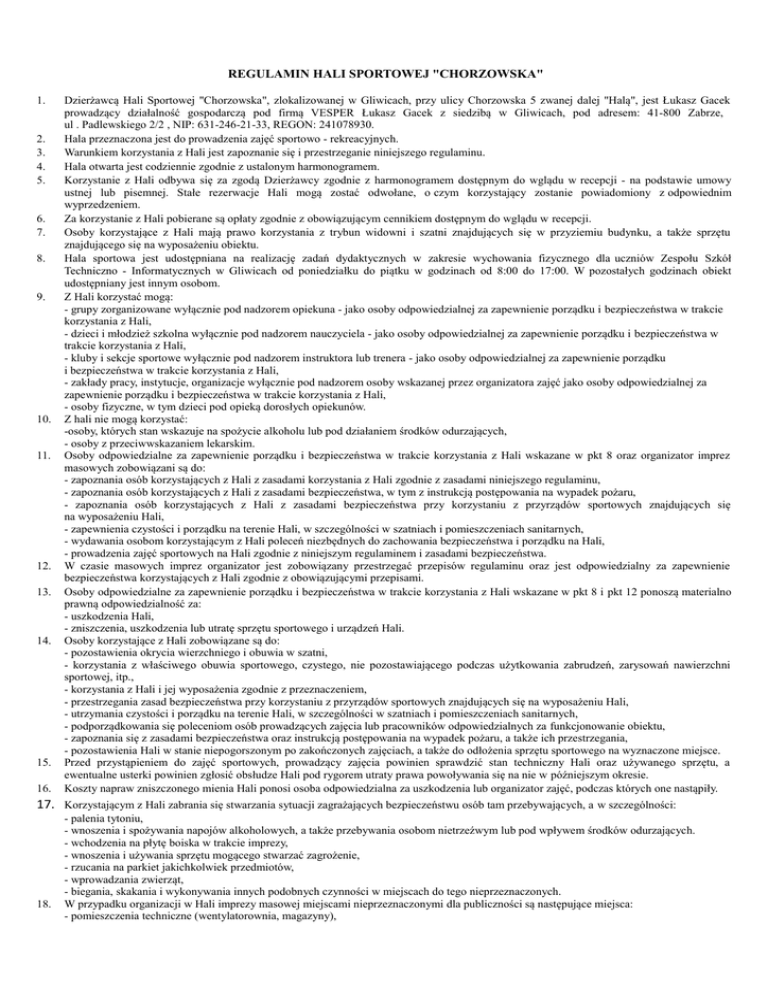 REGULAMIN HALI SPORTOWEJ "CHORZOWSKA" 1. 2. 3. 4. 5. 6. 7. 8. 9. 10. 11. 12. 13. 14. 15. 16. Dzierżawcą Hali Sportowej "Chorzowska", zlokalizowanej w Gliwicach, przy ulicy Chorzowska 5 zwanej dalej "Halą", jest Łukasz Gacek prowadzący działalność gospodarczą pod firmą VESPER Łukasz Gacek z siedzibą w Gliwicach, pod adresem: 41-800 Zabrze, ul . Padlewskiego 2/2 , NIP: 631-246-21-33, REGON: 241078930. Hala przeznaczona jest do prowadzenia zajęć sportowo - rekreacyjnych. Warunkiem korzystania z Hali jest zapoznanie się i przestrzeganie niniejszego regulaminu. Hala otwarta jest codziennie zgodnie z ustalonym harmonogramem. Korzystanie z Hali odbywa się za zgodą Dzierżawcy zgodnie z harmonogramem dostępnym do wglądu w recepcji - na podstawie umowy ustnej lub pisemnej. Stałe rezerwacje Hali mogą zostać odwołane, o czym korzystający zostanie powiadomiony z odpowiednim wyprzedzeniem. Za korzystanie z Hali pobierane są opłaty zgodnie z obowiązującym cennikiem dostępnym do wglądu w recepcji. Osoby korzystające z Hali mają prawo korzystania z trybun widowni i szatni znajdujących się w przyziemiu budynku, a także sprzętu znajdującego się na wyposażeniu obiektu. Hala sportowa jest udostępniana na realizację zadań dydaktycznych w zakresie wychowania fizycznego dla uczniów Zespołu Szkół Techniczno - Informatycznych w Gliwicach od poniedziałku do piątku w godzinach od 8:00 do 17:00. W pozostałych godzinach obiekt udostępniany jest innym osobom. Z Hali korzystać mogą: - grupy zorganizowane wyłącznie pod nadzorem opiekuna - jako osoby odpowiedzialnej za zapewnienie porządku i bezpieczeństwa w trakcie korzystania z Hali, - dzieci i młodzież szkolna wyłącznie pod nadzorem nauczyciela - jako osoby odpowiedzialnej za zapewnienie porządku i bezpieczeństwa w trakcie korzystania z Hali, - kluby i sekcje sportowe wyłącznie pod nadzorem instruktora lub trenera - jako osoby odpowiedzialnej za zapewnienie porządku i bezpieczeństwa w trakcie korzystania z Hali, - zakłady pracy, instytucje, organizacje wyłącznie pod nadzorem osoby wskazanej przez organizatora zajęć jako osoby odpowiedzialnej za zapewnienie porządku i bezpieczeństwa w trakcie korzystania z Hali, - osoby fizyczne, w tym dzieci pod opieką dorosłych opiekunów. Z hali nie mogą korzystać: -osoby, których stan wskazuje na spożycie alkoholu lub pod działaniem środków odurzających, - osoby z przeciwwskazaniem lekarskim. Osoby odpowiedzialne za zapewnienie porządku i bezpieczeństwa w trakcie korzystania z Hali wskazane w pkt 8 oraz organizator imprez masowych zobowiązani są do: - zapoznania osób korzystających z Hali z zasadami korzystania z Hali zgodnie z zasadami niniejszego regulaminu, - zapoznania osób korzystających z Hali z zasadami bezpieczeństwa, w tym z instrukcją postępowania na wypadek pożaru, - zapoznania osób korzystających z Hali z zasadami bezpieczeństwa przy korzystaniu z przyrządów sportowych znajdujących się na wyposażeniu Hali, - zapewnienia czystości i porządku na terenie Hali, w szczególności w szatniach i pomieszczeniach sanitarnych, - wydawania osobom korzystającym z Hali poleceń niezbędnych do zachowania bezpieczeństwa i porządku na Hali, - prowadzenia zajęć sportowych na Hali zgodnie z niniejszym regulaminem i zasadami bezpieczeństwa. W czasie masowych imprez organizator jest zobowiązany przestrzegać przepisów regulaminu oraz jest odpowiedzialny za zapewnienie bezpieczeństwa korzystających z Hali zgodnie z obowiązującymi przepisami. Osoby odpowiedzialne za zapewnienie porządku i bezpieczeństwa w trakcie korzystania z Hali wskazane w pkt 8 i pkt 12 ponoszą materialno prawną odpowiedzialność za: - uszkodzenia Hali, - zniszczenia, uszkodzenia lub utratę sprzętu sportowego i urządzeń Hali. Osoby korzystające z Hali zobowiązane są do: - pozostawienia okrycia wierzchniego i obuwia w szatni, - korzystania z właściwego obuwia sportowego, czystego, nie pozostawiającego podczas użytkowania zabrudzeń, zarysowań nawierzchni sportowej, itp., - korzystania z Hali i jej wyposażenia zgodnie z przeznaczeniem, - przestrzegania zasad bezpieczeństwa przy korzystaniu z przyrządów sportowych znajdujących się na wyposażeniu Hali, - utrzymania czystości i porządku na terenie Hali, w szczególności w szatniach i pomieszczeniach sanitarnych, - podporządkowania się poleceniom osób prowadzących zajęcia lub pracowników odpowiedzialnych za funkcjonowanie obiektu, - zapoznania się z zasadami bezpieczeństwa oraz instrukcją postępowania na wypadek pożaru, a także ich przestrzegania, - pozostawienia Hali w stanie niepogorszonym po zakończonych zajęciach, a także do odłożenia sprzętu sportowego na wyznaczone miejsce. Przed przystąpieniem do zajęć sportowych, prowadzący zajęcia powinien sprawdzić stan techniczny Hali oraz używanego sprzętu, a ewentualne usterki powinien zgłosić obsłudze Hali pod rygorem utraty prawa powoływania się na nie w późniejszym okresie. Koszty napraw zniszczonego mienia Hali ponosi osoba odpowiedzialna za uszkodzenia lub organizator zajęć, podczas których one nastąpiły. 17. Korzystającym z Hali zabrania się stwarzania sytuacji zagrażających bezpieczeństwu osób tam przebywających, a w szczególności: 18. - palenia tytoniu, - wnoszenia i spożywania napojów alkoholowych, a także przebywania osobom nietrzeźwym lub pod wpływem środków odurzających. - wchodzenia na płytę boiska w trakcie imprezy, - wnoszenia i używania sprzętu mogącego stwarzać zagrożenie, - rzucania na parkiet jakichkolwiek przedmiotów, - wprowadzania zwierząt, - biegania, skakania i wykonywania innych podobnych czynności w miejscach do tego nieprzeznaczonych. W przypadku organizacji w Hali imprezy masowej miejscami nieprzeznaczonymi dla publiczności są następujące miejsca: - pomieszczenia techniczne (wentylatorownia, magazyny), 19. 20. 21. 22. 23. - szatnie, hol dla z