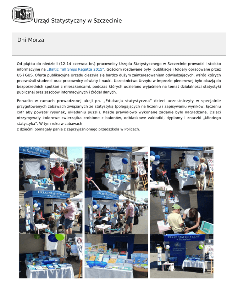 Urząd Statystyczny w Szczecinie Dni Morza Od piątku do niedzieli (12-14 czerwca br.) pracownicy Urzędu Statystycznego w Szczecinie prowadzili stoisko informacyjne na „Baltic Tall Ships Regatta 2015”. Gościom rozdawane były publikacje i foldery opracowane przez US i GUS. Oferta publikacyjna Urzędu cieszyła się bardzo dużym zainteresowaniem odwiedzających, wśród których przeważali studenci oraz pracownicy oświaty i nauki. Uczestnictwo Urzędu w imprezie plenerowej było okazją do bezpośrednich spotkań z mieszkańcami, podczas których udzielano wyjaśnień na temat działalności statystyki publicznej oraz zasobów informacyjnych i źródeł danych. Ponadto w ramach prowadzonej akcji pn. „Edukacja statystyczna” dzieci uczestniczyły w specjalnie przygotowanych zabawach związanych ze statystyką (polegających na liczeniu i zapisywaniu wyników, łączeniu cyfr aby powstał rysunek, układaniu puzzli). Każde prawidłowo wykonane zadanie było nagradzane. Dzieci otrzymywały kolorowe zwierzątka zrobione z balonów, odblaskowe zakładki, dyplomy i znaczki „Młodego statystyka”. W tym roku w zabawach z dziećmi pomagały panie z zaprzyjaźnionego przedszkola w Policach.