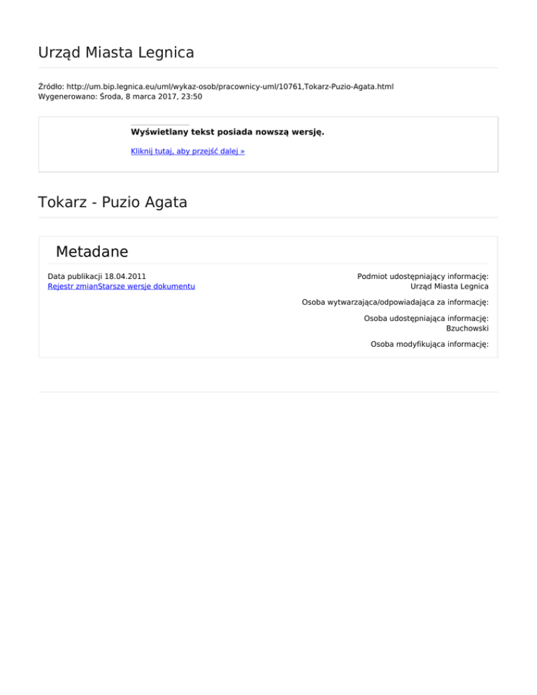 Urząd Miasta Legnica Źródło: http://um.bip.legnica.eu/uml/wykaz-osob/pracownicy-uml/10761,Tokarz-Puzio-Agata.html Wygenerowano: Środa, 8 marca 2017, 23:50 Wyświetlany tekst posiada nowszą wersję. Kliknij tutaj, aby przejść dalej » Tokarz - Puzio Agata Metadane Data publikacji 18.04.2011 Rejestr zmianStarsze wersje dokumentu Podmiot udostępniający informację: Urząd Miasta Legnica Osoba wytwarzająca/odpowiadająca za informację: Osoba udostępniająca informację: Bzuchowski Osoba modyfikująca informację: