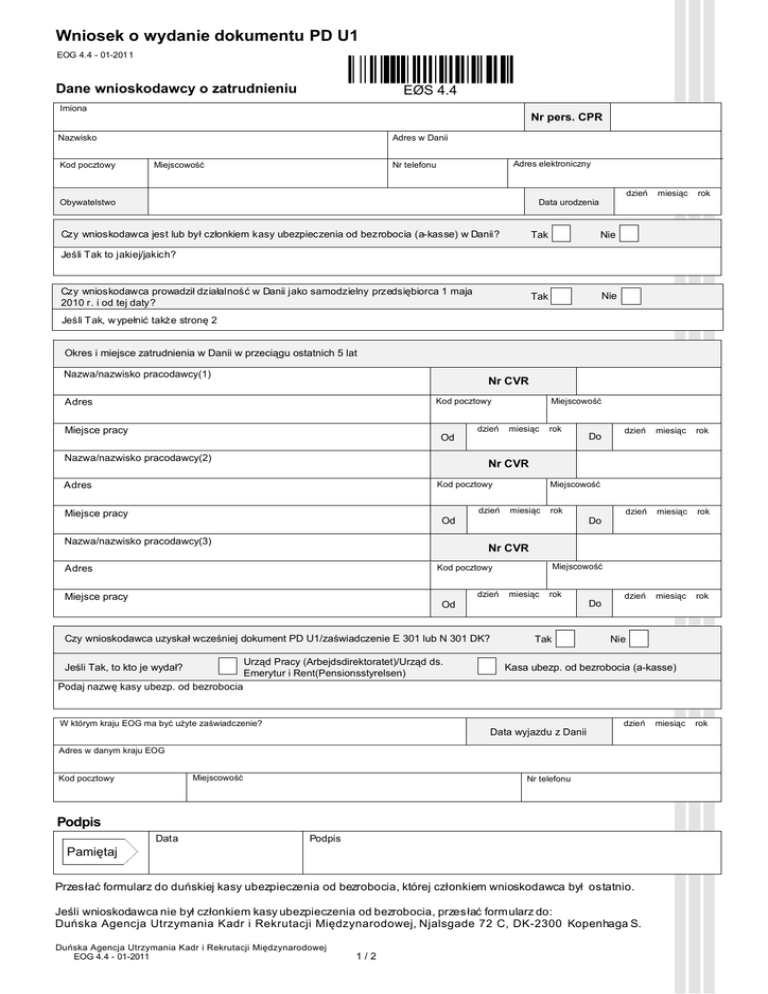 Wniosek o wydanie dokumentu PD U1 EOG 4.4 - 01-2011 Dane wnioskodawcy o zatrudnieniu EØS 4.4 Imiona Nr pers. CPR Nazwisko Kod pocztowy Adres w Danii Miejscowość Adres elektroniczny Nr telefonu dzień miesiąc rok dzień miesiąc rok dzień miesiąc rok dzień miesiąc rok Data urodzenia Obywatelstwo Czy wnioskodawca jest lub był członkiem kasy ubezpieczenia od bezrobocia (a-kasse) w Danii? Tak Nie Tak Nie Jeśli Tak to jakiej/jakich? Czy wnioskodawca prowadził działalność w Danii jako samodzielny przedsiębiorca 1 maja 2010 r. i od tej daty? Jeśli Tak, w ypełnić także stronę 2 Okres i miejsce zatrudnienia w Danii w przeciągu ostatnich 5 lat Nazwa/nazwisko pracodawcy(1) Nr CVR Adres Kod pocztowy Miejsce pracy Od Nazwa/nazwisko pracodawcy(2) dzień Miejscowość miesiąc rok Nr CVR Kod pocztowy Adres dzień Miejsce pracy Miejscowość miesiąc rok Od Nazwa/nazwisko pracodawcy(3) Do Nr CVR Miejscowość Kod pocztowy Adres dzień Miejsce pracy miesiąc rok Od Czy wnioskodawca uzyskał wcześniej dokument PD U1/zaświadczenie E 301 lub N 301 DK? Urząd Pracy (Arbejdsdirektoratet)/Urząd ds. Emerytur i Rent(Pensionsstyrelsen) Jeśli Tak, to kto je wydał? Do Tak Do Nie Kasa ubezp. od bezrobocia (a-kasse) Podaj nazwę kasy ubezp. od bezrobocia W którym kraju EOG ma być użyte zaświadczenie? Data wyjazdu z Danii dzień Adres w danym kraju EOG Miejscowość Kod pocztowy Nr telefonu Podpis Data Podpis Pamiętaj Przes łać formularz do duńskiej kasy ubezpieczenia od bezrobocia, której członkiem wnioskodawca był ostatnio. Jeśli wnioskodawca nie był członkiem kasy ubezpieczenia od bezrobocia, przesłać formularz do: Duńska Agencja Utrzymania Kadr i Rekrutacji Międzynarodowej, Njalsgade 72 C, DK-2300 Kopenhaga S. Duńska Agencja Utrzymania Kadr i Rekrutacji Międzynarodowej EOG 4.4 - 01-2011 1/2 miesiąc rok Informacje wnioskodawcy o samodzielnej działalności gospodarczej Imiona Nr pers. CPR Nazwisko Kod pocztowy Adres w Danii Miejscowość Adres elektroniczny Nr telefonu Obywatelstwo Data urodzenia Czy wnioskodawca jest lub był członkiem kasy ubezpieczenia od bezrobocia (a-kasse) w Danii? Tak dzień miesiąc rok Nie Jeśli tak to jakiej/jakich? Okresy, w jakich była prowadzona samodzielna działalność gospodarcza w Danii Nazwa przedsiębiorstwa (1) Nr CVR Kod pocztowy Adres przedsiębiorstwa Branża Miejscowość dzień miesiąc rok Od Nazwa przedsiębiorstwa (2) Do dzień miesiąc rok Nr CVR Kod pocztowy Adres przedsiębiorstwa Branża Miejscowość dzień miesiąc rok dzień miesiąc rok Od Do Nazwa przedsiębiorstwa (3) Nr CVR Adres przedsiębiorstwa Kod pocztowy Branża Miejscowość dzień miesiąc rok dzień miesiąc rok Do Od Czy zaprzestanie samodzielnej działalności w Danii jest ostateczne? Tak Nie Jeśli tak, podać powód zaprzestania działalności W którym kraju EOG ma służyć zaświadczenie Data wyjazdu z Danii dzień miesiąc rok Adres w danym kraju EOG Kod pocztowy Miejscowość Nr telefonu Podpis Data Podpis Pamiętaj Przesłać formularz do duńskiej kasy ubezpieczenia od bezrobocia, której członkiem wnioskodawca był ostatnio. Jeśli wnioskodawca nie był członkiem kasy ubezpieczenia od bezrobocia, przesłać formularz do: Duńska Agencja Utrzymania Kadr i Rekrutacji Międzynarodowej, Njalsgade 72 C, DK-2300 Kopenhaga S. Duńska Agencja Utrzymania Kadr i Rekrutacji Międzynarodowej EOG 4.4 - 01-2011 2/2