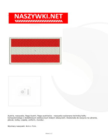 Austria, naszywka, flaga Austrii, flaga austriacka - naszywka wykonana techniką haftu komputerowego z dodatkowym estetycznym białym obszyciem. Doskonała do wszycia na ubranie, plecak, torbę, czapkę, uniform, mundur. Wymiary naszywki: 4cm x 7cm. Strona 1 z 2 Strona 2 z 2