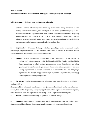 REGULAMIN Aukcji charytatywnej organizatorem, której jest Fundacja Świętego Mikołaja I. UŜyte terminy i definicje oraz podstawowe załoŜenia 1. Świstak - serwis internetowy umoŜliwiający prowadzenie aukcji w trybie on-line, którego właścicielem znaku, jak i zawartych w nim treści, jest Swistak.pl Sp. z o.o., zarejestrowana w KRS pod numerem 0000239865, z siedzibą w Warszawie przy ulicy Kłopotowskiego 22. Świstak.pl Sp. z o. o., jako podmiot wspierający Aukcję, udostępnia Organizatorowi stronę internetową www.swistak.pl oraz sprzęt i obsługę techniczną umoŜliwiające przeprowadzenie licytacji on-line. 2. Organizator - Fundacja Świętego Mikołaja, posiadająca status organizacji poŜytku publicznego, zarejestrowana w KRS pod numerem 0000126602, z siedzibą w Piasecznie, przy ul. Przesmyckiego 40, NIP: 123-09-97-285, Regon: 015474315 3. Aukcja - aukcja internetowa, prowadzona przez Organizatora, w okresie od 14 grudnia 2009 r. (start godzina 12.00) do 21 grudnia 2009 r. (koniec godzina 24.00). Środki pozyskane z aukcji zostaną przeznaczone przez Organizatora na zakup sprzętu sportowego lub zajęć sportowych dla dzieci z rodzinnych domów dziecka. Towary wystawione na aukcji określone są w załączniku nr 1 do niniejszego regulaminu. W Aukcji mogą uczestniczyć wyłącznie UŜytkownicy posiadający Konta (zgodnie z definicjami poniŜej). 4. Zwycięzca - osoba, która zaproponuje najwyŜszą cenę, na godzinę 24.00 w dniu 21 grudnia 2009 r. Zwycięzca, który w terminie określonym w niniejszym regulaminie nie zapłaci za zakupiony Towar, traci status Zwycięzcy, a Zwycięzcą jest osoba, która zaproponowała najwyŜszą cenę zaraz po osobie, która nie zapłaciła za zakupiony Towar i zapłaci zaoferowaną cenę. 5. Towar - przedmiot wystawiony na sprzedaŜ, w ramach Aukcji. 6. Konto - stworzony przez system obsługi aukcji profil uŜytkownika, zawierający jego dane osobowe i kontaktowe, aktywny na stronie internetowej.www.swistak.pl, który zarejestrował się, jako uŜytkownik i posiada Konto - zgodnie z zasadami określonymi w Rozdziale II (Rejestracja) i Rozdziale III (Konta) Regulaminu serwisu internetowego www.swistak.pl, dostępnego pod adresem. www.swistak.pl/info/regulamin.html. 6. UŜytkownik - osoba fizyczna lub prawna posiadająca aktywne Konto w systemie aukcyjnym. UŜytkownikiem moŜe zostać tylko i wyłącznie osoba pełnoletnia. Dane osobowe UŜytkowników mogą być przekazane przez administratora tych danych Agorze S.A. z siedzibą w Warszawie, celem doręczenia Towarów, zakupionych, w związku z Aukcją - na co UŜytkownik wyraŜa zgodę. II. Aukcja Aukcja zostanie przeprowadzona na zasadach licytacji. PowyŜsze oznacza, Ŝe przez cały czas trwania Aukcji tj. od 14 grudnia 2009 r. od godz. 12.00 do 21 grudnia 2009 r. do godz. 24.00., kaŜdy z UŜytkowników moŜe po zalogowaniu w serwisie, poprzez stronę aukcji zaproponować wyŜszą cenę zakupu Towaru od tej ujawnionej, przy danym Towarze, jako cena aktualnie najwyŜsza. Aukcja zostanie przeprowadzona, jako aukcja w rozumieniu Regulaminu serwisu internetowego www.swistak.pl, dostępnego pod adresem. www.swistak.pl/info/regulamin.html. Termin złoŜenia oferty z ceną przez UŜytkownika jest zachowany, jeŜeli cena tego UŜytkownika została zarejestrowana przy Towarze, którego dotyczy, najpóźniej 21 grudnia 2009 r. o godz. 24.00. UŜytkownik - Kupujący nie ma Ŝadnych praw do zakupionego Towaru w przypadku, gdy jego konto zostaje usunięte lub zablokowane. Aukcja moŜe zostać odwołana w przypadku wystąpienia przyczyn niezaleŜnych od Organizatora lub administratora Serwisu www.swistak.pl. III. Po wygranej aukcji 1. Zwycięzca zobowiązany jest, w terminie do 5 stycznia 2010 dokonać zapłaty (w wysokości zaoferowanej ceny) za zakupiony Towar, na konto Organizatora nr. 37 2130 0004 2001 0299 9993 0002 (decyduje data uznania rachunku bankowego Organizatora). JeŜeli w terminie 5-ciu dni od dnia upływu terminu, o którym mowa powyŜej, konto nie zostanie uznane kwotą przelaną przez Zwycięzcę, w wysokości zaoferowanej ceny, Zwycięzca traci status Zwycięzcy oraz prawo do Towaru - nie dochodzi do sprzedaŜy Towaru. 2. Organizator lub podmiot przez niego upowaŜniony przekaŜe Zwycięzcy zakupiony przez niego Towar, w terminie 14 dni od dnia uznania rachunku bankowego Organizatora kwotą stanowiącą równowartość ceny naleŜnej za ten Towar zaproponowaną przez UŜytkownika. IV Zasady i odpowiedzialność Organizatora Organizator zastrzega, Ŝe Towary wystawione na Aukcji są Towarami uŜywanymi, przez osoby, który zgodziły się na ich przekazanie i sprzedaŜ w ramach aukcji, środki z której zostaną przekazane na cele charytatywne. W związku z powyŜszym Organizator ponosi odpowiedzialność wyłącznie za niedostarczenie zamówionego Towaru oraz za jego zniszczenie i niezgodność z opisem zawartym przy jego wystawieniu podczas Aukcji. V Regulamin Organizator zastrzega sobie prawo do zmiany postanowień Regulaminu. Zmiany Regulaminu nie mogą naruszyć praw nabytych przez UŜytkowników, co nie wyłącza jednak prawa odwołania Aukcji, z przyczyn niezaleŜnych od Organizatora.