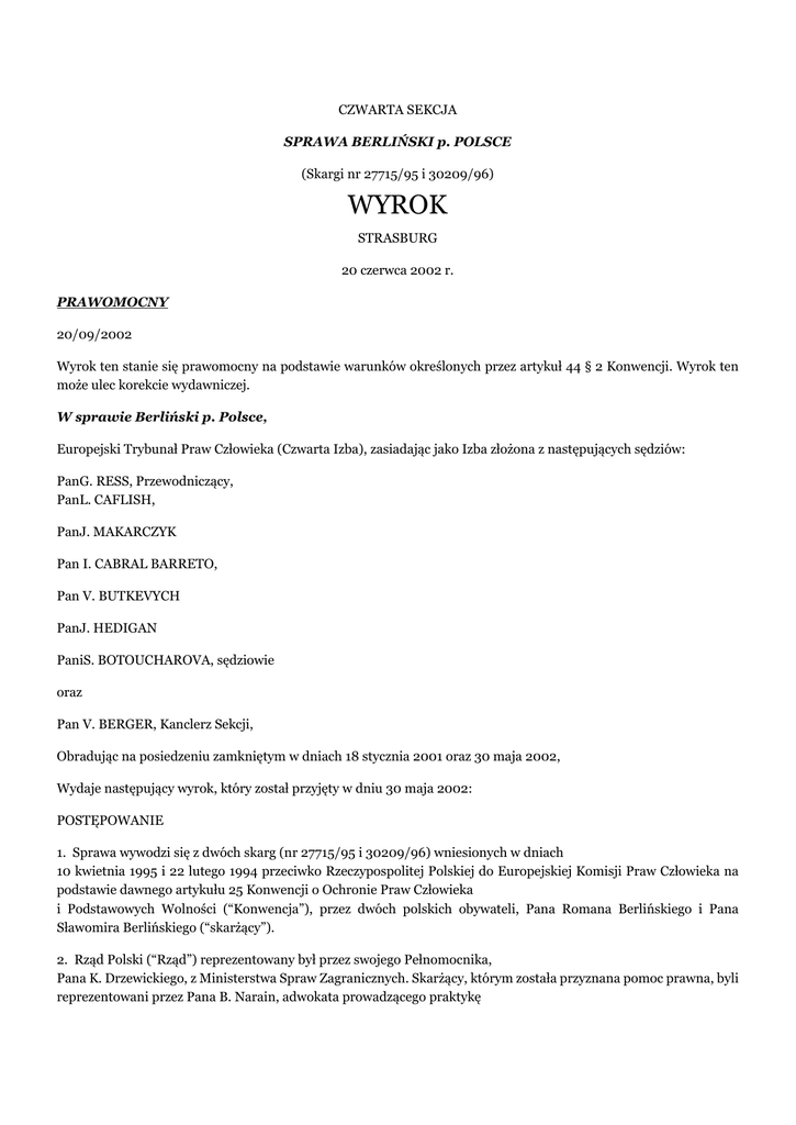 CZWARTA SEKCJA SPRAWA BERLIŃSKI p. POLSCE (Skargi nr 27715/95 i 30209/96) WYROK STRASBURG 20 czerwca 2002 r. PRAWOMOCNY 20/09/2002 Wyrok ten stanie się prawomocny na podstawie warunków określonych przez artykuł 44 § 2 Konwencji. Wyrok ten może ulec korekcie wydawniczej. W sprawie Berliński p. Polsce, Europejski Trybunał Praw Człowieka (Czwarta Izba), zasiadając jako Izba złożona z następujących sędziów: PanG. RESS, Przewodniczący, PanL. CAFLISH, PanJ. MAKARCZYK Pan I. CABRAL BARRETO, Pan V. BUTKEVYCH PanJ. HEDIGAN PaniS. BOTOUCHAROVA, sędziowie oraz Pan V. BERGER, Kanclerz Sekcji, Obradując na posiedzeniu zamkniętym w dniach 18 stycznia 2001 oraz 30 maja 2002, Wydaje następujący wyrok, który został przyjęty w dniu 30 maja 2002: POSTĘPOWANIE 1. Sprawa wywodzi się z dwóch skarg (nr 27715/95 i 30209/96) wniesionych w dniach 10 kwietnia 1995 i 22 lutego 1994 przeciwko Rzeczypospolitej Polskiej do Europejskiej Komisji Praw Człowieka na podstawie dawnego artykułu 25 Konwencji o Ochronie Praw Człowieka i Podstawowych Wolności (“Konwencja”), przez dwóch polskich obywateli, Pana Romana Berlińskiego i Pana Sławomira Berlińskiego (“skarżący”). 2. Rząd Polski (“Rząd”) reprezentowany był przez swojego Pełnomocnika, Pana K. Drzewickiego, z Ministerstwa Spraw Zagranicznych. Skarżący, którym została przyznana pomoc prawna, byli reprezentowani przez Pana B. Narain, adwokata prowadzącego praktykę w Londynie. 3. Skarżący zarzucali, w szczególności, że zostali poddani złemu traktowaniu przez funkcjonariuszy policji w dniu 4 października 1993 r., oraz że ich prawo do obrony zostało naruszone z uwagi na fakt, iż przez ponad rok nie posiadali obrońcy w trakcie postępowania przygotowawczego w sprawie karnej toczącej się przeciwko nim. 4. Skarga została przekazana Trybunałowi w dniu 1 listopada 1998 r., kiedy to Protokół nr 11 do Konwencji wszedł w życie (artykuł 5 § 2 Protokołu nr 11). 5. Skarga została przydzielona Czwartej Sekcji Trybunału (artykuł 52 § 1 Regulaminu Trybunału). Wewnątrz tej Sekcji ustanowiono Izbę (zgodnie z artykułem 27 § 1 Konwencji) w celu zbadania sprawy, jak przewiduje artykuł 26 § 1 Regulaminu Trybunału. Trybunał postanowił połączyć postępowania w sprawie obu skarg (artykuł 43 § 1 Regulaminu). 6. Na podstawie decyzji z dnia 18 stycznia 2001 Trybunał uznał skargi za częściowo dopuszczalne. 7. Po konsultacjach ze stronami Izba zadecydowała, iż nie jest konieczne odbycie rozprawy co do meritum sprawy (artykuł 59 § 2 Regulaminu in fine). Strony ustosunkowały się do swoich stanowisk na piśmie. 8. W dniu 1 listopada 2001 r. Trybunał zmienił skład swoich Sekcji (artykuł 25 § 1 Regulaminu), jednakże sprawa ta pozostała w Izbie, którą utworzono z dawnej Czwartej Sekcji. FAKTY 9. Pierwszy skarżący, Roman Berliński, jest obywatelem polskim urodzonym w 1971 r. Drugi skarżący, Sławomir Berliński, jest obywatelem polskim urodzonym w 1974 r. Skarżący są braćmi. Mieszkają obecnie w Polsce. I. OKOLICZNOŚCI SPRAWY A. Wydarzenia z dnia 4 października 1993 r. 10. W dniu 4 października 1993 r. skarżący, którzy uprawiają kulturystykę, odwiedzali siłownię na uniwersytecie lubelskim. Zarządzający klubem ponaglał skarżących do opuszczenia klubu, gdyż przebywali oni tam bez wymaganego zezwolenia. Groził, że wezwie policję, jeżeli nie opuszczą klubu. Skarżący nie zgodzili się wyjść. Zarządzający wezwał policję i sześciu umundurowanych policjantów przybyło na miejsce wkrótce potem. 11. Jak twierdzą skarżący, policjanci mieli okazać „wrogą postawę” wobec nich i „nie byli zainteresowani sprawdzeniem ich [dokumentów tożsamości], lecz jedynie wyrzuceniem ich” z klubu. Policjanci „natychmiast skuli ich kajdankami i skrępowali im ręce z tyłu.” Skarżący twierdzą, że „stawiali opór wobec takiego traktowania”. Pierwszemu skarżącemu „udało się uwolnić na moment”, podczas gdy drugi skarżący był „popychany i krępowany” przez dwóch policjantów. Użyto wobec niego gaz łzawiący i był on bity pałką. 12. Jak twierdzi Rząd, skarżący stawiali opór i zaatakowali policjantów, którzy próbowali ich obezwładnić. Jeden z policjantów został kopnięty w twarz, a drugi w krocze. 13. Strony twierdzą, że dopiero w chwili, gdy jeden policjant wyciągnął broń z kabury, skarżący ustąpili. Następnie zostali skuci kajdankami. 14. Skarżący zostali natychmiast umieszczeni w samochodzie policyjnym. 15. Rząd utrzymuje, że skarżący wciąż stawiali opór, kiedy byli umieszczani w samochodzie, tak iż ponownie musiała być przeciwko nim użyta siła. 16. Skarżący zostali przewiezieni do komisariatu policji oddalonego o cztery kilometry od klubu kulturystycznego. 17. Jak twierdzą skarżący, w samochodzie policyjnym zostali oni położeni na podłodze oraz pozostali zakuci w kajdanki. Samochód policyjny nie posiadał oddzielnej celi dla zatrzymanych. Policjanci i skarżący byli zamknięci razem w tylniej części samochodu. Skarżący „nie mieli możliwości ochronić swoich ciał od traktowania przez policjantów”. „Musieli znieść ciężkie uderzenia po głowach, nerkach, plecach i kręgosłupach”. Policjanci użyli swoich policyjnych pałek, żeby ich pobić. Pierwszy ze skarżących stracił przytomność. 18. Rząd zaprzecza, jakoby jakiekolwiek złe traktowanie miało miejsce w samochodzie policyjnym. 19. Na komendzie policji skarżący zostali krótko przesłuchani. Część protokołu przesłuchania pierwszego skarżącego w związku z zatrzymaniem dotycząca jego stanu fizycznego psychicznego stwierdza: „przed [zatrzymaniem skarżący czuł się] dobrze, obecnie [uskarża się] na ból w lewym oku, karku, lewej nerce, żuchwie i głowie”. Odnośna część protokołu zatrzymania drugiego skarżącego stwierdza: „ból skroni, dłoni, nosa, zębów, prawego kciuka”. Późnym wi
