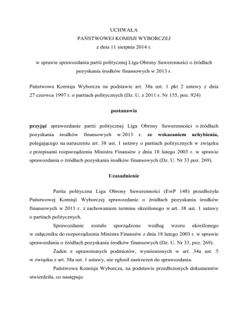 UCHWAŁA PAŃSTWOWEJ KOMISJI WYBORCZEJ z dnia 11 sierpnia 2014 r. w sprawie sprawozdania partii politycznej Liga Obrony Suwerenności o źródłach pozyskania środków finansowych w 2013 r. Państwowa Komisja Wyborcza na podstawie art. 38a ust. 1 pkt 2 ustawy z dnia 27 czerwca 1997 r. o partiach politycznych (Dz. U. z 2011 r. Nr 155, poz. 924) postanawia przyjąć sprawozdanie partii politycznej Liga Obrony Suwerenności o źródłach pozyskania środków finansowych w 2013 r. ze wskazaniem uchybienia, polegającego na naruszeniu art. 38 ust. 1 ustawy o partiach politycznych w związku z przepisami rozporządzenia Ministra Finansów z dnia 18 lutego 2003 r. w sprawie sprawozdania o źródłach pozyskania środków finansowych (Dz. U. Nr 33 poz. 269). Uzasadnienie Partia polityczna Liga Obrony Suwerenności (EwP 148) przedłożyła Państwowej Komisji Wyborczej sprawozdanie o źródłach pozyskania środków finansowych w 2013 r. z zachowaniem terminu określonego w art. 38 ust. 1 ustawy o partiach politycznych. Sprawozdanie zostało sporządzone według wzoru określonego w załączniku do rozporządzenia Ministra Finansów z dnia 18 lutego 2003 r. w sprawie sprawozdania o źródłach pozyskania środków finansowych (Dz. U. Nr 33, poz. 269). Żaden z uprawnionych podmiotów, wymienionych w art. 34a ust. 5 w związku z art. 38a ust. 1 ustawy, nie zgłosił zastrzeżeń do sprawozdania. Państwowa Komisja Wyborcza, na podstawie przedłożonych dokumentów stwierdziła, co następuje. —2— W sprawozdaniu o źródłach pozyskania środków finansowych partia polityczna Liga Obrony Suwerenności wykazała przychody w łącznej wysokości 17 099,79 zł. W ramach tych środków na rachunek bankowy Partii o nr 67 1500 1025 1210 2007 3488 0000, otwarty w Kredyt Banku S.A. I Oddzial w Gdańsku wpłacono kwotę 11 534,79 zł, która pochodziła ze składek członkowskich wpłaconych przez osoby fizyczne (4 273,00 zł), odsetek od środków zgromadzonych na rachunku bankowym (0,06 zł), z działalności własnej Partii, o której mowa w art. 27 ustawy o partiach politycznych (5 636,71 zł) a także z innych źródeł (1 625,02 zł). Z analizy zapisów historii rachunku bankowego Partii wynika, że przychody te pochodziły ze zwrotu przez II Urząd Skarbowy w Gdańsku środków nadpłaconego przez Partię podatku VAT. Ponadto Partia pozyskała do kasy środki finansowe w łącznej wysokości 5 565,00 zł. Środki te pochodziły ze składek członkowskich w wysokości nieprzekraczającej od jednego wpłacającego w 2013 r. minimalnego wynagrodzenia za pracę i zostały pozostawione w terenowych jednostkach organizacyjnych Partii – z przeznaczeniem na pokrycie wydatków związanych z bieżącą działalnością (art. 26a ustawy). Państwowa Komisja Wyborcza ustaliła, iż w okresie sprawozdawczym Partia posiadała stronę internetową lospolski.pl. Jak wynika z wyjaśnień, udzielonych przez Przewodniczącego Partii na zapytanie Państwowej Komisji Wyborczej, koszty prowadzenia tej strony internetowej (wykup domeny) w 2013 r. wyniosły 121,77 zł i zostały poniesione z prywatnych środków Przewodniczącego Partii. W konsekwencji na rzecz Partii została przekazana wartość niepieniężna w postaci nieodpłatnego udostępnienia Partii przez osobę fizyczną strony internetowej do korzystania. Wartość tejże usługi powinna zostać wykazana w pkt. III ppkt 4 sprawozdania i tym samym całkowite przychody/wpływy Partii w 2013 r. powinny zostać zwiększone o 121,77 zł i wykazane w wysokości 17 221,56 zł. Złożenie sprawozdania sporządzonego niezgodnie ze stanem faktycznym narusza ustawowy obowiązek sprawozdawczy, określony w art. 38 ust. 1 ustawy o partiach politycznych w związku z przepisami rozporządzenia Ministra Finansów —3— w sprawie sprawozdania o źródłach pozyskania środków finansowych. Zgodnie z art. 38a ustawy uchybienie to nie stanowi przesłanki do odrzucenia sprawozdania. Partia nie posiadała w 2013 r. Funduszu Wyborczego i nie uczestniczyła w przeprowadzonych w tym roku wyborach. Państwowa Komisja Wyborcza, po ustaleniu powyższego na podstawie sprawozdania finansowego Partii, dokumentów do niego załączonych oraz udzielonych przez Partię wyjaśnień, postanowiła jak w sentencji. Od niniejszego postanowienia nie przysługuje środek prawny. Przewodniczący Państwowej Komisji Wyborczej: Stefan J. Jaworski Zastępca Przewodniczącego Państwowej Komisji Wyborczej: Stanisław Kosmal Członkowie Państwowej Komisji Wyborczej: Bogusław Dauter, Maria Grzelka, Włodzimierz Ryms, Stanisław Zabłocki