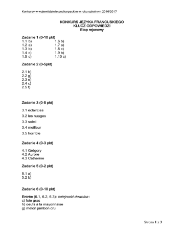 Konkursy w województwie podkarpackim w roku szkolnym 2016/2017 KONKURS JĘZYKA FRANCUSKIEGO KLUCZ ODPOWIEDZI Etap rejonowy Zadanie 1 (0-10 pkt) 1.1 b) 1.6 b) 1.2 a) 1.7 a) 1.3 b) 1.8 c) 1.4 c) 1.9 b) 1.5 c) 1.10 c) Zadanie 2 (0-5pkt) 2.1 b) 2.2 g) 2.3 e) 2.4 c) 2.5 f) Zadanie 3 (0-5 pkt) 3.1 éclaircies 3.2 les nuages 3.3 soleil 3.4 meilleur 3.5 horrible Zadanie 4 (0-3 pkt) 4.1 Grégory 4.2 Aurore 4.3 Catherine Zadanie 5 (0-2 pkt) 5.1 a) 5.2 b) Zadanie 6 (0-10 pkt) Entrée (6.1, 6.2, 6.3): kolejność dowolna : c) foie gras h) oeufs à la mayonnaise g) melon jambon cru Strona 1 z 3 Konkursy w województwie podkarpackim w roku szkolnym 2016/2017 Plat principal (6.4, 6.5, 6.6, 6.7) kolejność dowolna : j) poulet rôti m) soupe à l’oignon f) gratin de choux fleurs l) steak frites Dessert (6.8, 6.9) kolejność dowolna : o)crème brûlée b) mousse au chocolat Boisson sans alcool : d) eau plate Zadanie 7 (0-5 pkt) 7.1 Non 7.2 Oui 7.3 Oui 7.4 Non 7.5 Non Zadanie 8 (0-5 pkt) 8.1 c) 8.2 b) 8.3 c) 8.4 a) 8.5 a) Zadanie 9 (0-10 pkt) Je rêve de / d’ J’adore Je mange des légumes faire un tour du monde les escapades avec mes amis la cuisine exotique aller sur une autre planète les crevettes du pain partir au bout du monde de la viande du saucisson Strona 2 z 3 Konkursy w województwie podkarpackim w roku szkolnym 2016/2017 Zadanie 10 (0-5 pkt) W kryterium treści uczeń może otrzymać maksymalnie 3 pkt. W ocenie treści bierze się najpierw pod uwagę, do ilu elementów z polecenia zdający odniósł się, bądź odniósł się częściowo w swojej wypowiedzi, a następnie ile z tych elementów rozwinął w zadowalającym stopniu. Jako element rozwinięty w pracy należy uznać komunikatywną wypowiedź, która odnosi się do wszystkich trzech podpunktów treści polecenia, przy czym przynajmniej do jednego w sposób bardziej szczegółowy (3 pkt) Jako element, do którego zdający odniósł się w pracy, należy uznać komunikatywną wypowiedź, która odnosi się do 1 lub 2 podpunktów polecenia, przy czym przynajmniej do jednego w sposób bardziej szczegółowy (2 pkt) Jako element, do którego zdający odniósł się częściowo w pracy, należy uznać komunikatywną wypowiedź, która odnosi się do 1 podpunktu polecenia w sposób ogólny (1 pkt) Zdający nie odniósł się w pracy do elementu wówczas, kiedy nie realizuje podpunktu treści polecenia lub realizuje ten podpunkt w sposób całkowicie niekomunikatywny (0 pkt) II. Oceniany jest również zasób i umiejętność stosowania słownictwa oraz poprawność językowa. Za ten aspekt uczeń może otrzymać maksymalnie 2 p. Poprawność językowa 2 punkty, jeżeli w opisie zostały właściwie uzgodnione formy gramatyczne, leksykalne i ortograficzne i jeśli ilość błędów nie przekracza 15% liczby wszystkich wyrazów. 1 punkt, jeżeli liczba błędnie napisanych wyrazów (zawierających błędy gramatyczne, leksykalne lub ortograficzne) nie przekracza 25% liczby wszystkich wyrazów lub jeżeli wypowiedź jest niespójna. 0 punktów, jeżeli w wypowiedzi liczba błędnie napisanych wyrazów (zawierających błędy gramatyczne, leksykalne lub ortograficzne) przekracza 25% liczby wszystkich wyrazów lub jeżeli wypowiedź jest niezrozumiała (brak słów kluczowych, duża ilość błędów ortograficznych/gramatycznych, powodująca, że wypowiedź jest niekomunikatywna albo niejednoznaczna). Uwaga: Jeżeli praca nie zawiera wymaganej ilości słów jest oceniana wyłącznie w kryterium treści. W pozostałych kryteriach przyznaje się 0 punktów. Nie przyznaje się 05, punktu. Strona 3 z 3