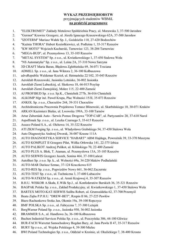 WYKAZ PRZEDSIĘBIORSTW przyjmujących studentów WBMiL na