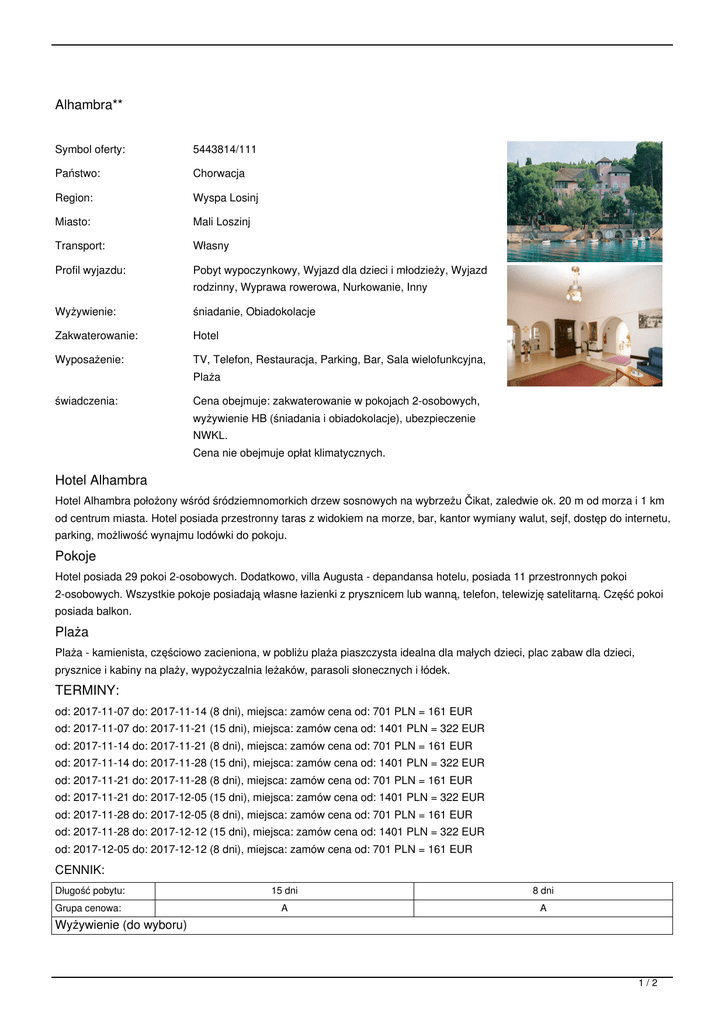 Alhambra** Symbol oferty: 5443814/111 Państwo: Chorwacja Region: Wyspa Losinj Miasto: Mali Loszinj Transport: Własny Profil wyjazdu: Pobyt wypoczynkowy, Wyjazd dla dzieci i młodzieży, Wyjazd Wyżywienie: śniadanie, Obiadokolacje Zakwaterowanie: Hotel Wyposażenie: TV, Telefon, Restauracja, Parking, Bar, Sala wielofunkcyjna, świadczenia: Cena obejmuje: zakwaterowanie w pokojach 2-osobowych, rodzinny, Wyprawa rowerowa, Nurkowanie, Inny Plaża wyżywienie HB (śniadania i obiadokolacje), ubezpieczenie NWKL. Cena nie obejmuje opłat klimatycznych. Hotel Alhambra Hotel Alhambra położony wśród śródziemnomorkich drzew sosnowych na wybrzeżu Čikat, zaledwie ok. 20 m od morza i 1 km od centrum miasta. Hotel posiada przestronny taras z widokiem na morze, bar, kantor wymiany walut, sejf, dostęp do internetu, parking, możliwość wynajmu lodówki do pokoju. Pokoje Hotel posiada 29 pokoi 2-osobowych. Dodatkowo, villa Augusta - depandansa hotelu, posiada 11 przestronnych pokoi 2-osobowych. Wszystkie pokoje posiadają własne łazienki z prysznicem lub wanną, telefon, telewizję satelitarną. Część pokoi posiada balkon. Plaża Plaża - kamienista, częściowo zacieniona, w pobliżu plaża piaszczysta idealna dla małych dzieci, plac zabaw dla dzieci, prysznice i kabiny na plaży, wypożyczalnia leżaków, parasoli słonecznych i łódek. TERMINY: od: 2017-11-07 do: 2017-11-14 (8 dni), miejsca: zamów cena od: 701 PLN = 161 EUR od: 2017-11-07 do: 2017-11-21 (15 dni), miejsca: zamów cena od: 1401 PLN = 322 EUR od: 2017-11-14 do: 2017-11-21 (8 dni), miejsca: zamów cena od: 701 PLN = 161 EUR od: 2017-11-14 do: 2017-11-28 (15 dni), miejsca: zamów cena od: 1401 PLN = 322 EUR od: 2017-11-21 do: 2017-11-28 (8 dni), miejsca: zamów cena od: 701 PLN = 161 EUR od: 2017-11-21 do: 2017-12-05 (15 dni), miejsca: zamów cena od: 1401 PLN = 322 EUR od: 2017-11-28 do: 2017-12-05 (8 dni), miejsca: zamów cena od: 701 PLN = 161 EUR od: 2017-11-28 do: 2017-12-12 (15 dni), miejsca: zamów cena od: 1401 PLN = 322 EUR od: 2017-12-05 do: 2017-12-12 (8 dni), miejsca: zamów cena od: 701 PLN = 161 EUR CENNIK: Długość pobytu: 15 dni 8 dni Grupa cenowa: A A Wyżywienie (do wyboru) 1/2 (*) śniadania i obiadokolacje Inne (opcjonalne) łóżeczko dla dziecka (0-2 lat) Pobyt w obiekcie (do wyboru) (-) (-) 56 28 pokój 2-osobowy + dostawka standardowo dla osób: 3 (-) (*) pokój 2-osobowy COMFORT+dostawka+dziecko 0-6 lat standardowo dla osób: 2 (-) pokój 1-osobowy 92 Inne (opcjonalne) pokój z widokiem na morze 14 7 30 15 (-) (-) -30 % -30 % -20 % -20 % -50 % -50 % -100 % -100 % 2.4 % 2.4 % 308 154 ubezpieczene NW KL windsurfing - sporty wodne dziecko 2-12 lat z jednym rodzicem w pokoju Dziecko 12-18 lat dziecko 2-12 lat jako 3 osoba - dostawka dziecko 0-2 lat bez świadczeń Ubezpieczenie (opcjonalne) ubezpieczenie - od kosztów rezygnacji Inne (obligatoryjne) (*) pakiet w/g świadczeń 46 21 Ubezpieczenie (do wyboru) Rodzaj osoby (do wyboru) (-) 42 (*) ubezpieczenie NW KL (*) osoba dorosła (-) Waluta: EUR Aktualne ceny z systemu S.A.R.T. (-) - cena usługi, podatku kalkulowana przy osobie lub gratis (*) - kwota wliczona w cenę standardową 2/2