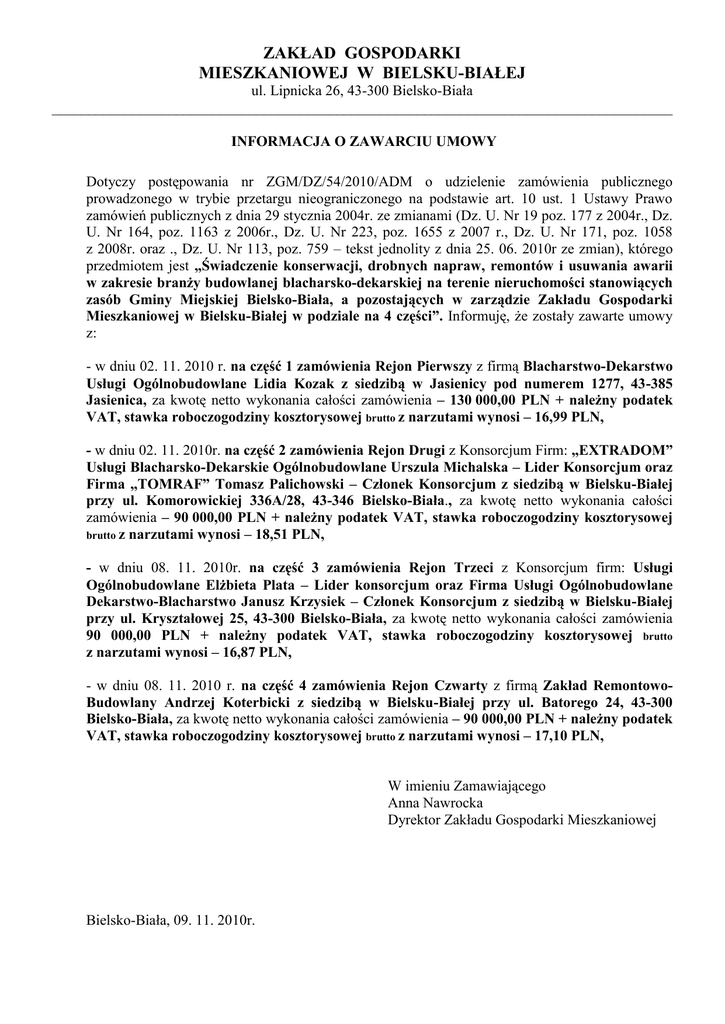 ZAKŁAD GOSPODARKI MIESZKANIOWEJ W BIELSKU-BIAŁEJ ul. Lipnicka 26, 43-300 Bielsko-Biała _____________________________________________________________________________________ INFORMACJA O ZAWARCIU UMOWY Dotyczy postępowania nr ZGM/DZ/54/2010/ADM o udzielenie zamówienia publicznego prowadzonego w trybie przetargu nieograniczonego na podstawie art. 10 ust. 1 Ustawy Prawo zamówień publicznych z dnia 29 stycznia 2004r. ze zmianami (Dz. U. Nr 19 poz. 177 z 2004r., Dz. U. Nr 164, poz. 1163 z 2006r., Dz. U. Nr 223, poz. 1655 z 2007 r., Dz. U. Nr 171, poz. 1058 z 2008r. oraz ., Dz. U. Nr 113, poz. 759 – tekst jednolity z dnia 25. 06. 2010r ze zmian), którego przedmiotem jest „Świadczenie konserwacji, drobnych napraw, remontów i usuwania awarii w zakresie branży budowlanej blacharsko-dekarskiej na terenie nieruchomości stanowiących zasób Gminy Miejskiej Bielsko-Biała, a pozostających w zarządzie Zakładu Gospodarki Mieszkaniowej w Bielsku-Białej w podziale na 4 części”. Informuję, że zostały zawarte umowy z: - w dniu 02. 11. 2010 r. na część 1 zamówienia Rejon Pierwszy z firmą Blacharstwo-Dekarstwo Usługi Ogólnobudowlane Lidia Kozak z siedzibą w Jasienicy pod numerem 1277, 43-385 Jasienica, za kwotę netto wykonania całości zamówienia – 130 000,00 PLN + należny podatek VAT, stawka roboczogodziny kosztorysowej brutto z narzutami wynosi – 16,99 PLN, - w dniu 02. 11. 2010r. na część 2 zamówienia Rejon Drugi z Konsorcjum Firm: „EXTRADOM” Usługi Blacharsko-Dekarskie Ogólnobudowlane Urszula Michalska – Lider Konsorcjum oraz Firma „TOMRAF” Tomasz Palichowski – Członek Konsorcjum z siedzibą w Bielsku-Białej przy ul. Komorowickiej 336A/28, 43-346 Bielsko-Biała., za kwotę netto wykonania całości zamówienia – 90 000,00 PLN + należny podatek VAT, stawka roboczogodziny kosztorysowej brutto z narzutami wynosi – 18,51 PLN, - w dniu 08. 11. 2010r. na część 3 zamówienia Rejon Trzeci z Konsorcjum firm: Usługi Ogólnobudowlane Elżbieta Plata – Lider konsorcjum oraz Firma Usługi Ogólnobudowlane Dekarstwo-Blacharstwo Janusz Krzysiek – Członek Konsorcjum z siedzibą w Bielsku-Białej przy ul. Kryształowej 25, 43-300 Bielsko-Biała, za kwotę netto wykonania całości zamówienia 90 000,00 PLN + należny podatek VAT, stawka roboczogodziny kosztorysowej brutto z narzutami wynosi – 16,87 PLN, - w dniu 08. 11. 2010 r. na część 4 zamówienia Rejon Czwarty z firmą Zakład RemontowoBudowlany Andrzej Koterbicki z siedzibą w Bielsku-Białej przy ul. Batorego 24, 43-300 Bielsko-Biała, za kwotę netto wykonania całości zamówienia – 90 000,00 PLN + należny podatek VAT, stawka roboczogodziny kosztorysowej brutto z narzutami wynosi – 17,10 PLN, W imieniu Zamawiającego Anna Nawrocka Dyrektor Zakładu Gospodarki Mieszkaniowej Bielsko-Biała, 09. 11. 2010r.
