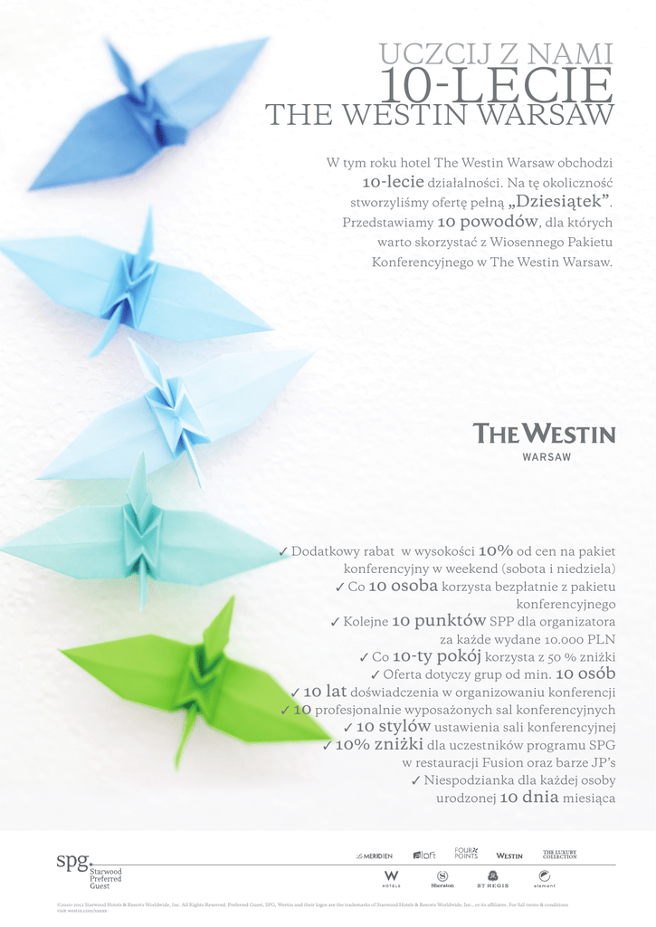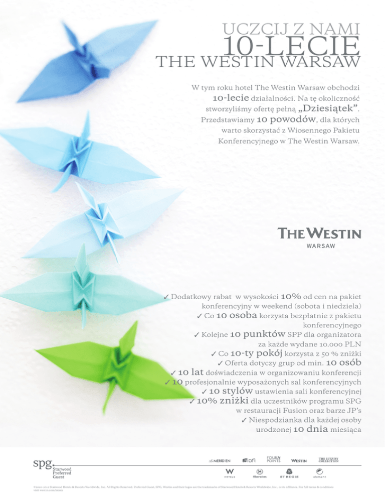 UCZCIJ Z NAMI 10-LECIE THE WESTIN WARSAW W tym roku hotel The Westin Warsaw obchodzi 10-lecie działalności. Na tę okoliczność stworzyliśmy ofertę pełną „Dziesiątek”. Przedstawiamy 10 powodów, dla których warto skorzystać z Wiosennego Pakietu Konferencyjnego w The Westin Warsaw. ✓ Dodatkowy rabat w wysokości 10% od cen na pakiet konferencyjny w weekend (sobota i niedziela) ✓ Co 10 osoba korzysta bezpłatnie z pakietu ✓ Kolejne 10 konferencyjnego punktów SPP dla organizatora ✓ Co 10-ty ✓ 10 za każde wydane 10.000 PLN pokój korzysta z 50 % zniżki ✓ Oferta dotyczy grup od min. 10 osób lat doświadczenia w organizowaniu konferencji ✓ 10 profesjonalnie wyposażonych sal konferencyjnych ✓ 10 stylów ustawienia sali konferencyjnej ✓ 10% zniżki dla uczestników programu SPG w restauracji Fusion oraz barze JP’s ✓ Niespodzianka dla każdej osoby urodzonej 10 dnia miesiąca ©2010–2012 Starwood Hotels & Resorts Worldwide, Inc. All Rights Reserved. Preferred Guest, SPG, Westin and their logos are the trademarks of Starwood Hotels & Resorts Worldwide, Inc., or its affiliates. For full terms & conditions visit westin.com/xxxxx