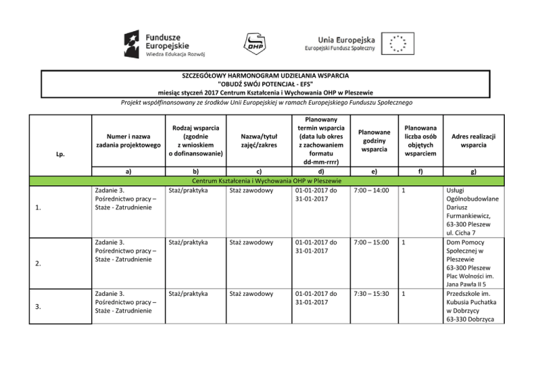 SZCZEGÓŁOWY HARMONOGRAM UDZIELANIA WSPARCIA "OBUDŹ SWÓJ POTENCJAŁ - EFS" miesiąc styczeń 2017 Centrum Kształcenia i Wychowania OHP w Pleszewie Projekt współfinansowany ze środków Unii Europejskiej w ramach Europejskiego Funduszu Społecznego Numer i nazwa zadania projektowego Lp. a) 1. 2. 3. Zadanie 3. Pośrednictwo pracy – Staże - Zatrudnienie Planowany termin wsparcia Nazwa/tytuł (data lub okres zajęć/zakres z zachowaniem formatu dd-mm-rrrr) b) c) d) Centrum Kształcenia i Wychowania OHP w Pleszewie Staż/praktyka Staż zawodowy 01-01-2017 do 31-01-2017 Rodzaj wsparcia (zgodnie z wnioskiem o dofinansowanie) Planowane godziny wsparcia Planowana liczba osób objętych wsparciem Adres realizacji wsparcia e) f) g) 7:00 – 14:00 :00 1 Zadanie 3. Pośrednictwo pracy – Staże - Zatrudnienie Staż/praktyka Staż zawodowy 01-01-2017 do 31-01-2017 7:00 – 15:00 1 Zadanie 3. Pośrednictwo pracy – Staże - Zatrudnienie Staż/praktyka Staż zawodowy 01-01-2017 do 31-01-2017 7:30 – 15:30 0 1 Usługi Ogólnobudowlane Dariusz Furmankiewicz, 63-300 Pleszew ul. Cicha 7 Dom Pomocy Społecznej w Pleszewie 63-300 Pleszew Plac Wolności im. Jana Pawła II 5 Przedszkole im. Kubusia Puchatka w Dobrzycy 63-330 Dobrzyca 4. 5. Zadanie 3. Pośrednictwo pracy – Staże - Zatrudnienie Staż/praktyka Staż zawodowy 01-01-2017 do 31-01-2017 7:30 – 15:30 0 1 Zadanie 3. Pośrednictwo pracy – Staże - Zatrudnienie Zadanie 3. Pośrednictwo pracy – Staże - Zatrudnienie Staż/praktyka Staż zawodowy 01-01-2017 do 31-01-2017 10:00 – 18:00 :00 1 Staż/praktyka Staż zawodowy 01-01-2017 do 31-01-2017 7:00 – 15:00 1 Zadanie 3. Pośrednictwo pracy – Staże - Zatrudnienie Staż/praktyka Staż zawodowy 01-01-2017 do 31-01-2017 9:00 – 17:00 :00 1 6. 7. ul. Szkolna 4 Przedszkole im. Kubusia Puchatka w Dobrzycy 63-330 Dobrzyca ul. Krotoszyńska 40 Pizzeria Castello 63-300 Pleszew ul. Poznańska 9 Usługi RemontowoBudowlane Radosław Kaźmierczak 63-300 Pleszew Kowalew, ul. Witosa 10 Katarzyna Sosnowska KWIACIARNIA TULIPAN 63-304 Czermin Czermin 15E