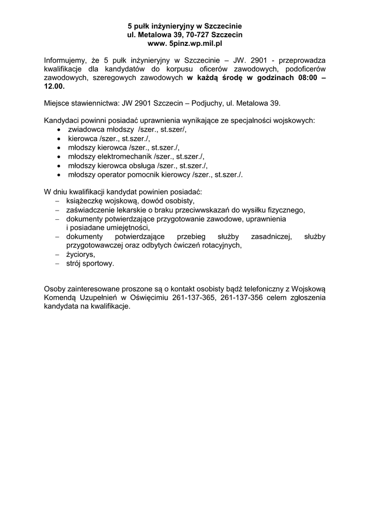 5 pułk inżynieryjny w Szczecinie ul. Metalowa 39, 70-727 Szczecin www. 5pinz.wp.mil.pl Informujemy, że 5 pułk inżynieryjny w Szczecinie – JW. 2901 - przeprowadza kwalifikacje dla kandydatów do korpusu oficerów zawodowych, podoficerów zawodowych, szeregowych zawodowych w każdą środę w godzinach 08:00 – 12.00. Miejsce stawiennictwa: JW 2901 Szczecin – Podjuchy, ul. Metalowa 39. Kandydaci powinni posiadać uprawnienia wynikające ze specjalności wojskowych: zwiadowca młodszy /szer., st.szer/, kierowca /szer., st.szer./, młodszy kierowca /szer., st.szer./, młodszy elektromechanik /szer., st.szer./, młodszy kierowca obsługa /szer., st.szer./, młodszy operator pomocnik kierowcy /szer., st.szer./. W dniu kwalifikacji kandydat powinien posiadać: książeczkę wojskową, dowód osobisty, zaświadczenie lekarskie o braku przeciwwskazań do wysiłku fizycznego, dokumenty potwierdzające przygotowanie zawodowe, uprawnienia i posiadane umiejętności, dokumenty potwierdzające przebieg służby zasadniczej, służby przygotowawczej oraz odbytych ćwiczeń rotacyjnych, życiorys, strój sportowy. Osoby zainteresowane proszone są o kontakt osobisty bądź telefoniczny z Wojskową Komendą Uzupełnień w Oświęcimiu 261-137-365, 261-137-356 celem zgłoszenia kandydata na kwalifikacje.