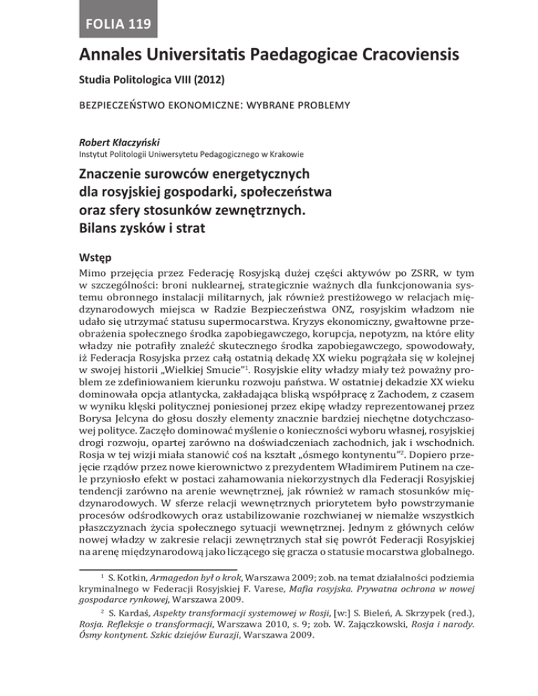 Folia 119 Annales Universitatis Paedagogicae Cracoviensis Studia Politologica VIII (2012) bezpieczeństwo ekonomiczne: wybrane problemy Robert Kłaczyński Instytut Politologii Uniwersytetu Pedagogicznego w Krakowie Znaczenie surowców energetycznych dla rosyjskiej gospodarki, społeczeństwa oraz sfery stosunków zewnętrznych. Bilans zysków i strat Wstęp Mimo przejęcia przez Federację Rosyjską dużej części aktywów po ZSRR, w tym w szczególności: broni nuklearnej, strategicznie ważnych dla funkcjonowania systemu obronnego instalacji militarnych, jak również prestiżowego w relacjach międzynarodowych miejsca w Radzie Bezpieczeństwa ONZ, rosyjskim władzom nie udało się utrzymać statusu supermocarstwa. Kryzys ekonomiczny, gwałtowne przeobrażenia społecznego środka zapobiegawczego, korupcja, nepotyzm, na które elity władzy nie potrafiły znaleźć skutecznego środka zapobiegawczego, spowodowały, iż Federacja Rosyjska przez całą ostatnią dekadę XX wieku pogrążała się w kolejnej w swojej historii „Wielkiej Smucie”1. Rosyjskie elity władzy miały też poważny problem ze zdefiniowaniem kierunku rozwoju państwa. W ostatniej dekadzie XX wieku dominowała opcja atlantycka, zakładająca bliską współpracę z Zachodem, z czasem w wyniku klęski politycznej poniesionej przez ekipę władzy reprezentowanej przez Borysa Jelcyna do głosu doszły elementy znacznie bardziej niechętne dotychczasowej polityce. Zaczęło dominować myślenie o konieczności wyboru własnej, rosyjskiej drogi rozwoju, opartej zarówno na doświadczeniach zachodnich, jak i wschodnich. Rosja w tej wizji miała stanowić coś na kształt „ósmego kontynentu”2. Dopiero przejęcie rządów przez nowe kierownictwo z prezydentem Władimirem Putinem na czele przyniosło efekt w postaci zahamowania niekorzystnych dla Federacji Rosyjskiej tendencji zarówno na arenie wewnętrznej, jak również w ramach stosunków międzynarodowych. W sferze relacji wewnętrznych priorytetem było powstrzymanie procesów odśrodkowych oraz ustabilizowanie rozchwianej w niemalże wszystkich płaszczyznach życia społecznego sytuacji wewnętrznej. Jednym z głównych celów nowej władzy w zakresie relacji zewnętrznych stał się powrót Federacji Rosyjskiej na arenę międzynarodową jako liczącego się gracza o statusie mocarstwa globalnego. 1 S. Kotkin, Armagedon był o krok, Warszawa 2009; zob. na temat działalności podziemia kryminalnego w Federacji Rosyjskiej F. Varese, Mafia rosyjska. Prywatna ochrona w nowej gospodarce rynkowej, Warszawa 2009. S. Kardaś, Aspekty transformacji systemowej w Rosji, [w:] S. Bieleń, A. Skrzypek (red.), Rosja. Refleksje o transformacji, Warszawa 2010, s. 9; zob. W. Zajączkowski, Rosja i narody. Ósmy kontynent. Szkic dziejów Eurazji, Warszawa 2009. 2 [102] Robert Kłaczyński Niewiele jednak narzędzi mogących się przyczynić do realizacji śmiałych, biorąc pod uwagę położenie Federacji Rosyjskiej u progu XXI wieku, planów posiadały rosyjskie władze. Poza pewnymi możliwościami w sferze militarnej ograniczającymi się jednak do potężnego arsenału nuklearnego zarówno siła ekonomiczna państwa, jak również jego atrakcyjność kulturowa nie mogły stanowić na tyle poważnych atutów, aby ponownie zabiegać o uzyskanie pozycji supermocarstwa. W zasadzie jedynym instrumentem dającym możliwość budowy pozycji państwa w relacjach międzynarodowych okazały się surowce strategiczne, w tym te o największym potencjale polityczno-ekonomicznym: ropa naftowa oraz gaz ziemny. Korzystając z koniunktury globalnej napędzającej produkcję czy też handel „błękitnym paliwem” oraz „czarnym złotem”, Federacja Rosyjska zaczęła z większym rozmachem, a przede wszystkim z większą skutecznością kształtować zarówno wewnętrzną, jak i zewnętrzną sferę stosunków państwowych. Wzrostowi rosyjskiego PKB towarzyszyła poprawa sytuacji ekonomicznej relatywnie szerokich warstw rosyjskiego społeczeństwa. W polityce zewnętrznej rosyjski gaz ziemny oraz ropa naftowa zaczęły odgrywać rolę ambasadora, otwierającego drogę na polityczne, a także gospodarcze salony Starego Kontynentu. Posiadanie w swojej ofercie eksportowej strategicznie ważnych dla rozwoju gospodarczego surowców energetycznych pozwoliło również umocnić, a z czasem rozszerzyć wpływy na kontynencie azjatyckim. „Błękitne paliwo” oraz „czarne złoto” okazały się jednak nie tylko atutem, ale również potencjalnym zagrożeniem dla rosyjskiego sytemu ekonomicznego. Funkcjonowanie tego ostatniego coraz bardziej było uzależnione od koniunktury na surowce energetyczne. Począwszy od lat 90. XX wieku, struktura gospodarcza Federacji Rosyjskiej zaczęła się cechować wyraźniejszą nawet niż w czasach radzieckich monokulturowością. System ekonomiczny państwa stał się zakładnikiem zagranicznego popytu na ropę naftową i gaz ziemny. Trudno było się oprzeć wrażeniu, iż Rosję powoli zaczyna drążyć „choroba holenderska”. Napływ środków finansowych, będących pochodną wzrostu produkcji ropy naftowej i gazu ziemnego, co przynajmniej w początkowym okresie nie wymagało większych inwestycji w sektor odpowiedzialny za wydobycie surowców energetycznych, spowodował, iż gospodarka rosyjska w dużym stopniu mająca swój rodowód w czasach sowieckich nie została poddana koniecznemu procesowi restrukturyzacji. Państwo nie musiało się troszczyć o bilans budżetu federalnego, ponieważ przez większą część pierwszej dekady XXI wieku wykazywał on znaczącą nadwyżkę dochodów nad wydatkami państwa3. Rosyjski system ekonomiczny utknął w specyficznej „gospodarczej hibernacji”. Dopiero kryzys finansowy w pełni uświadomił elitom władzy, iż zmiany są konieczne. Spadek cen za surowce energetyczne na światowym rynku paliw spowodował zmniejszenie napływu środków finansowych do budżetu federalnego. W sposób wyraźny odbi