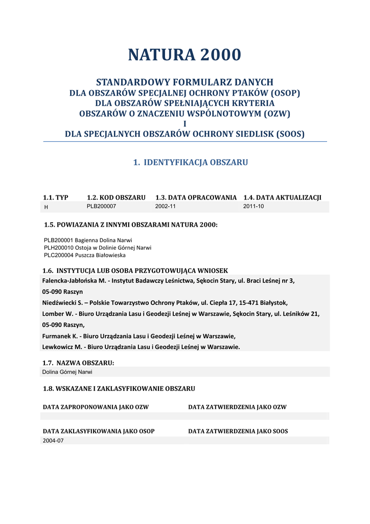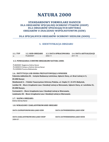NATURA 2000 STANDARDOWY FORMULARZ DANYCH DLA OBSZARÓW SPECJALNEJ OCHRONY PTAKÓW (OSOP) DLA OBSZARÓW SPEŁNIAJĄCYCH KRYTERIA OBSZARÓW O ZNACZENIU WSPÓLNOTOWYM (OZW) I DLA SPECJALNYCH OBSZARÓW OCHRONY SIEDLISK (SOOS) 1. IDENTYFIKACJA OBSZARU 1.1. TYP 1.2. KOD OBSZARU 1.3. DATA OPRACOWANIA 1.4. DATA AKTUALIZACJI H PLB200007 2002-11 2011-10 1.5. POWIAZANIA Z INNYMI OBSZARAMI NATURA 2000: PLB200001 Bagienna Dolina Narwi PLH200010 Ostoja w Dolinie Górnej Narwi PLC200004 Puszcza Białowieska 1.6. INSTYTUCJA LUB OSOBA PRZYGOTOWUJĄCA WNIOSEK Falencka-Jabłońska M. - Instytut Badawczy Leśnictwa, Sękocin Stary, ul. Braci Leśnej nr 3, 05-090 Raszyn Niedźwiecki S. – Polskie Towarzystwo Ochrony Ptaków, ul. Ciepła 17, 15-471 Białystok, Lomber W. - Biuro Urządzania Lasu i Geodezji Leśnej w Warszawie, Sękocin Stary, ul. Leśników 21, 05-090 Raszyn, Furmanek K. - Biuro Urządzania Lasu i Geodezji Leśnej w Warszawie, Lewkowicz M. - Biuro Urządzania Lasu i Geodezji Leśnej w Warszawie. 1.7. NAZWA OBSZARU: Dolina Górnej Narwi 1.8. WSKAZANE I ZAKLASYFIKOWANIE OBSZARU DATA ZAPROPONOWANIA JAKO OZW DATA ZATWIERDZENIA JAKO OZW DATA ZAKLASYFIKOWANIA JAKO OSOP 2004-07 DATA ZATWIERDZENIA JAKO SOOS 2. POŁOŻENIE OBSZARU 2.1. POŁOŻENIE CENTRALNEGO PUNKTU OBSZARU DŁUGOŚĆ GEOGRAFICZNA SZEROKOŚĆ GEOGRAFICZNA E 23 18 44 N 52 53 9 2.2. POWIERZCHNIA (ha) 2.3. DŁUGOŚĆ OBSZARU (km) 18 384,1 2.4. WYSOKOŚĆ (m) MINIMALNA MAKSYMALNA ŚREDNIA Źródło: DEM (Numeryczny model terenu) zbudowany na podstawie wektoryzacji map topograficznych 1:10 000, warstwica co 1,25 m. 2.5. REGION ADMINISTRACYJNY (NUTS, POZIOM 3) KOD NAZWA % POKRYCIA PL343 PL344 Białostocki ŁomŜyński 38 62 2.6. REGION BIOGEOGRAFICZNY ANATOLIJSKI MAKARONEZYJSKI ALPEJSKI ARKTYCZNY ŚRÓDZIEMNOMORSKI ATLANTYCKI PANNOŃSKI BOREALNY CZARNOMORSKI KONTYNENTALNY STEPOWY 3. INFORMACJA PRZYRODNICZA 3.1. Typy SIEDLISK znajdujące się na terenie obszaru Natura 2000 oraz ocena znaczenia obszaru dla tych siedlisk Typy SIEDLISK wymienione w Załączniku I 3.2 GATUNKI objęte artykułem 4 of Dyrektywy 79/409/EWG oraz wymienione w Załączniku II Dyrektywy 92/43/EWG oraz ocena znaczenia obszaru dla tych gatunków 3.2.a. PTAKI wymienione w Załączniku I Dyrektywy Rady 79/409/EWG Kod Nazwa Osiadła POPULACJA Migrująca Lęgowa Zimująca OCENA ZNACZENIA OBSZARU Populacja Migrująca A021 Botaurus stellaris 2-49 C A022 Ixobrychus minutus 0-1 D 1 D A031 Ciconia ciconia 112-123 A038 Cygnus cygnus A072 Pernis apivorus St. zach. Izolacja Ogólnie B C C C B C B 2-3 B B B B 4-6,5 D A075 Haliaeetus albicilla 1 D A081 Circus aeruginosus 41-66 C B C C A084 Circus pygargus 5-47 C B C C A089 Aquila pomarina 7 C B C C 2-7 C C B C A119 Porzana porzana 3-323 B B C B A120 Porzana parva 32-42 B B C B A122 Crex crex 651-1009 B B C B A127 Grus grus 34-36 D A154 Gallinago media 62-94 B B B B A193 Sterna hirundo 0-29 C C C C A195 Sternula albifrons 1 D A196 Chlidonias hybrida 0-5 D A197 Chlidonias niger 0-60 C C C C A215 Bubo bubo 2-3 C B C C A229 Alcedo atthis 3-4 D A234 Picus canus 1 D A236 Dryocopus martius >15-26 D A238 Dendrocopos medius >7-41 D A030 Ciconia nigra A106 Tetrao tetrix A246 Lullula arborea 94-172 D A255 Anthus campestris >7-22 D A272 Luscinia svecica 5-23 C C B C A294 Acrocephalus paludicola 26-28 C B B C A307 Sylvia nisoria 42-150 D A320 Ficedula parva 1 D A338 Lanius collurio 391-891 C A C B 36-40 D A104 Bonasia bonasia 0-8 D A224 Caprimulgus europaeus 9-12 D A239 Dendrocopos leucotos 2-5 C C C C A379 Emberiza hortulana 3.2.b. Regularnie występujące PTAKI MIGRUJĄCE nie wymienione w Załączniku I Dyrektywy Rady 79/409/EWG Kod Osiadła Nazwa POPULACJA Migrująca Lęgowa Zimująca OCENA ZNACZENIA OBSZARU Migrująca Populacja St. zach. Izolacja Ogólnie A006 Podiceps grisegena 0-3 D A055 Anas querquedula 90-100 B C C C A118 Rallus aquaticus 35-100 C B C C A156 Limosa limosa 73 C B C C A164 Tringa totanus 44-45 C B C C A198 Chlidonias leucopterus 0-1145 A B B B 3.2.c. SSAKI wymienione w Załączniku II Dyrektywy Rady 92/43/EWG 3.2.d. PŁAZY I GADY wymienione w Załączniku II Dyrektywy Rady 92/43/EWG 3.2.e. RYBY wymienione w Załączniku II Dyrektywy Rady 92/43/EWG 3.2.f. BEZKRĘGOWCE wymienione w Załączniku II Dyrektywy Rady 92/43/EWG POPULACJA OCENA ZNACZENIA OBSZARU Kod Nazwa Osiadła Przebywająca okresowo Populacja St. zach. Izolacja Ogólnie Lęgowa Zimująca Migrująca 1032 Unio crassus P D 3.2.g. ROŚLINY wymienione w Załączniku II Dyrektywy Rady 92/43/EWG 3.3 Pozostałe ważne gatunki roślin i zwierząt B M A GRUPA R F I P NAZWA NAUKOWA (B=ptaki, M=ssaki, A=płazy, R=gady, F=ryby, I=bezkręgowce, P=rośliny) POPULACJA MOTYWACJA 4. OPIS OBSZARU 4.1. OGÓLNA CHARAKTERYSTYKA OBSZARU Dodatkowa charakterystyka obszaru Klasy siedlisk Lasy iglaste Lasy liściaste Lasy mieszane Siedliska leśne (ogólnie) Siedliska łąkowe i zaroślowe (ogólnie) Siedliska rolnicze (ogólnie) Wody śródlądowe Suma pokrycia siedlisk % pokrycia 14 % 4% 2% 1% 58 % 20% 1% 100,00 % Opis obszaru Dolina Górnej Narwi położona jest na terenie prowincji Niżu Wschodniobałtycko- Białoruskiego, podprowincji Wysoczyzny Podlasko-Białoruskiej, w makroregionie Niziny Północnopodlaskiej i mezoregionie Doliny Górnej Narwi. Według podziału geobotanicznego zgodnie z klasyfikacją Matuszkiewicza teren ten należy do IV Krainy Mazowiecko-Podlaskiej. Obszar Natura 2000 PLB200007 Dolina Górnej Narwi obejmuje powierzchnię 18 384,10 ha i należy do najlepiej zachowanych w Polsce dolin rzecznych, a jednocześnie jest jednym z największych obszarów mokradeł środkowoeuropejskich. Obejmuje teren doliny od zapory wodnej w Bondarach do Suraża, wraz z przylegającym do niego kompleksem stawowym zasilanym z Lizy (dopływu Narwi). Na tym obszarze koryto Narwi ma naturalny charakter z meandrami oraz starorzeczami. Szerokość doliny na tym terenie wynosi 0,3-3,0 km. Dolina Górnej Narwi powstała w czwartorzędzie. Jej dno jest charakterystycznie zabagnione i wysłane