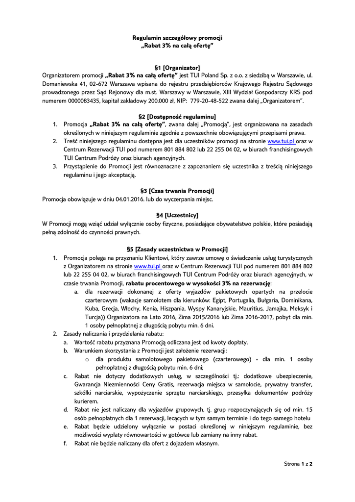 Regulamin szczegółowy promocji „Rabat 3% na całą ofertę” §1 [Organizator] Organizatorem promocji „Rabat 3% na całą ofertę” jest TUI Poland Sp. z o.o. z siedzibą w Warszawie, ul. Domaniewska 41, 02-672 Warszawa wpisana do rejestru przedsiębiorców Krajowego Rejestru Sądowego prowadzonego przez Sąd Rejonowy dla m.st. Warszawy w Warszawie, XIII Wydział Gospodarczy KRS pod numerem 0000083435, kapitał zakładowy 200.000 zł, NIP: 779-20-48-522 zwana dalej „Organizatorem”. §2 [Dostępność regulaminu] 1. Promocja „Rabat 3% na całą ofertę”, zwana dalej „Promocją”, jest organizowana na zasadach określonych w niniejszym regulaminie zgodnie z powszechnie obowiązującymi przepisami prawa. 2. Treść niniejszego regulaminu dostępna jest dla uczestników promocji na stronie www.tui.pl oraz w Centrum Rezerwacji TUI pod numerem 801 884 802 lub 22 255 04 02, w biurach franchisingowych TUI Centrum Podróży oraz biurach agencyjnych. 3. Przystąpienie do Promocji jest równoznaczne z zapoznaniem się uczestnika z treścią niniejszego regulaminu i jego akceptacją. §3 [Czas trwania Promocji] Promocja obowiązuje w dniu 04.01.2016. lub do wyczerpania miejsc. §4 [Uczestnicy] W Promocji mogą wziąć udział wyłącznie osoby fizyczne, posiadające obywatelstwo polskie, które posiadają pełną zdolność do czynności prawnych. §5 [Zasady uczestnictwa w Promocji] 1. Promocja polega na przyznaniu Klientowi, który zawrze umowę o świadczenie usług turystycznych z Organizatorem na stronie www.tui.pl oraz w Centrum Rezerwacji TUI pod numerem 801 884 802 lub 22 255 04 02, w biurach franchisingowych TUI Centrum Podróży oraz biurach agencyjnych, w czasie trwania Promocji, rabatu procentowego w wysokości 3% na rezerwację: a. dla rezerwacji dokonanej z oferty wyjazdów pakietowych opartych na przelocie czarterowym (wakacje samolotem dla kierunków: Egipt, Portugalia, Bułgaria, Dominikana, Kuba, Grecja, Włochy, Kenia, Hiszpania, Wyspy Kanaryjskie, Mauritius, Jamajka, Meksyk i Turcja)) Organizatora na Lato 2016, Zima 2015/2016 lub Zima 2016-2017, pobyt dla min. 1 osoby pełnopłatnej z długością pobytu min. 6 dni. 2. Zasady naliczania i przydzielania rabatu: a. Wartość rabatu przyznana Promocją odliczana jest od kwoty dopłaty. b. Warunkiem skorzystania z Promocji jest założenie rezerwacji: o dla produktu samolotowego pakietowego (czarterowego) - dla min. 1 osoby pełnopłatnej z długością pobytu min. 6 dni; c. Rabat nie dotyczy dodatkowych usług, w szczególności tj.: dodatkowe ubezpieczenie, Gwarancja Niezmienności Ceny Gratis, rezerwacja miejsca w samolocie, prywatny transfer, szkółki narciarskie, wypożyczenie sprzętu narciarskiego, przesyłka dokumentów podróży kurierem. d. Rabat nie jest naliczany dla wyjazdów grupowych, tj. grup rozpoczynających się od min. 15 osób pełnopłatnych dla 1 rezerwacji, lecących w tym samym terminie i do tego samego hotelu e. Rabat będzie udzielony wyłącznie w postaci określonej w niniejszym regulaminie, bez możliwości wypłaty równowartości w gotówce lub zamiany na inny rabat. f. Rabat nie będzie naliczany dla ofert z dojazdem własnym. Strona 1 z 2 3. Promocja łączy się z promocją „Najtaniej w First Minute® - Lato 2016 – III etap”, Rabat 300 zł dla 300 pierwszych rezerwacji, „Egzotyka Zima 2016/17 Przedsprzedaż”. 4. Promocja nie łączy się z promocją „7% rabat First Minute® - Wakacje Samochodem Lato 2016– III etap”, „Rabat 3% na narty” 5. Uczestnictwo w Promocji jest dobrowolne. §6 [Skutki zmiany rezerwacji] 1. W przypadku rezygnacji z imprezy turystycznej przez uczestnika Promocji, zastosowanie mają postanowienia umowy o świadczenie usług turystycznych oraz Warunki Imprez Turystycznych Organizatora. 2. W przypadku rozwiązania umowy o świadczenie usług turystycznych z przyczyn leżących po stronie Organizatora uczestnicy nabywają prawo do zachowania korzyści wynikających z Promocji, ale zgodnych z postanowieniami niniejszego regulaminu. Rabat jest naliczany od cen podstawowych dostępnych dla klienta na www.tui.pl przy alternatywnej propozycji zaproponowanej przez Organizatora. 3. W przypadku zmian rezerwacji dokonywanych przez uczestnika Promocji zastosowanie mają postanowienia umowy o świadczenie usług turystycznych oraz Warunki Imprez Turystycznych Organizatora. Przyznany Klientowi rabat na podstawie niniejszego regulaminu w momencie zawarcia umowy o świadczenie usług turystycznych jest stały i obliczany jest od wartości rezerwacji po zmianach. §7 [Reklamacje] 1. Wszystkie roszczenia, reklamacje, uwagi i zastrzeżenia do przebiegu Promocji można składać wyłącznie pisemnie na adres Organizatora: ul. Domaniewska 41, 02-672 Warszawa przez cały czas trwania Promocji, nie później jednak niż w terminie 14 dni od dnia zakończenia Promocji (o rozpatrzeniu reklamacji decyduje data stempla pocztowego). 2. Reklamacja powinna zawierać: imię, nazwisko, adres, jak również dokładny opis i powód reklamacji. 3. Reklamacje złożone po upływie terminu, o którym mowa w ust. 1 powyżej nie będą rozpatrywane. 4. Reklamacje Organizator rozpatruje w terminie 14 dni od dnia ich otrzymania. Reklamacje będą rozpatrywane w oparciu o postanowienia niniejszego regulaminu. Uczestnik zostanie poinformowany o decyzji Organizatora na adres wskazany w reklamacji. 1. 2. 3. 4. §8 [Postanowienia końcowe] Administratorem danych osobowych jest Organizator. Organizator informuje uczestników, że ich dane osobowe będą przetwarzane wyłącznie w związku z wykonaniem postanowień niniejszego regulaminu, w celu przeprowadzenia Promocji. Uczestnicy mają prawo dostępu do treści swoich danych osobowych oraz do ich poprawiania. Podanie danych osobowych w celu realizacji Promocji jest dobrowolne, choć niezbędne dla prawidłowego przeprowadzenia Promocji. Niniejszy regulamin wchodzi w życie z dniem 04.01.2016 r. Strona 2 z 2