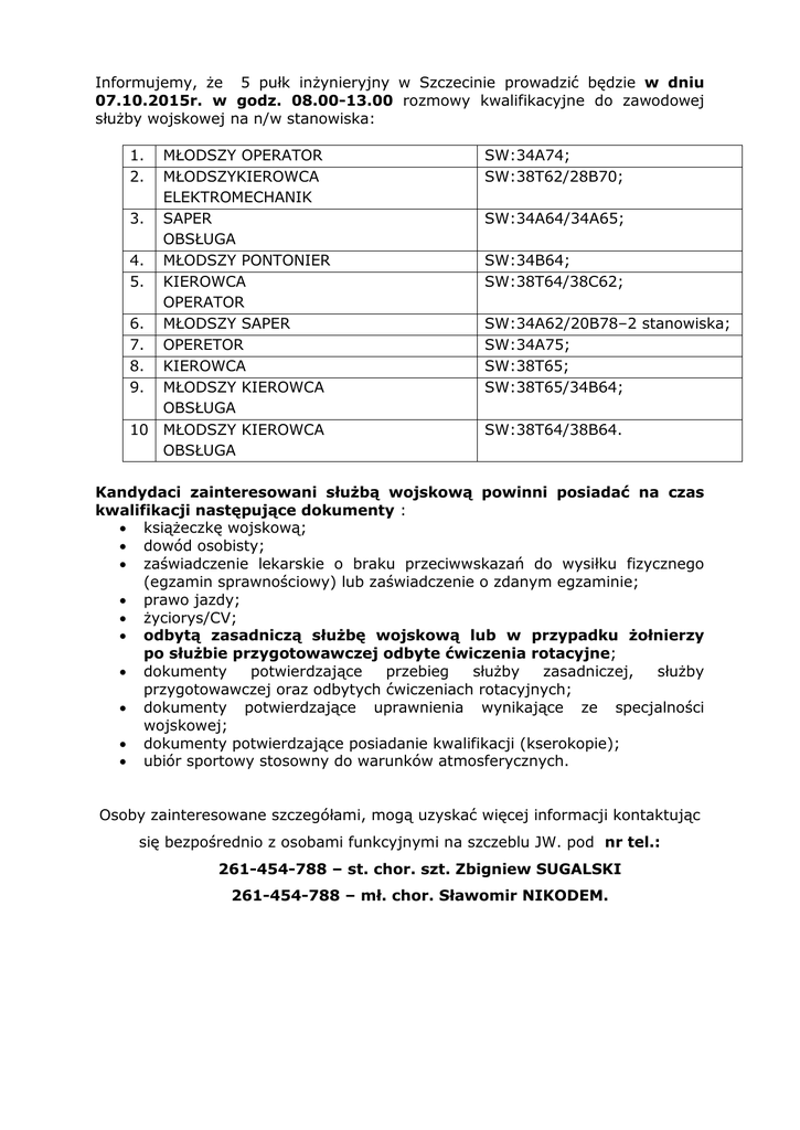 Informujemy, że 5 pułk inżynieryjny w Szczecinie prowadzić będzie w dniu 07.10.2015r. w godz. 08.00-13.00 rozmowy kwalifikacyjne do zawodowej służby wojskowej na n/w stanowiska: 1. 2. MŁODSZY OPERATOR MŁODSZYKIEROWCA ELEKTROMECHANIK 3. SAPER OBSŁUGA 4. MŁODSZY PONTONIER 5. KIEROWCA OPERATOR 6. MŁODSZY SAPER 7. OPERETOR 8. KIEROWCA 9. MŁODSZY KIEROWCA OBSŁUGA 10 MŁODSZY KIEROWCA OBSŁUGA SW:34A74; SW:38T62/28B70; SW:34A64/34A65; SW:34B64; SW:38T64/38C62; SW:34A62/20B78–2 stanowiska; SW:34A75; SW:38T65; SW:38T65/34B64; SW:38T64/38B64. Kandydaci zainteresowani służbą wojskową powinni posiadać na czas kwalifikacji następujące dokumenty : książeczkę wojskową; dowód osobisty; zaświadczenie lekarskie o braku przeciwwskazań do wysiłku fizycznego (egzamin sprawnościowy) lub zaświadczenie o zdanym egzaminie; prawo jazdy; życiorys/CV; odbytą zasadniczą służbę wojskową lub w przypadku żołnierzy po służbie przygotowawczej odbyte ćwiczenia rotacyjne; dokumenty potwierdzające przebieg służby zasadniczej, służby przygotowawczej oraz odbytych ćwiczeniach rotacyjnych; dokumenty potwierdzające uprawnienia wynikające ze specjalności wojskowej; dokumenty potwierdzające posiadanie kwalifikacji (kserokopie); ubiór sportowy stosowny do warunków atmosferycznych. Osoby zainteresowane szczegółami, mogą uzyskać więcej informacji kontaktując się bezpośrednio z osobami funkcyjnymi na szczeblu JW. pod nr tel.: 261-454-788 – st. chor. szt. Zbigniew SUGALSKI 261-454-788 – mł. chor. Sławomir NIKODEM.