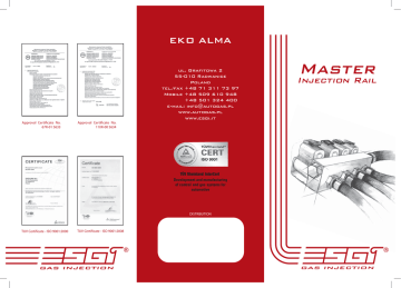 EKO ALMA ul. Grafitowa 2 55-010 Radwanice Poland tel./fax +48 71 311 73 97 Mobile +48 509 610 948 +48 501 324 400 e-mail: [email protected] www.autogas.pl www.esgi.it Approval Certificate No. 67R-01 5633 Approval Certificate No. 110R-00 5634 DISTRIBUTION TUV Certificate - ISO 9001:2000 TUV Certificate - ISO 9001:2008 Master Injection Rail Gas injectors are the most important performing appliances in every injection system of gas phase of LPG. High quality and parameters of injectors have a direct influence on internal-combustion engine’s work and performance which has an immediate influence on the comfort of drive and gas consumption. We would like to present the newest MASTER injectors which are the combination of quality and perfect parameters with a very reasonable price. New MASTER injectors are great alternative for present products on market. These injectors are characterized with high precision and high speed of work which allow to be installed in requiring engines of cars fulfilling norms of fumes emission EURO-4 and EURO-5. The feature which distinguish MASTER injectors from the competitive products is stable work and steady efficiency of individual sections in full range of engine’s rational speed at different power pressure (from 0,5 to 3,0 bar). Every injector is individually tested and calibrated by means of flow method which guarantees high calibration precision. MASTER injector’s construction guarantees larger, in comparison about another products, gas expenditure and the materials which were used minimize the influence of gas temperature on their efficiency. The precision of rendition and high quality components provide failure-free work during a long period of exploitation (runs with the range of 130 000 – 170 000 km). A very important feature of injectors is a full possibility of cleaning and regeneration of individual sections, providing long life even when the car is powered by a low quality of gas. MASTER injectors are intended for engines having power from 20 to 50 kW on a cylinder which allow to be used in units with motive power even up to 400 kW. Wtryskiwacze gazowe są najważniejszym urządzeniem wykonawczym w każdej instalacji wtrysku fazy lotnej gazu LPG. Wysoka jakość i parametry wtryskiwaczy mają bezpośredni wpływ na pracę i osiągi silnika spalinowego przekładając się bezpośrednio na komfort jazdy oraz zużycie gazu. Przedstawiamy Państwu nowoczesne wtryskiwacze MASTER będące połączeniem jakości i doskonałych parametrów z bardzo korzystną ceną. Nowe wtryskiwacze MASTER są świetną alternatywą dla produktów obecnych na rynku. Wtryskiwacze charakteryzują się dużą precyzją oraz szybkością działania pozwalającą na zastosowanie w wymagających silnikach samochodów spełniających normę emisji spalin EURO-4 i EURO-5. Cechą wyróżniającą wtryskiwacze MASTER na tle wyrobów konkurencyjnych jest bardzo stabilna praca i równomierna wydajność poszczególnych sekcji w pełnym zakresie obrotów silnika przy różnych ciśnieniach zasilających (od 0,5 do 3,0 bar). Każdy wtryskiwacz jest indywidualnie testowany i kalibrowany metodą przepływową, zapewniającą wysoką dokładność kalibracji. Konstrukcja wtryskiwaczy MASTER gwarantuje większy, w porównaniu z innymi wyrobami wydatek gazu, a zastosowane materiały minimalizują wpływ temperatury gazu na ich wydajność. Precyzja wykonania oraz komponenty najwyższej jakości, zapewniają bezawaryjną pracę w długim okresie eksploatacji (przebiegi, rzędu 130 000 – 170 000 km) Ważną cechą wtryskiwaczy jest pełna możliwość czyszczenia oraz regeneracji poszczególnych sekcji, zapewniając tym samym długą żywotność nawet przy zasilaniu gazem niskiej jakości. Wtryskiwacze MASTER są przeznaczone do silników o mocach od 20 do 50 kW na cylinder, co pozwala na zastosowanie w jednostkach napędowych o mocach nawet do 400 kW. Operating pressure range 0,5 ÷3,0 Bar Operating temperature range -20 ÷120 oC Operating response time <2,5 ms ±0,2 ms (1 Bar) Closing response time <2,0 ms ±0,2 ms (1 Bar) Maximum operating frequency 200 Hz Product life expectancy >130 000 km Ciśnienie pracy 0,5 ÷3,0 Bar Temperatura pracy -20 ÷120 oC Czas pełnego otwarcia <2,5 ms ±0,2 ms (1 Bar) Czas pełnego zamknięcia <2,0 ms ±0,2 ms (1 Bar) Maksymalna częstotliwość pracy 200 Hz Żywotność >130 000 km