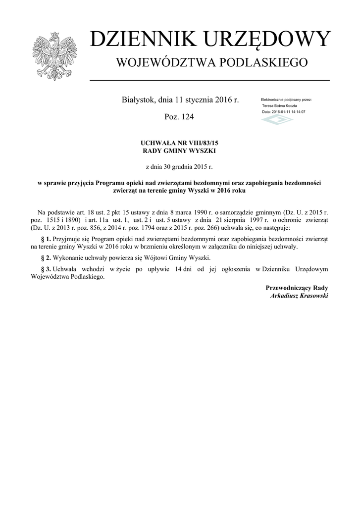 DZIENNIK URZĘDOWY WOJEWÓDZTWA PODLASKIEGO Białystok, dnia 11 stycznia 2016 r. Elektronicznie podpisany przez: Teresa Bożena Koczta Poz. 124 Data: 2016-01-11 14:14:07 UCHWAŁA NR VIII/83/15 RADY GMINY WYSZKI z dnia 30 grudnia 2015 r. w sprawie przyjęcia Programu opieki nad zwierzętami bezdomnymi oraz zapobiegania bezdomności zwierząt na terenie gminy Wyszki w 2016 roku Na podstawie art. 18 ust. 2 pkt 15 ustawy z dnia 8 marca 1990 r. o samorządzie gminnym (Dz. U. z 2015 r. poz. 1515 i 1890) i art. 11a ust. 1, ust. 2 i ust. 5 ustawy z dnia 21 sierpnia 1997 r. o ochronie zwierząt (Dz. U. z 2013 r. poz. 856, z 2014 r. poz. 1794 oraz z 2015 r. poz. 266) uchwala się, co następuje: § 1. Przyjmuje się Program opieki nad zwierzętami bezdomnymi oraz zapobiegania bezdomności zwierząt na terenie gminy Wyszki w 2016 roku w brzmieniu określonym w załączniku do niniejszej uchwały. § 2. Wykonanie uchwały powierza się Wójtowi Gminy Wyszki. § 3. Uchwała wchodzi w życie po upływie 14 dni od jej ogłoszenia w Dzienniku Urzędowym Województwa Podlaskiego. Przewodniczący Rady Arkadiusz Krasowski Dziennik Urzędowy Województwa Podlaskiego –2– Poz. 124 Załącznik do uchwały nr VIII/83/15 Rady Gminy Wyszki z dnia 30 grudnia 2015 r. PROGRAM OPIEKI NAD ZWIERZĘTAMI BEZDOMNYMI ORAZ ZAPOBIEGANIA BEZDOMNOŚCI ZWIERZĄT NA TERENIE GMINY WYSZKI W 2016 ROKU Rozdział 1 POSTANOWIENIA OGÓLNE § 1. Program opieki nad zwierzętami bezdomnymi oraz zapobiegania bezdomności zwierząt na terenie gminy Wyszki w 2016 roku ma zastosowanie do wszystkich zwierząt domowych, w szczególności psów i kotów, w tym kotów wolno żyjących, oraz zwierząt gospodarskich przebywających na terenie Gminy Wyszki. § 2. Ilekroć w uchwale jest mowa o: 1) programie - należy przez to rozumieć Program opieki nad zwierzętami bezdomnymi oraz zapobiegania bezdomności zwierząt na terenie Gminy Wyszki w 2016 roku; 2) Gminie - należy przez to rozumieć Gminę Wyszki; 3) Urzędzie - należy przez to rozumieć Urząd Gminy Wyszki, jednostkę organizacyjną, przy pomocy której Wójt Gminy Wyszki wykonuje zadania; 4) Wójcie - należy przez to rozumieć Wójta Gminy Wyszki; 5) zwierzętach bezdomnych - należy przez to rozumieć zwierzęta domowe lub gospodarskie, które uciekły, zabłąkały się lub zostały porzucone przez człowieka, a nie ma możliwości ustalenia ich właściciela lub innej osoby, pod której opieką trwale dotąd pozostawały; 6) zwierzętach domowych - należy przez to rozumieć zwierzęta tradycyjnie przebywające wraz z człowiekiem w jego domu lub odpowiednim pomieszczeniu, utrzymywane przez człowieka w charakterze jego towarzysza; 7) kotach wolno żyjących - należy przez to rozumieć koty urodzone lub żyjące na wolności (żyjące w otoczeniu człowieka w stanie dzikim); 8) schronisku, należy przez to rozumieć Schronisko dla Zwierząt Jerzy Kubrak, Kolno ul. Wesoła 12, z którym Gmina zawarła stosowną umowę. § 3. 1. Koordynatorem Programu jest Wójt za pośrednictwem Referatu Inwestycji i Gospodarki Komunalnej. 2. Realizatorami Programu są: 1) Wójt za pośrednictwem Referatu Inwestycji i Gospodarki Komunalnej; 2) schronisko; 3) służby porządkowe: Komisariat Policji w Wyszkach, Komenda Powiatowa Policji w Bielsku Podlaskim; 4) zakłady lecznicze dla zwierząt, z którymi Gmina zawarła stosowne umowy; 5) organizacje pozarządowe, których celem statutowym jest ochrona zwierząt, współpracujące z Gminą. § 4. Realizacja Programu odbywa się zgodnie z przepisami ustawy z dnia 21 sierpnia 1997 r. o ochronie zwierząt, w szczególności z zachowaniem zasad humanitaryzmu. Rozdział 2 CEL I ZADANIA PROGRAMU § 5. Program ma na celu ograniczenie zjawiska bezdomności zwierząt domowych na terenie gminy Wyszki oraz zapewnienie właściwej opieki bezdomnym zwierzętom domowym i gospodarskim oraz wolno żyjącym kotom, przebywającym w granicach administracyjnych gminy Wyszki. Dziennik Urzędowy Województwa Podlaskiego –3– Poz. 124 § 6. Realizacja Programu obejmuje: 1) zapewnienie schronienia zwierzętom bezdomnym poprzez umieszczanie zwierząt domowych w schronisku dla zwierząt, a zwierząt gospodarskich w wyznaczonym gospodarstwie rolnym; 2) aktywne poszukiwanie osób chętnych do adoptowania zwierząt bezdomnych; 3) prowadzenie stałej i aktualnej informacji o zwierzętach czekających na adopcję na stronach internetowych Gminy; 4) prowadzenie sterylizacji i kastracji zwierząt bezdomnych, znajdujących się w schroniskach oraz wolno żyjących kotów; 5) zapewnienie całodobowej opieki weterynaryjnej zwierzętom objętym Programem na wypadek następstw zdarzeń drogowych; 6) zapewnienie opieki nad wolno żyjącymi kotami. Rozdział 3 OPIEKA NAD ZWIERZĘTAMI § 7. 1. Odławianie bezdomnych zwierząt z terenu Gminy realizuje uprawniony podmiot posiadający odpowiednie kwalifikacje i sprzęt oraz podpisaną umowę z Gminą na wykonanie usługi. 2. Dopuszcza się odławianie zwierząt bezdomnych przebywających na terytorium gminy Wyszki przez inne organizacje społeczne, których statutowym celem działania jest ochrona zwierząt. 3. Bezdomne odłowione zwierzęta dostarczane i przekazywane do schroniska pozostają pod opieką schroniska. § 8. Opieka nad kotami wolnożyjącymi realizowana jest poprzez ustalenie ewentualnych miejsc ich występowania i w razie konieczności dokarmianie. § 9. Na gospodarstwo rolne w celu zapewnienia miejsca dla zwierząt gospodarskich wskazuje się gospodarstwo położone w miejscowości Wyszki przy ul. Kościelnej 1. § 10. Zapewnienie całodobowej opieki weterynaryjnej w przypadkach zdarzeń drogowych z udziałem bezdomnych zwierząt realizuje Gmina poprzez dokonanie zlecenia odpowiednim służbom weterynaryjnym dla podjęcia opieki lekarskiej nad bezdomnymi psami i kotami wolno żyjącymi z terenu gminy w celu udzielenia pomocy lekarskiej. § 11. 1. Poszukiwanie nowych właścicieli dla bezdomnych zwierząt realizują: 1) sc