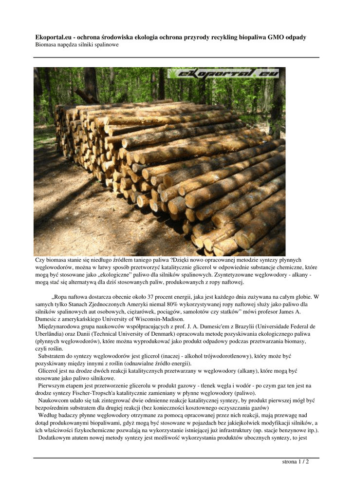 Ekoportal.eu - ochrona środowiska ekologia ochrona przyrody recykling biopaliwa GMO odpady Biomasa napędza silniki spalinowe Czy biomasa stanie się niedługo źródłem taniego paliwa ?Dzięki nowo opracowanej metodzie syntezy płynnych węglowodorów, można w łatwy sposób przetworzyć katalitycznie glicerol w odpowiednie substancje chemiczne, które mogą być stosowane jako „ekologiczne” paliwo dla silników spalinowych. Zsyntetyzowane węglowodory - alkany mogą stać się alternatywą dla dziś stosowanych paliw, produkowanych z ropy naftowej. „Ropa naftowa dostarcza obecnie około 37 procent energii, jaka jest każdego dnia zużywana na całym globie. W samych tylko Stanach Zjednoczonych Ameryki niemal 80% wykorzystywanej ropy naftowej służy jako paliwo dla silników spalinowych aut osobowych, ciężarówek, pociągów, samolotów czy statków” mówi profesor James A. Dumesic z amerykańskiego University of Wisconsin-Madison. Międzynarodowa grupa naukowców współpracujących z prof. J. A. Dumesic'em z Brazylii (Universidade Federal de Uberlândia) oraz Danii (Technical University of Denmark) opracowała metodę pozyskiwania ekologicznego paliwa (płynnych węglowodorów), które można wyprodukować jako produkt odpadowy podczas przetwarzania biomasy, czyli roślin. Substratem do syntezy węglowodorów jest glicerol (inaczej - alkohol trójwodorotlenowy), który może być pozyskiwany między innymi z roślin (odnawialne źródło energii). Glicerol jest na drodze dwóch reakcji katalitycznych przetwarzany w węglowodory (alkany), które mogą być stosowane jako paliwo silnikowe. Pierwszym etapem jest przetworzenie glicerolu w produkt gazowy - tlenek węgla i wodór - po czym gaz ten jest na drodze syntezy Fischer-Tropsch'a katalitycznie zamieniany w płynne węglowodory (paliwo). Naukowcom udało się tak zintegrować dwie odmienne reakcje katalitycznej syntezy, by produkt pierwszej mógł być bezpośrednim substratem dla drugiej reakcji (bez konieczności kosztownego oczyszczania gazów) Według badaczy płynne węglowodory otrzymane za pomocą opracowanej przez nich reakcji, mają przewagę nad dotąd produkowanymi biopaliwami, gdyż mogą być stosowane w pojazdach bez jakiejkolwiek modyfikacji silników, a ich właściwości fizykochemiczne pozwalają na wykorzystanie istniejącej już infrastruktury (np. stacje benzynowe itp.). Dodatkowym atutem nowej metody syntezy jest możliwość wykorzystania produktów ubocznych syntezy, to jest strona 1 / 2 Ekoportal.eu - ochrona środowiska ekologia ochrona przyrody recykling biopaliwa GMO odpady Biomasa napędza silniki spalinowe metanolu i etanolu, przez co znacząco można obniżyć koszty produkcji „ekologicznego” paliwa. Źródło: PAP strona 2 / 2