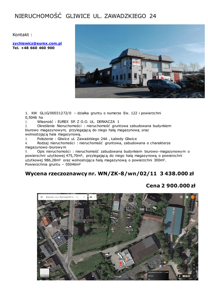 NIERUCHOMOŚĆ GLIWICE UL. ZAWADZKIEGO 24 Kontakt : [email protected] Tel. +48 660 460 900 1. KW GL1G/00031272/0 – działka gruntu o numerze Ew. 122 i powierzchni 0,5046 ha 1. Własność : EUREX SP. Z O.O. UL. DERKACZA 1 2. Określenie Nieruchomości : nieruchomość gruntowa zabudowana budynkiem biurowo magazynowym, przylegającą do niego halą magazynową oraz wolnostojącą hala magazynową. 3. Położenie : Gliwice ul. Zawadzkiego 24A , Łabedy Gliwice 4. Rodzaj nieruchomości : nieruchomość gruntowa, zabudowana o charakterze magazynowo-biurowym 5. Opis nieruchomości : nieruchomość zabudowana budynkiem biurowo-magazynowym o powierzchni użytkowej 475,70m², przylegającą do niego halą magazynową o powierzchni użytkowej 986,28m² oraz wolnostojąca halą magazynową o powierzchni 300m². Powierzchnia gruntu – 05046m² Wycena rzeczoznawcy nr. WN/ZK-8/wn/02/11 3 438.000 zł Cena 2 900.000 zł BUDYNEK ADMINISTRACYJNO-HANDLOWY Okres budowu obiektu 1992-1993r. Budynek obiektu to obiekt dwukondygnacyjny, podpiwniczony , bezpośrednio z nim połączony jest budynek magazynowo - składowy jednokondygnacyjny. Budynek wybudowany w technologii energooszczędnej ( termomuru ). Budynek posiada rampę do rozładunku. INSTALACJE : -elektryczna -gazowa -wodociągowa - kanalizacja sanitarna i deszczowa -telefoniczna -alarmowa -centralne ogrzewanie gazowe -odgromowa HALA MAGAZYNOWA Hala magazynowa o konstrukcji stalowej, dwunawowa. Ściany i dach z blachy trapezowej. Hala ogrzewana. Konstrukcja hali pomalowana farbą ognioochronną, instalacje jak w budynku biurowym. Podłoga w lastriko. Powierzchnia zabudowy hali 1013,75m², powierzchnia użytkowa 986,28m², kubatura 7481m³. Hala podzielona jest na 4-y odrębne magazyny z czego: a/ pierwszy magazyn jest wynajęty i posiada oddzielną bramę wjazdową b/ drugi i trzeci magazyn –posiadają wspólna bramę wjazdową ( jeden z tych magazynów jest też wynajęty ) c/ czwarty magazyn jest zajmowany przez naszą firmę – posiada bramę wjazdową i rampę wyładowczą . Rampa jest pod dachem wraz z kanałem naprawczym . Dach stożkowy na powierzchni całej hali : wysokość hali w najwyższym miejscu około 6,70m ( czubek stożka ) , w pozostałych miejscach 5,70m. WOLNOSTOJACA HALA MAGAZYNOWA – o konstrukcji stalowej, nie ogrzewana, o powierzchni 300m, posiadająca dwie bramy i możliwość podzielenia . DROGI I PLACE Powierzchnia 2615m² wyłożona brukiem heksagonalnym z posypką kamienną i piaskową. Teren skanalizowany. Wielkość placów umożliwia swobodne manewrowanie samochodem TIR. NAJEMCY : 1. EUROBUT ( 2723m3 + 58,3 m2) – opłata za najem 7750,00 netto- wynajmują pomieszczenia biurowe i część hali magazynowej. Dodatkowo refakturowany za energie elektryczną, wodę , ścieki– wg podliczników i wodmierza oraz za energię cieplną procentowo ( gaz )). 2. RIO PARANA (519,99m3)- opłata za najem 1712,80zł netto – wynajmuje jedno pomieszczenie biurowe oraz część hali magazynowej. Refakturowany ryczałtowo za 1m3 wody miesięcznie, energie elektryczna, ogrzewanie i podatek od nieruchomości ( procentowe obciążenie ) . 3. ESTA( 87m3) –czynsz 700,00zł netto – wynajmuje 1 pokój. Refakturowany za ogrzewanie i podatek od nieruchomości (procentowo ) KOSZT OGRZEWANIA Średniomiesięczny koszt ogrzewania około 2009zł – rocznie 24 108,00zł ( kwoty podane na podstawie faktur za cały 2015rok ) BUDYNEK :powierzchnia użytkowa 475,70m² HALA MAGAZYNOWA – 986,28m² WOLNOSTOJĄCY BLASZAK – 300m²