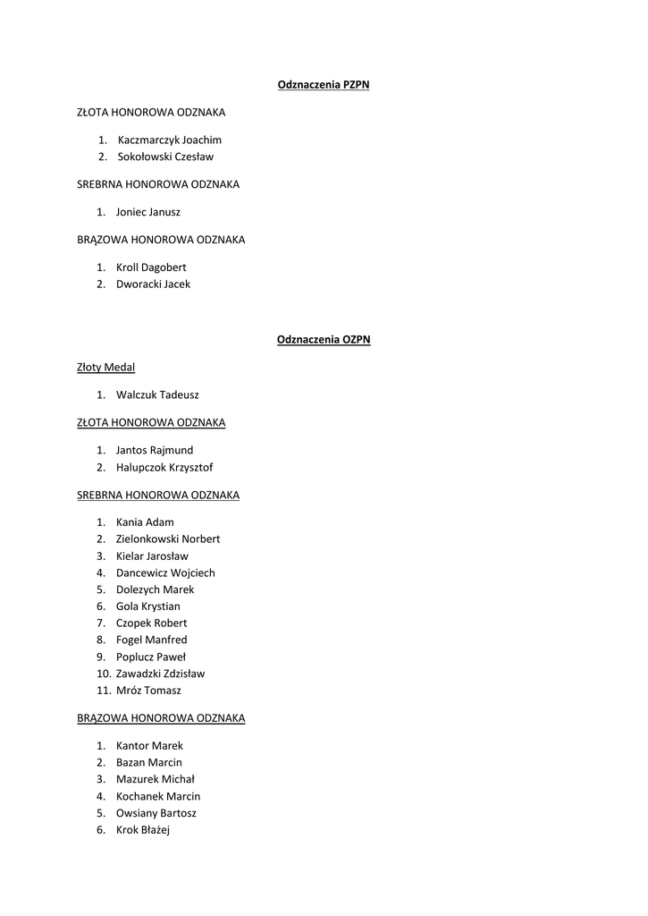Odznaczenia PZPN ZŁOTA HONOROWA ODZNAKA 1. Kaczmarczyk Joachim 2. Sokołowski Czesław SREBRNA HONOROWA ODZNAKA 1. Joniec Janusz BRĄZOWA HONOROWA ODZNAKA 1. Kroll Dagobert 2. Dworacki Jacek Odznaczenia OZPN Złoty Medal 1. Walczuk Tadeusz ZŁOTA HONOROWA ODZNAKA 1. Jantos Rajmund 2. Halupczok Krzysztof SREBRNA HONOROWA ODZNAKA 1. 2. 3. 4. 5. 6. 7. 8. 9. 10. 11. Kania Adam Zielonkowski Norbert Kielar Jarosław Dancewicz Wojciech Dolezych Marek Gola Krystian Czopek Robert Fogel Manfred Poplucz Paweł Zawadzki Zdzisław Mróz Tomasz BRĄZOWA HONOROWA ODZNAKA 1. 2. 3. 4. 5. 6. Kantor Marek Bazan Marcin Mazurek Michał Kochanek Marcin Owsiany Bartosz Krok Błażej 7. Kosarzecki Maciej 8. Chudala Artur