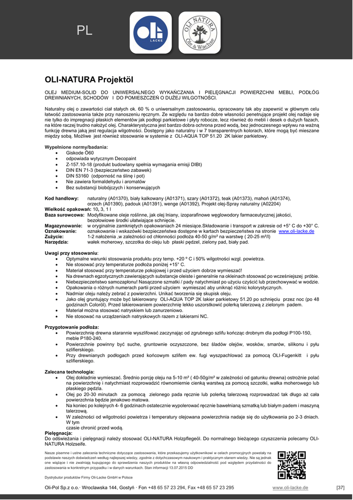 PL OLI-NATURA Projektöl OLEJ MEDIUM-SOLID DO UNIWERSALNEGO WYKAŃCZANIA I PIELĘGNACJI POWIERZCHNI MEBLI, PODŁÓG DREWNIANYCH, SCHODÓW I DO POMIESZCZEŃ O DUŻEJ WILGOTNOŚCI. Naturalny olej o zawartości ciał stałych ok. 60 % o uniwersalnym zastosowaniu, opracowany tak aby zapewnić w głównym celu łatwość zastosowania także przy nanoszeniu ręcznym. Ze względu na bardzo dobre własności penetrujące projekt olej nadaje się nie tylko do impregnacji płaskich elementów jak podłogi parkietowe i płyty robocze, lecz również do mebli i desek o dużych fazach, na które raczej trudno nałożyć olej. Charakterystyczna jest bardzo dobra ochrona przed wodą, bez jednoczesnego wpływu na ważną funkcję drewna jaką jest regulacja wilgotności. Dostępny jako naturalny i w 7 transparentnych kolorach, które mogą być mieszane między sobą. Możliwe jest również stosowanie w systemie z OLI-AQUA TOP 51.20 2K lakier parkietowy. Wypełnione normy/badania: Giskode Ö60 odpowiada wytycznym Decopaint Z-157.10-18 (produkt budowlany spełnia wymagania emisji DIBt) DIN EN 71-3 (bezpieczeństwo zabawek) DIN 53160 (odporność na ślinę i pot) Nie zawiera formaldehydu i aromatów Bez substancji biobójczych i konserwujących Kod handlowy: naturalny (A01370), biały kalkowany (A01371), szary (A01372), teak (A01373), mahoń (A01374), orzech (A01390), padouk (A01391), wenge (A01392), Projekt olej-Spray naturalny (A02204) Wielkość opakowań: 10, 3, 1 l Baza surowcowa: Modyfikowane oleje roślinne, jak olej lniany, izoparafinowe węglowodory farmaceutycznej jakości, bezołowiowe środki ułatwiające schnięcie. Magazynowanie: w oryginalnie zamkniętych opakowaniach 24 miesiące.Składowanie i transport w zakresie od +5° C do +30° C. Oznakowanie: oznakowanie i wskazówki bezpieczeństwa dostępne w kartach bezpieczeństwa na stronie www.oli-lacke.de Zużycie: 1-2 nałożenia ,w zależności od chłonności podłoża 40-50 g/m² na warstwę ( 20-25 m²/l) Narzędzia: wałek moherowy, szczotka do oleju lub płaski pędzel, zielony pad, biały pad. Uwagi przy stosowaniu: Optymalne warunki stosowania produktu przy temp. +20 º C i 50% wilgotności wzgl. powietrza. Nie stosować przy temperaturze podłoża poniżej +15° C. Materiał stosować przy temperaturze pokojowej i przed użyciem dobrze wymieszać! Na drewnach egzotycznych zawierających substancje oleiste i generalnie na okleinach stosować po wcześniejszej próbie. Niebezpieczeństwo samozapłonu! Nasączone szmatki / pady natychmiast po użyciu czyścić lub przechowywać w wodzie. Opakowania o różnych numerach partii przed użyciem wymieszać aby uniknąć różnic kolorystycznych. Nadmiar oleju należy zebrać z powierzchni. Unikać tworzenia się skupisk oleju. Jako olej gruntujący może być lakierowany OLI-AQUA TOP 2K lakier parkietowy 51.20 po schnięciu przez noc (po 48 godzinach Coloröl). Przed lakierowaniem powierzchnię lekko uszorstkowić polerką talerzową z zielonym padem. Materiał można stosować natryskiem lub zanurzeniowo. Nie stosować na urządzeniach natryskowych razem z lakierami NC. Przygotowanie podłoża: Powierzchnię drewna starannie wyszlifować zaczynając od zgrubnego szlifu kończąc drobnym dla podłogi P100-150, meble P180-240. Powierzchnie powinny być suche, gruntownie oczyszczone, bez śladów olejów, wosków, smarów, silikonu i pyłu szlifierskiego. Przy drewnianych podłogach przed końcowym szlifem ew. fugi wyszpachlować za pomocą OLI-Fugenkitt i pyłu szlifierskiego. Zalecana technologia: Olej dokładnie wymieszać. Średnio porcję oleju na 5-10 m² ( 40-50g/m² w zależności od gatunku drewna) ostrożnie polać na powierzchnię i natychmiast rozprowadzić równomiernie cienką warstwą za pomocą szczotki, wałka moherowego lub płaskiego pędzla. Olej po 20-30 minutach za pomocą zielonego pada ręcznie lub polerką talerzową rozprowadzać tak długo aż cała powierzchnia będzie jenakowo matowa. Na koniec po kolejnych 4- 6 godzinach ostatecznie wypolerować ręcznie bawełnianą szmatką lub białym padem i maszyną talerzową. W zależności od wilgotności powietrza i temperatury olejowana powierzchnia nadaje się do użytkowania po 2-3 dniach. W tym czasie chronić przed wodą. Pielęgnacja: Do odświeżania i pielęgnacji należy stosować OLI-NATURA Holzpflegeöl. Do normalnego bieżącego czyszczenia polecamy OLINATURA Holzseife. Nasze pisemne i ustne zalecenia techniczne dotyczące zastosowania, które przekazujemy użytkownikowi w celach promocyjnych powstały na podstawie naszych doświadczeń według najlepszej wiedzy, zgodnie z dotychczasowym naukowym i praktycznym stanem wiedzy. Nie są jednak one wiążące i nie zwalniają kupującego do sprawdzenia naszych produktów na własną odpowiedzialność pod względem przydatności do zastosowania w konkretnym przypadku i w danych warunkach. Stan informacji 13.07.2015 DD Dystrybutor produktów Firmy Oli-Lacke GmbH w Polsce Oli-Pol Sp.z o.o.· Wroclawska 144, Gostyń · Fon +48 65 57 23 294, Fax +48 65 57 23 295 www.oli-lacke.de [37]