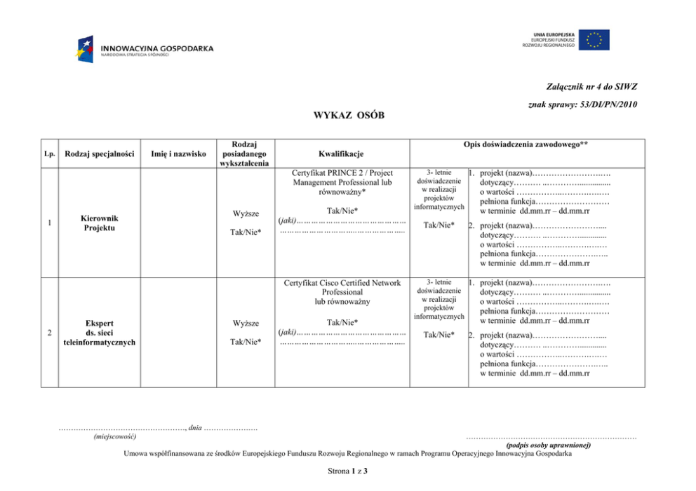 Załącznik nr 4 do SIWZ znak sprawy: 53/DI/PN/2010 WYKAZ OSÓB Lp. Rodzaj specjalności Imię i nazwisko Rodzaj posiadanego wykształcenia Opis doświadczenia zawodowego** Kwalifikacje Certyfikat PRINCE 2 / Project Management Professional lub równoważny* 1 Wyższe Kierownik Projektu Tak/Nie* Tak/Nie* (jaki)……………………………………… …………………………..……………….. Certyfikat Cisco Certified Network Professional lub równoważny 2 Ekspert ds. sieci teleinformatycznych Wyższe Tak/Nie* Tak/Nie* (jaki)……………………………………… …………………………..……………….. ……………………………………………, dnia …………………. (miejscowość) 3- letnie 1. projekt (nazwa)…………………….…. doświadczenie dotyczący………. ..…………............... w realizacji o wartości ……………..……….….…. projektów pełniona funkcja……………………… informatycznych w terminie dd.mm.rr – dd.mm.rr Tak/Nie* 2. projekt (nazwa)…………………….... dotyczący………. ..…………............. o wartości ……………..……….….… pełniona funkcja………………….….. w terminie dd.mm.rr – dd.mm.rr 3- letnie 1. projekt (nazwa)…………………….…. doświadczenie dotyczący………. ..…………............... w realizacji o wartości ……………..……….….…. projektów pełniona funkcja……………………… informatycznych w terminie dd.mm.rr – dd.mm.rr Tak/Nie* 2. projekt (nazwa)…………………….... dotyczący………. ..…………............. o wartości ……………..……….….… pełniona funkcja………………….….. w terminie dd.mm.rr – dd.mm.rr …………………………………………………………… (podpis osoby uprawnionej) Umowa współfinansowana ze środków Europejskiego Funduszu Rozwoju Regionalnego w ramach Programu Operacyjnego Innowacyjna Gospodarka Strona 1 z 3 Certyfikat Microsoft Certified Architect /Togaf Certified 8 (lub wyższy) / Sun Certified Enterprise Architect lub równoważny* 3 4 5 Architekt (1) systemów teleinformatycznych Architekt (2) systemów teleinformatycznych Ekspert (1) ds. systemów składowania i przetwarzania danych Wyższe Tak/Nie* Wyższe Tak/Nie* Wyższe informatyczne Tak/Nie* 3- letnie 1. projekt (nazwa)…………………….…. doświadczenie dotyczący………. ..…………............... w realizacji o wartości ……………..……….….…. projektów pełniona funkcja……………………… informatycznych w terminie dd.mm.rr – dd.mm.rr Tak/Nie* (jaki)……………………………………… …………………………..……………….. Certyfikat Microsoft Certified Architect /Togaf Certified 8 (lub wyższy) / Sun Certified Enterprise Architect lub równoważny* Tak/Nie* 2. projekt (nazwa)…………………….... dotyczący………. ..…………............. o wartości ……………..……….….… pełniona funkcja………………….….. w terminie dd.mm.rr – dd.mm.rr 3- letnie 1. projekt (nazwa)…………………….…. doświadczenie dotyczący………. ..…………............... w realizacji o wartości ……………..……….….…. projektów pełniona funkcja……………………… informatycznych w terminie dd.mm.rr – dd.mm.rr Tak/Nie* (jaki)……………………………………… …………………………..……………….. Certyfikat Microsoft Certified System Engineer - Windows 2003 / Microsoft Certified IT Professional Windows 2008 lub równoważny* *** Tak/Nie* (jaki)……………………………………… …………………………..……………….. Certyfikat VMware Certified Professional 4 lub równoważny*** Tak/Nie* (jaki)……………………………………… …………………………..……………….. ……………………………………………, dnia …………………. (miejscowość) Tak/Nie* 2. projekt (nazwa)…………………….... dotyczący………. ..…………............. o wartości ……………..……….….… pełniona funkcja………………….….. w terminie dd.mm.rr – dd.mm.rr 3- letnie 1. projekt (nazwa)…………………….…. doświadczenie dotyczący………. ..…………............... w realizacji o wartości ……………..……….….…. projektów pełniona funkcja……………………… informatycznych w terminie dd.mm.rr – dd.mm.rr Tak/Nie* 2. projekt (nazwa)…………………….... dotyczący………. ..…………............. o wartości ……………..……….….… pełniona funkcja………………….….. w terminie dd.mm.rr – dd.mm.rr …………………………………………………………… (podpis osoby uprawnionej) Umowa współfinansowana ze środków Europejskiego Funduszu Rozwoju Regionalnego w ramach Programu Operacyjnego Innowacyjna Gospodarka Strona 2 z 3 6 7 Ekspert (2) ds. systemów składowania i przetwarzania danych Ekspert ds. zarządzania kopiami zapasowymi w oparciu o oprogramowanie IBM Tivoli Storage Manager lub równoważne Wyższe informatyczne Tak/Nie* Wyższe informatyczne 3- letnie 1. projekt (nazwa)…………………….…. Certyfikat Microsoft Certified doświadczenie dotyczący………. ..…………............... System Engineer - Windows 2003 / w realizacji o wartości ……………..……….….…. Microsoft Certified IT Professional projektów pełniona funkcja……………………… Windows 2008 lub równoważny* *** informatycznych w terminie dd.mm.rr – dd.mm.rr Tak/Nie* (jaki)……………………………………… Tak/Nie* 2. projekt (nazwa)…………………….... …………………………..……………….. dotyczący………. ..…………............. Certyfikat VMware Certified o wartości ……………..