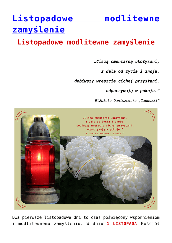 Listopadowe zamyślenie modlitewne Listopadowe modlitewne zamyślenie „Ciszą cmentarną ukołysani, z dala od życia i znoju, dobiwszy wreszcie cichej przystani, odpoczywają w pokoju.” Elżbieta Daniszewska „Zaduszki” Dwa pierwsze listopadowe dni to czas poświęcony wspomnieniom i modlitewnemu zamyśleniu. W dniu 1 LISTOPADA Kościół Katolicki obchodzi Uroczystość Wszystkich Świętych, kiedy to oddaje cześć tym wszystkim, którzy już weszli do chwały niebieskiej. Dzień ten powinien więc mieć charakter radosny. Osoby uznane za Świętych są dla osób żyjących obecnie przykładem, swoistym drogowskazem na trudnych ścieżkach życia. W tym dniu nauczanie Kościoła przypomina nam również prawdę o wspólnocie naszego pokolenia ze Świętymi, którzy otaczają nas opieką. W ciągu całego roku kalendarzowego niemal każdego dnia przypada wspomnienie jednego lub kilku Świętych znanych z imienia. Jednak ich liczba jest znacznie większa. Święci są pośrednikami i orędownikami u Boga, patronami osób, grup społecznych, zawodów, miast, krajów czy kontynentów. Większości z nas pierwszy dzień miesiąca listopada kojarzy się z modlitwą, zamyśleniem, cmentarzem, odwiedzaniem grobów bliskich osób, składaniem na nagrobkach kwiatów i zapalaniem na znak pamięci zniczy. Całymi rodzinami udajemy się na cmentarz, by tam nad grobami bliskich osób z rodziny, krewnych, przyjaciół, znajomych pomodlić się za ich dusze – wierząc, że już cieszą się oni chwałą w domu Ojca Niebieskiego – i zapalić „płomyk nadziei życia wiecznego”. Warto podkreślić, że Uroczystość Wszystkich Świętych nie jest – wbrew spotykanym niekiedy opiniom – „Świętem Zmarłych”, ale przypomina wszystkim osobom wierzącym o ich powołaniu do świętości. Droga do świętości może prowadzić zarówno poprzez: małżeństwo, życie samotne, kapłaństwo czy życie konsekrowane, bowiem każdy człowiek jest powołany do świętości. Świętość jest pełnią człowieczeństwa i nie można osiągnąć jej własnymi siłami. Konieczna jest pomoc łaski Bożej, czyli dar życzliwości Boga. Bóg jako Stwórca powołuje do świętości wszystkich, każdemu człowiekowi pomaga swą łaską. Teologia wskazuje, iż każdy człowiek otrzymał dar zbawienia, bo Jezus Chrystus złożył ofiarę za wszystkich ludzi. Od każdego z nas jednak zależy, w jakim stopniu przyjmie od Boga dar świętości i jaką drogę życiową wybierze. Natomiast w dniu 2 LISTOPADA obchodzimy Wspomnienie Wszystkich Wiernych Zmarłych. Dzień ten w polskiej kulturze jest nazywany Dniem Zadusznym. Jest to dzień modlitwy za tych, którzy w czyśćcu przygotowują się do chwały nieba. Obydwa dni razem czyli Uroczystość Wszystkich Świętych i Dzień Zaduszny przypominają nam o istnieniu wspólnoty Kościoła Katolickiego. Ta wspólnota obejmuje i łączy trzy stany – Świętych w niebie, dusze pokutujące w czyśćcu i osoby współcześnie żyjące na ziemi. Czynnikiem łączącym te trzy stany jest: modlitwa ofiarowana za dusze; pamięć o tych, którzy odeszli oraz wymiana dóbr duchowych. W tej łączności (komunii) wyraża się świętych obcowanie.