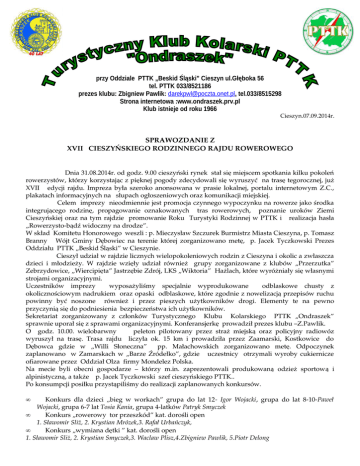 przy Oddziale PTTK „Beskid Śląski” Cieszyn ul.Głęboka 56 tel. PTTK 033/8521186 prezes klubu: Zbigniew Pawlik: [email protected], tel.033/8515298 Strona internetowa :www.ondraszek.prv.pl Klub istnieje od roku 1966 Cieszyn.07.09.2014r. SPRAWOZDANIE Z XVII CIESZYŃSKIEGO RODZINNEGO RAJDU ROWEROWEGO Dnia 31.08.2014r. od godz. 9.00 cieszyński rynek stał się miejscem spotkania kilku pokoleń rowerzystów, którzy korzystając z pięknej pogody zdecydowali się wyruszyć na trasę tegorocznej, już XVII edycji rajdu. Impreza była szeroko anonsowana w prasie lokalnej, portalu internetowym Z.C., plakatach informacyjnych na słupach ogłoszeniowych oraz komunikacji miejskiej. Celem imprezy nieodmiennie jest promocja czynnego wypoczynku na rowerze jako środka integrującego rodzinę, propagowanie oznakowanych tras rowerowych, poznanie uroków Ziemi Cieszyńskiej oraz na tym rajdzie promowanie Roku Turystyki Rodzinnej w PTTK i realizacja hasła „Rowerzysto-bądź widoczny na drodze”. W skład Komitetu Honorowego weszli : p. Mieczysław Szczurek Burmistrz Miasta Cieszyna, p. Tomasz Branny Wójt Gminy Dębowiec na terenie której zorganizowano metę, p. Jacek Tyczkowski Prezes Oddziału PTTK „Beskid Śląski” w Cieszynie. Cieszył udział w rajdzie licznych wielopokoleniowych rodzin z Cieszyna i okolic a zwłaszcza dzieci i młodzieży. W rajdzie wzięły udział również grupy zorganizowane z klubów „Przerzutka” Zebrzydowice, „Wiercipięta” Jastrzębie Zdrój, LKS „Wiktoria” Hażlach, które wyróżniały się własnymi strojami organizacyjnymi. Uczestników imprezy wyposażyliśmy specjalnie wyprodukowane odblaskowe chusty z okolicznościowym nadrukiem oraz opaski odblaskowe, które zgodnie z nowelizacją przepisów ruchu powinny być noszone również i przez pieszych użytkowników drogi. Elementy te na pewno przyczynią się do podniesienia bezpieczeństwa ich użytkowników. Sekretariat zorganizowany z członków Turystycznego Klubu Kolarskiego PTTK „Ondraszek” sprawnie uporał się z sprawami organizacyjnymi. Konferansjerkę prowadził prezes klubu –Z.Pawlik. O godz. 10.00. wielobarwny peleton pilotowany przez straż miejską oraz policyjny radiowóz wyruszył na trasę. Trasa rajdu liczyła ok. 15 km i prowadziła przez Zaamarski, Kostkowice do Dębowca gdzie w „Willi Słoneczna” pp. Małachowskich zorganizowano metę. Odpoczynek zaplanowano w Zamarskach w „Barze Źródełko”, gdzie uczestnicy otrzymali wyroby cukiernicze ofiarowane przez Oddział Olza firmy Mondelez Polska. Na mecie byli obecni gospodarze – którzy m.in. zaprezentowali produkowaną odzież sportową i alpinistyczną, a także p. Jacek Tyczkowski szef cieszyńskiego PTTK.. Po konsumpcji posiłku przystąpiliśmy do realizacji zaplanowanych konkursów. • Konkurs dla dzieci „bieg w workach” grupa do lat 12- Igor Wojacki, grupa do lat 8-10-Paweł Wojacki, grupa 6-7 lat Tosia Kania, grupa 4-latków Patryk Smyczek • Konkurs „rowerowy tor przeszkód” kat. dorośli open 1. Sławomir Sliż, 2. Krystian Mrózek,3. Rafał Urbańczyk, • Konkurs „wymiana dętki ” kat. dorośli open 1. Sławomir Sliż, 2. Krystian Smyczek,3. Waclaw Plisz,4.Zbigniew Pawlik, 5.Piotr Delong • Konkurs rzut opona 1. Krystian Mrózek, 2. Andrzej Nowak ,3. Mariusz Bubik ( po dogrywce), 4. Kacper Borus Wymienieni otrzymali nagrody rzeczowe oraz kupony rabatowe ufundowane przez sponsorow. Najbardziej widowiskową częścią imprezy było wręczenie pucharów. Zdobyli je : 1/ W kategorii „ Rodzina rajdowa” : 5 osobowa rodzina p. Smyczków. Puchar ufundował Burmistrz Miasta Cieszyna i został wręczony przez p.Alicje Wlach radnego m. Cieszyna. Dodatkowa nagroda był voucher obiadowy ufundowany przez gospodarzy mety pp.Malachowskich. 2/ W kategorii „rajdowych seniorów”: puchary ufundował wójt Gminy Debowiec a wręczył p. Elzbiecie Macura (r.1945) i p. Adamowi Poloczkowi ( r. 1932) obecny na mecie prezes PTTK. Dodatkowo seniorzy otrzymali kupony rabatowe ufundowane przez BTK Ondraszek. 3/ W kategorii „Rajdowego Juniora”, czyli najmłodszego rowerzysty, który samodzielnie pokonał trasę nagrode rzeczowa otrzymal Igor Bubik ( r.2008). Nagrode ufundowal TKK Ondarszekorganizator imprezy. 4/ W kategorii „Najliczniejsza grupa zorganizowana”: Puchar ufundowany przez Oddział PTTK „Beskid Śląski” zdobyla 14-osobowa ekipa Ondraszka ( byli to uczestnicy nie nalezacy do komitetu organizacyjnego). 5/W kategorii „Najmłodszy uczestnik rajdu”. Słodką niespodziankę odebrała Kornel Sliz (r.2013), która podróżowała w foteliku na rowerze rodziców. W tegorocznej edycji rajdu wzięło udział ok.120 rowerzystów od najmłodszych adeptów turystyki rowerowej po seniorów, czyli przedstawicieli aż czterech pokoleń . Impreza została przygotowana i przeprowadzona przez Turystyczny Klub Kolarski PTTK „Ondraszek” z Cieszyna, i mogła zostać zrealizowana dzięki pomocy następujących instytucji oraz firm: Urząd Miejski Cieszyn PTTK Oddział „Beskid Śląski” Cieszyn Urząd Gminy Debowiec Hurtownia „Beskid Plus” Cieszyn Centrum Oświetleniowe „Styl” Cieszyn Mondelez Polska S.A. Oddział „Olza” Cieszyn Gabi-Pol sklep i serwis rowerowy W.Plisz Cieszyn Pala&Pala sklep sportowy Cieszyn Totem sklep i serwis rowerowy Cieszyn BTK „Ondraszek” Cieszyn oraz innych W/w składam serdeczne podziękowanie za okazane wsparcie, a Komitetowi Organizacyjnemu z Turystycznego Klubu Kolarskiego PTTK „Ondraszek” z Cieszyna za zaangażowanie w przygotowanie oraz sprawne przeprowadzenie imprezy. Osobne podziękowanie składam funkcjonariuszom Policji, Straży Miejskiej w Cieszynie i służbie medycznej za zapewnienie bezpieczeństwa uczestnikom rajdu oraz wszystkim, którzy w jakikolwiek sposób przyczynili się do sukcesu tej imprezy. Z turystycznym pozdrowieniem Zbigniew Pawlik Prezes TKK PTTK „Ondraszek”
