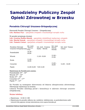 1 Samodzielny Publiczny Zespół Opieki Zdrowotnej w Brzesku Poradnia Chirurgii Urazowo-Ortopedycznej Kierownik Poradni Chirurgii Urazowo – Ortopedycznej: Lek. Dariusz Fryc – specjalista ortopedii i traumatologii narządu ruchu W poradni przyjmują również: Lek. Grażyna Kalita-Słowik – specjalista rehabilitacji medycznej, ortopeda Lek. Maciej Nowak – specjalista ortopedii i traumatologii narządu ruchu Lek. Tomasz Cetnar– specjalista ortopedii i traumatologii narządu ruchu lek. med. Poradnia Chirurgii Dariusz Urazowo-Ortopedycznej Fryc Poniedziałek lek. med. Maciej Nowak 11,00 -19,00 12.00 – 15.00 11,00 – 18,00 13,00 – 18,00 Czwartek Piątek lek. med. Tomasz Cetnar 14,30 – 20,00 Wtorek Środa lek. med. Grażyna Kalita – Słowik 12,00 – 16,00 12,00-16,00 7,00-12,00 Rejestracja do Poradni jest czynna: Poniedziałek 1000 – 1600 Wtorek 1000 – 1600 Środa 1000 – 1600 Czwartek 1300 – 1700 Piątek 700 – 1300 Do Poradni są wymagane skierowania od lekarza ubezpieczenia zdrowotnego. Obowiązuje rejestracja na terminy. Lekarze Poradni udzielają porad i konsultacji w zakresie chirurgii urazowoortopedycznej. Ważne telefony: ● ● Rejestracja – 14 66 21 385 Rejestracja do poradni odbywa się: osobiście, telefonicznie, za pośrednictwem osób trzecich lub poprzez stronę internetową www.spzoz-brzesko.pl. Samodzielny Publiczny Zespół Opieki Zdrowotnej w Brzesku- 1 / 2 - 13.12.2016 2 Samodzielny Publiczny Zespół Opieki Zdrowotnej w Brzesku- 2 / 2 - 13.12.2016