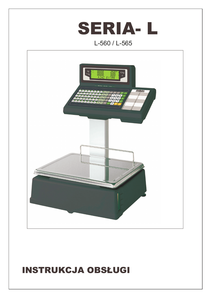 SERIA- L L-560 / L-565 INSTRUKCJA OBSŁUGI WAGI SERII L ZAWARTOŚĆ 1. WPROWADZENIE ........................................................................................... 6 1.1. 1.2. 1.3. 1.4. 1.5. PREZENTACJA......................................................................................................... 6 CHARAKTERYSTYKA OGÓLNA ............................................................................... 6 SPECYFIKACJA TECHNICZNA WAG ....................................................................... 7 INSTALACJA WAG ................................................................................................... 7 OBSŁUGA WAGI I PORADY JAK DBAĆ O WAGI SERII L ........................................ 8 2. OBSŁUGA WAGI ............................................................................................. 9 2.1. 2.2. 2.3. WŁĄCZANIE WAGI ................................................................................................... 9 URUCHOMIENIE WAGI ............................................................................................ 9 JAK OBSŁUGIWAĆ WAGĘ ..................................................................................... 10 2.3.1. Cena bezpośrednia .............................................................................................. 10 2.3.2. WaŜenie zwykłe ................................................................................................... 11 2.3.3. Operacje nie waŜone (dodawanie, odejmowanie, mnoŜenie) ................................ 11 2.3.4. Zerowanie wagi .................................................................................................... 12 2.3.5. RABATY bezpośrednie ........................................................................................ 12 2.3.6. Drukowanie paragonu: wyliczanie reszty i upustu ................................................. 12 2.3.7. Przeglądanie paragonu ........................................................................................ 13 2.3.8. Powtórne otwarcie paragonu ................................................................................ 14 2.3.9. Praca w trybie etykiety ......................................................................................... 14 2.3.10. Stała cena ............................................................................................................ 15 2.3.11. Zwiększanie lub zminieszanie ceny ...................................................................... 15 2.3.12. Operacje z wagą netto ......................................................................................... 16 2.3.13. Cena otwarta i promocje ...................................................................................... 17 2.3.14. Wycofanie waŜenia .............................................................................................. 18 2.3.15. Praca z szufladą kasową ...................................................................................... 18 2.3.16. Globalna data waŜności ....................................................................................... 19 2.3.17. Numer partii ......................................................................................................... 19 2.3.18. Etykiety zbiorcze .................................................................................................. 19 2.3.19. Formy płatności.................................................................................................... 20 2.3.20. Forma płatnoŚci rachunkowych............................................................................... 21 2.3.21. Dwie formy płatności ............................................................................................. 22 2.3.22. Listy ..................................................................................................................... 24 2.3.23. Zerowanie artykułów zakumulowanych. ................................................................ 31 2.3.24. Zerowanie części zakumulowanych ...................................................................... 31 2.3.25. Wybór domyślnego spredawcy ............................................................................. 31 2.3.26. Następny kod PLU ............................................................................................... 32 2.3.27. Konfiguracja podświetlania wyśweitlacza.............................................................. 32 2.3.28. Pukty za lojalność ................................................................................................ 33 2.4. TRYB SAMOOBSŁUGI ............................................................................................ 34 2.4.1. Tryb samoobsługi: KONF. .................................................................................... 35 2.4.2. Tryb Pracy ........................................................................................................... 36 2.4.3. Samoobsługa: wybór stałego kodu ....................................................................... 36 2.4.4. Wysyałanie szablonów ......................................................................................... 37 2.4.5. Aktywowanie klawiatury ....................................................................................... 38 2.4.6. Aktywowanie klawiatury dla programowania. ........................................................ 38 3. KOMUNIKACJA ............................................................................................ 39 3.1. 3.2. WPROWADZENIE................................................................................................... 39 KONFIGURACJA MASTER/SLAVE ......................................................................... 40 3.2.1. Ustawienie wagi Master/Slave .............................................................................. 40 3.2.2. Komunikacja MASTER PC przez ethernet. ........................