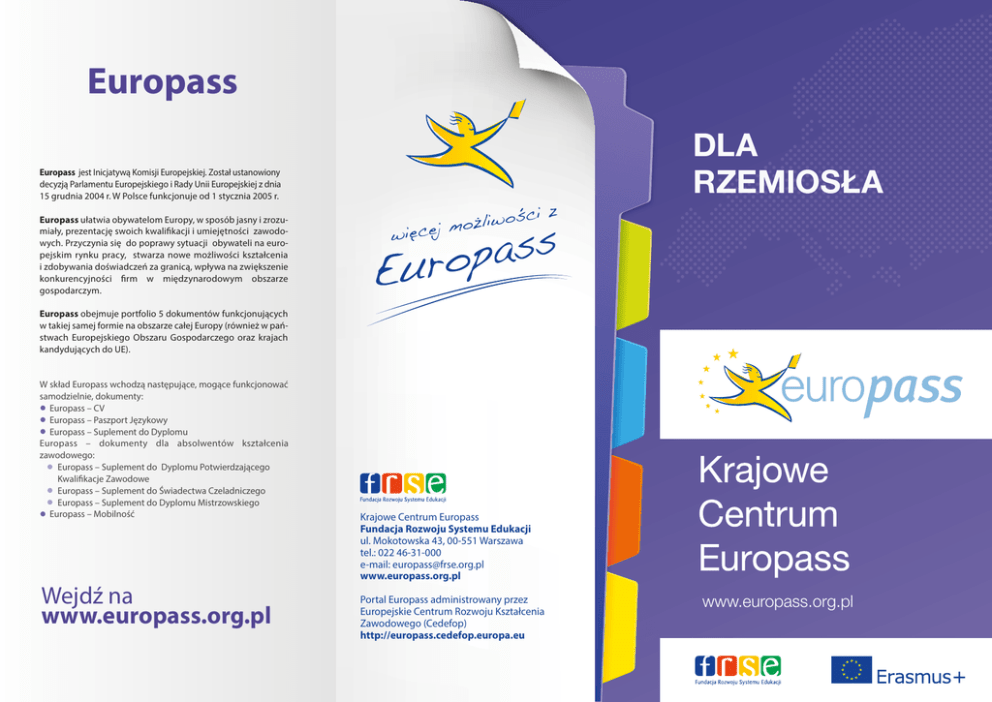 Europass DLA RZEMIOSŁA Europass jest Inicjatywą Komisji Europejskiej. Został ustanowiony decyzją Parlamentu Europejskiego i Rady Unii Europejskiej z dnia 15 grudnia 2004 r. W Polsce funkcjonuje od 1 stycznia 2005 r. Europass ułatwia obywatelom Europy, w sposób jasny i zrozumiały, prezentację swoich kwalifikacji i umiejętności zawodowych. Przyczynia się do poprawy sytuacji obywateli na europejskim rynku pracy, stwarza nowe możliwości kształcenia i zdobywania doświadczeń za granicą, wpływa na zwiększenie konkurencyjności firm w międzynarodowym obszarze gospodarczym. Europass obejmuje portfolio 5 dokumentów funkcjonujących w takiej samej formie na obszarze całej Europy (również w państwach Europejskiego Obszaru Gospodarczego oraz krajach kandydujących do UE). W skład Europass wchodzą następujące, mogące funkcjonować samodzielnie, dokumenty: Europass – CV Europass – Paszport Językowy Europass – Suplement do Dyplomu Europass – dokumenty dla absolwentów kształcenia zawodowego: Europass – Suplement do Dyplomu Potwierdzającego Kwalifikacje Zawodowe Europass – Suplement do Świadectwa Czeladniczego Europass – Suplement do Dyplomu Mistrzowskiego Europass – Mobilność Wejdź na www.europass.org.pl Krajowe Centrum Europass Fundacja Rozwoju Systemu Edukacji ul. Mokotowska 43, 00-551 Warszawa tel.: 022 46-31-000 e-mail: [email protected] www.europass.org.pl Portal Europass administrowany przez Europejskie Centrum Rozwoju Kształcenia Zawodowego (Cedefop) http://europass.cedefop.europa.eu www.europass.org.pl Chcesz napisać swój życiorys? Wykorzystaj gotowy formularz Europass – CV ułatwi, piszącym po raz pierwszy życiorys w formule CV, zebranie i wyeksponowanie istotnych osiągnięć z obszaru edukacji i doświadczenia zawodowego, umożliwi pełną prezentację umiejętności i kompetencji zdobytych m.in.w szkole, pracy, na szkoleniach, stażach i praktykach, podkreśli mocne strony posiadacza CV, wyrówna szanse polskich obywateli na europejskim, i nie tylko, rynku pracy. Formularz oraz aplikacja on-line do wypełniania Europass – CV, wraz z precyzyjną instrukcją, są dostępne bezpłatnie, we wszystkich językach UE na stronie: http://europass.cedefop.europa.eu. Chcesz zaprezentować swoją znajomość języków obcych? Wykorzystaj gotowy formularz Europass – Paszport Językowy ułatwi samoocenę umiejętności językowych, określi precyzyjnie poziom znajomości języków obcych, umożliwi prezentację umiejętności językowych, zarówno potwierdzonych certyfikatem, jak też nabytych poprzez własne doświadczenie, ułatwi pracodawcy dokonanie oceny kompetencji językowych kandydata do pracy. Formularz Europass – Paszport Językowy, jest dostępny bezpłatnie, na stronie http://europass.cedefop.europa.eu we wszystkich językach UE. Dokument wypełniany jest samodzielnie, zgodnie z instrukcją. Jedziesz na szkolenie lub wysyłasz pracownika na staż lub praktykę za graniczną? Chcesz wykorzystać za granicą świadectwo czeladnicze lub dyplom mistrzowski? Skorzystaj z Europass – Mobilność Skorzystaj z Europass - Suplement do Świadectwa Czeladniczego lub Europass – Suplement do Dyplomu Mistrzowskiego potwierdzi okres kształcenia, stażu lub praktyki zawodowej zrealizowanej, w ramach wyjazdu zorganizowanego w innym kraju, udokumentuje zakres wiedzy, umiejętności i kompetencji zdobytych za granicą. Europass - Mobilność wydawany jest bezpłatnie, w języku polskim i obcym przez instytucję wysyłającą (np. szkołę, izbę rzemieślniczą, placówkę oświatową), i potwierdzany przez Krajowe Centrum Europass. Otrzymać go może każda osoba, niezależnie od wieku, poziomu wykształcenia, statusu zawodowego podejmująca naukę za granicą. Skończyłeś studia? ułatwi posługiwanie się świadectwem/dyplomem na obszarze UE oraz na terenie innych krajów, umożliwi przedstawienie umiejętności zawodowych uzyskanych i potwierdzonych w wyniku zdanego egzaminu, wskaże do wykonywania jakich zawodów posiadacz dokumentu jest przygotowany, ułatwi pracodawcy lub zagranicznej instytucji przyjmującej dokument zrozumienie jego znaczenia, wzmocni prestiż firmy na rynku krajowym i zagranicznym. Europass – Suplement do Świadectwa Czeladniczego oraz Europass – Suplement do Dyplomu Mistrzowskiego wydaje Izba Rzemieślnicza osobie, która posiada odpowiednio Świadectwo Czeladnicze lub Dyplom Mistrzowski Skorzystaj z Europass - Suplement do Dyplomu ułatwi posługiwanie się dyplomem szkoły wyższej w obszarze UE oraz na terenie innych krajów, umożliwi przedstawienie profilu umiejętności uzyskanych w toku studiów, określi poziomo, treść i status ukończonych studiów, ułatwi pracodawcy lub zagranicznej instytucji przyjmującej dokument zrozumienie jego znaczenia, wzmocni prestiż firmy na rynku krajowym i zagranicznym. Europass – Suplement do Dyplomu wydaje uczelnia wyższa wraz z dyplomem ukończonych studiów od stycznia 2005 r. Suplement jest wydawany bezpłatnie od 2013 roku przez Izby Rzemieślnicze na wniosek posiadacza dyplomu lub świadectwa w języku polskim oraz na życzenie w języku angielskim. Adresy Izb Rzemieślniczych www.zrp.pl Jeśli nie posiadasz, albo twoi pracownicy nie mają dokumentów potwierdzających kwalifikacje zawodowe, a tym samym nie można uzyskać Europassu – Suplement do dyplomu potwierdzającego kwalifikacje zawodowe - zgłoś się lub skieruj swoich pracowników do Izby Rzemieślniczej na egzamin czeladniczy lub mistrzowski. Wydawanie suplementu koordynuje Związek Rzemiosła Polskiego. Wejdź na www.europass.org.pl Wejdź na www.zrp.pl