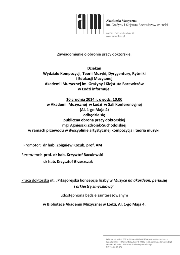 Zawiadomienie o obronie pracy doktorskiej Dziekan Wydziału Kompozycji, Teorii Muzyki, Dyrygentury, Rytmiki i Edukacji Muzycznej Akademii Muzycznej im. Grażyny i Kiejstuta Bacewiczów w Łodzi informuje: 10 grudnia 2014 r. o godz. 10.00 w Akademii Muzycznej w Łodzi w Sali Konferencyjnej (Al. 1-go Maja 4) odbędzie się publiczna obrona pracy doktorskiej mgr Agnieszki Zdrojek-Suchodolskiej w ramach przewodu w dyscyplinie artystycznej kompozycja i teoria muzyki. Promotor: dr hab. Zbigniew Kozub, prof. AM Recenzenci: prof. dr hab. Krzysztof Baculewski dr hab. Krzysztof Grzeszczak Praca doktorska nt. „Pitagorejska koncepcja liczby w Muzyce na akordeon, perkusję i orkiestrę smyczkową” udostępniona będzie zainteresowanym w Bibliotece Akademii Muzycznej w Łodzi, Al. 1-go Maja 4.