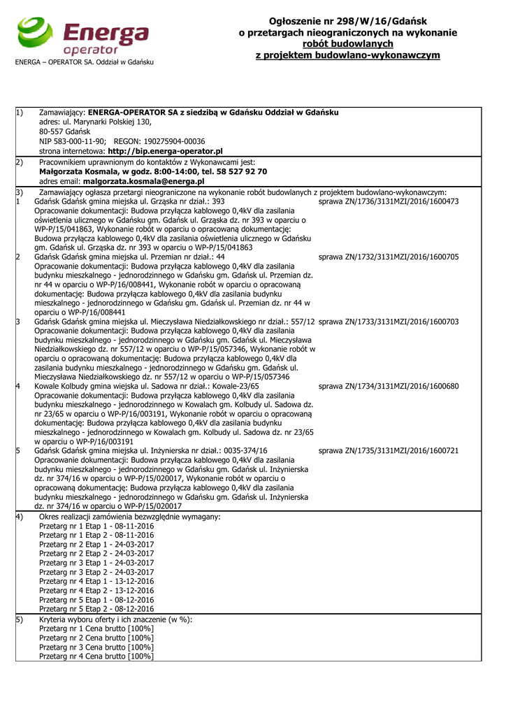 ENERGA – OPERATOR SA. Oddział w Gdańsku 1) 2) 3) 1 2 3 4 5 4) 5) Ogłoszenie nr 298/W/16/Gdańsk o przetargach nieograniczonych na wykonanie robót budowlanych z projektem budowlano-wykonawczym Zamawiający: ENERGA-OPERATOR SA z siedzibą w Gdańsku Oddział w Gdańsku adres: ul. Marynarki Polskiej 130, 80-557 Gdańsk NIP 583-000-11-90; REGON: 190275904-00036 strona internetowa: http://bip.energa-operator.pl Pracownikiem uprawnionym do kontaktów z Wykonawcami jest: Małgorzata Kosmala, w godz. 8:00-14:00, tel. 58 527 92 70 adres email: [email protected] Zamawiający ogłasza przetargi nieograniczone na wykonanie robót budowlanych z projektem budowlano-wykonawczym: Gdańsk Gdańsk gmina miejska ul. Grząska nr dział.: 393 sprawa ZN/1736/3131MZI/2016/1600473 Opracowanie dokumentacji: Budowa przyłącza kablowego 0,4kV dla zasilania oświetlenia ulicznego w Gdańsku gm. Gdańsk ul. Grząska dz. nr 393 w oparciu o WP-P/15/041863, Wykonanie robót w oparciu o opracowaną dokumentację: Budowa przyłącza kablowego 0,4kV dla zasilania oświetlenia ulicznego w Gdańsku gm. Gdańsk ul. Grząska dz. nr 393 w oparciu o WP-P/15/041863 Gdańsk Gdańsk gmina miejska ul. Przemian nr dział.: 44 sprawa ZN/1732/3131MZI/2016/1600705 Opracowanie dokumentacji: Budowa przyłącza kablowego 0,4kV dla zasilania budynku mieszkalnego - jednorodzinnego w Gdańsku gm. Gdańsk ul. Przemian dz. nr 44 w oparciu o WP-P/16/008441, Wykonanie robót w oparciu o opracowaną dokumentację: Budowa przyłącza kablowego 0,4kV dla zasilania budynku mieszkalnego - jednorodzinnego w Gdańsku gm. Gdańsk ul. Przemian dz. nr 44 w oparciu o WP-P/16/008441 Gdańsk Gdańsk gmina miejska ul. Mieczysława Niedziałkowskiego nr dział.: 557/12 sprawa ZN/1733/3131MZI/2016/1600703 Opracowanie dokumentacji: Budowa przyłącza kablowego 0,4kV dla zasilania budynku mieszkalnego - jednorodzinnego w Gdańsku gm. Gdańsk ul. Mieczysława Niedziałkowskiego dz. nr 557/12 w oparciu o WP-P/15/057346, Wykonanie robót w oparciu o opracowaną dokumentację: Budowa przyłącza kablowego 0,4kV dla zasilania budynku mieszkalnego - jednorodzinnego w Gdańsku gm. Gdańsk ul. Mieczysława Niedziałkowskiego dz. nr 557/12 w oparciu o WP-P/15/057346 Kowale Kolbudy gmina wiejska ul. Sadowa nr dział.: Kowale-23/65 sprawa ZN/1734/3131MZI/2016/1600680 Opracowanie dokumentacji: Budowa przyłącza kablowego 0,4kV dla zasilania budynku mieszkalnego - jednorodzinnego w Kowalach gm. Kolbudy ul. Sadowa dz. nr 23/65 w oparciu o WP-P/16/003191, Wykonanie robót w oparciu o opracowaną dokumentację: Budowa przyłącza kablowego 0,4kV dla zasilania budynku mieszkalnego - jednorodzinnego w Kowalach gm. Kolbudy ul. Sadowa dz. nr 23/65 w oparciu o WP-P/16/003191 Gdańsk Gdańsk gmina miejska ul. Inżynierska nr dział.: 0035-374/16 sprawa ZN/1735/3131MZI/2016/1600721 Opracowanie dokumentacji: Budowa przyłącza kablowego 0,4kV dla zasilania budynku mieszkalnego - jednorodzinnego w Gdańsku gm. Gdańsk ul. Inżynierska dz. nr 374/16 w oparciu o WP-P/15/020017, Wykonanie robót w oparciu o opracowaną dokumentację: Budowa przyłącza kablowego 0,4kV dla zasilania budynku mieszkalnego - jednorodzinnego w Gdańsku gm. Gdańsk ul. Inżynierska dz. nr 374/16 w oparciu o WP-P/15/020017 Okres realizacji zamówienia bezwzględnie wymagany: Przetarg nr 1 Etap 1 - 08-11-2016 Przetarg nr 1 Etap 2 - 08-11-2016 Przetarg nr 2 Etap 1 - 24-03-2017 Przetarg nr 2 Etap 2 - 24-03-2017 Przetarg nr 3 Etap 1 - 24-03-2017 Przetarg nr 3 Etap 2 - 24-03-2017 Przetarg nr 4 Etap 1 - 13-12-2016 Przetarg nr 4 Etap 2 - 13-12-2016 Przetarg nr 5 Etap 1 - 08-12-2016 Przetarg nr 5 Etap 2 - 08-12-2016 Kryteria wyboru oferty i ich znaczenie (w %): Przetarg nr 1 Cena brutto [100%] Przetarg nr 2 Cena brutto [100%] Przetarg nr 3 Cena brutto [100%] Przetarg nr 4 Cena brutto [100%] ENERGA – OPERATOR SA. Oddział w Gdańsku 6) Ogłoszenie nr 298/W/16/Gdańsk o przetargach nieograniczonych na wykonanie robót budowlanych z projektem budowlano-wykonawczym Przetarg nr 5 Cena brutto [100%] Warunki Zamówienia wraz z załącznikami dla poszczególnych przetargów można pobrać ze strony internetowej Zamawiającego pod adresem: http://bip.energa-operator.pl/centrala/lokalne/przetargi.xml?group=centrala Ogólne Warunki Umów dostępne są na stronie internetowej Zamawiającego pod adresem: http://www.energaoperator.pl/dostawcy_i_przetargi/regulaminy.xml 7) 8) 9) 10) 11) Do przetargu mogą przystąpić Wykonawcy zakwalifikowani do prac na rzecz ENERGA - OPERATOR SA i znajdujący się w Rejestrze Kwalifikowanych Wykonawców oraz spełniają pozostałe wymagania określone w WZ. Wniosek o umieszczenie w RKW wraz z Procedurą można pobrać ze strony: http://www.energa-operator.pl/dostawcy_i_przetargi/regulaminy.xml Miejsce i termin składania ofert: siedziba Zamawiającego, Kancelaria (pok. 2) do 21-04-2016 godz. 08:00 Miejsce i termin publicznego otwarcia ofert: siedziba Zamawiającego, pok 409 data 21-04-2016 godz. 09:00 Termin związania z ofertą: 90 dni od daty upływu terminu składania ofert. Postępowanie o udzielenie zamówienia prowadzone jest w trybie przetargu nieograniczonego, z zachowaniem zasad określonych: ustawą z dnia 23 kwietnia 1964r. Kodeks cywilny (Dz. U. z 1964 r. Nr 16, poz. 93 z późn. zmianami) oraz Regulaminem udzielania zamówień w Energa-Operator SA. Sporządził(a): Małgorzata Kosmala Gdańsk, 13-04-2016 r. ENERGA – OPERATOR SA Oddział w Gdańsku WARUNKI ZAMÓWIENIA do przetargów nieograniczonych z ogłoszenia nr 298/W/16/Gdańsk prowadzonych przez ENERGA – OPERATOR SA Oddział w Gdańsku w oparciu o Regulamin udzielania zamówień w ENERGA-OPERATOR SA przedmiot zamówienia – wykonanie robót budowlanych z projektem budowlano-wykonawczym: 1 2 3 4 5 Gdańsk Gdańsk gmina miejska ul. Grząska nr dział.: 393 sprawa Opracowanie dokumentacji: Budowa przyłącza kablowego 0,4kV dla zasilania oświetlenia ulicznego w Gdańsku gm. Gdańsk ul. Grząska dz. nr 393 w oparciu o WP-