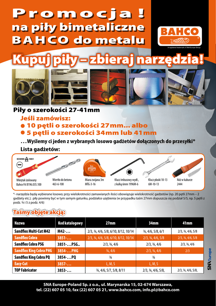Promocja ! na piły bimetaliczne B A H CO do metalu Kupuj piły – zbieraj narzędzia ! Piły o szerokości 27-41mm Jeśli zamówisz: 10 pętli o szerokości 27 mm... albo 5 pętli o szerokości 34 mm lub 41 mm …Wyślemy ci jeden z wybranych losowo gadżetów dołączonych do przesyłki* Lista gadżetów: Wkrętak izolowany Bahco Fit B196.035.100 Wiertło do betonu 463-6-100 Miara zwijana 3m MTG-3-16 Klucz imbusowy wydł., z kulką 6mm 1996M-6 Klucz płaski 10-13 6M-10-13 Nóż w kaburze 2444 *- narzędzia będą wybierane losowo; przy wielokrotności zamawianych ilości obowiązuje wielokrotność gadżetów (np. 20 pętli 27mm – 2 gadżety etc.); piły powinny być w tym samym gatunku, podziałce uzębienia (w przypadku taśm 27mm dopuszcza się podział 5/5, np. 5 pętli z podz. ¾ i 5 z podz. 4/6) Taśmy objęte akcją: Nazwa Kod katalogowy Sandflex Multi-Cut M42 Sandflex Cobra Sandflex Cobra PSG Sandflex King Cobra PHG Sandflex King Cobra PQ Easy-Cut TOP Fabricator M42-… 3851-… 3851-…PSG.. 3854-…PHG 3854-…PQ 3857-… 3853-… 27mm 34mm 41mm 2/3, ¾, 4/6, 5/8, 6/10, 8/12, 10/14 2/3, ¾, 4/6, 5/8, 6/10, 8/12, 10/14 2/3, ¾, 4/6 ¾, 4/6 ¾ L, M, S ¾, 4/6, 5/7, 5/8, 8/11 ¾, 4/6, 5/8, 6/1 2/3, ¾, 4/6, 5/8 2/3, ¾, 4/6 2/3, ¾, 4/6 ¾ L, M, S 2/3, ¾, 4/6, 5/8, 2/3, ¾, 4/6, 5/8 2/3, ¾, 4/6, 5/8 2/3, ¾, 4/6 2/3 2/3, ¾, 4/6, 5/8, SNA Europe-Poland Sp. z o.o., ul. Marynarska 15, 02-674 Warszawa, tel. (22) 607 05 10, fax (22) 607 05 21, www.bahco.com, [email protected] Kupuj piły – zbieraj narzędzia ! Piły produkcyjne o szerokości 54-80mm Jeśli zamówisz: 5 pętli o szer. 54mm lub 67mm…. albo 3 pętle o szer. 80mm …Wyślemy ci jeden z wybranych losowo gadżetów dołączonych do przesyłki* Lista gadżetów: Klucz nastawny 9029 Wkrętak grzechotkowy 808050 *- narzędzia będą wybierane losowo; przy wielokrotności zamawianych ilości obowiązuje wielokrotność gadżetów (np. 10 pętli 54mm – 2 gadżety, 6 pętli 80mm – 2 gadżety etc.); piły powinny być w tym samym gatunku. Taśmy objęte akcją: Nazwa Kod katalogowy 54-1.3mm 54-1.6mm 67mm 80mm Sandflex Cobra Sandflex Cobra PSG Sandflex King Cobra PHG Sandflex King Cobra PQ TOP Fabricator 3851-… 3851-…PSG.. 3854-…PHG 3854-…PQ 3853-… 2/3, ¾, 4/6 1/1.4, 1.4/2, 2/3, ¾ 1.4/2, 2/3, ¾ .7/1, 1.4/2, 2/3 .9/1.2, 1.4/2, 2/3, ¾ 2/3, ¾, 4/6 .7/1, 1/1.4, 1.4/2, ¾, 4/6 .7/1, 1/1.4, 1.4/2 .7/1, 1/1.4, 1.4/2, 2/3 .7/1, 1.4/2 .9/1.2, 1.4/2, 2/3 .9/1.2, 1.4/2 ¾, 5/8 2/3, 3/4 Czas trwania promocji: od 19 października do 23 grudnia 2015 r. (lub do odwołania). Pieczęć dystrybutora www.bahco.com SNA Europe-Poland Sp. z o.o., ul. Marynarska 15, 02-674 Warszawa, tel. (22) 607 05 10, fax (22) 607 05 21, www.bahco.com, [email protected]