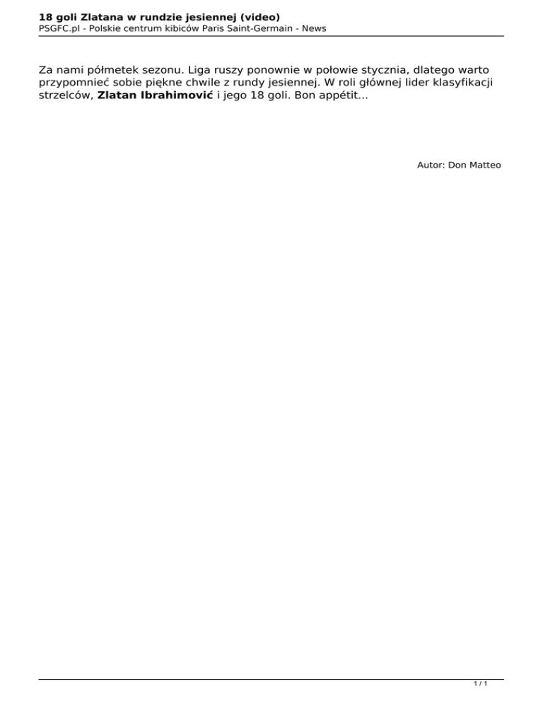 18 goli Zlatana w rundzie jesiennej (video) PSGFC.pl - Polskie centrum kibiców Paris Saint-Germain - News Za nami półmetek sezonu. Liga ruszy ponownie w połowie stycznia, dlatego warto przypomnieć sobie piękne chwile z rundy jesiennej. W roli głównej lider klasyfikacji strzelców, Zlatan Ibrahimović i jego 18 goli. Bon appétit... Autor: Don Matteo 1/1 Powered by TCPDF (www.tcpdf.org)