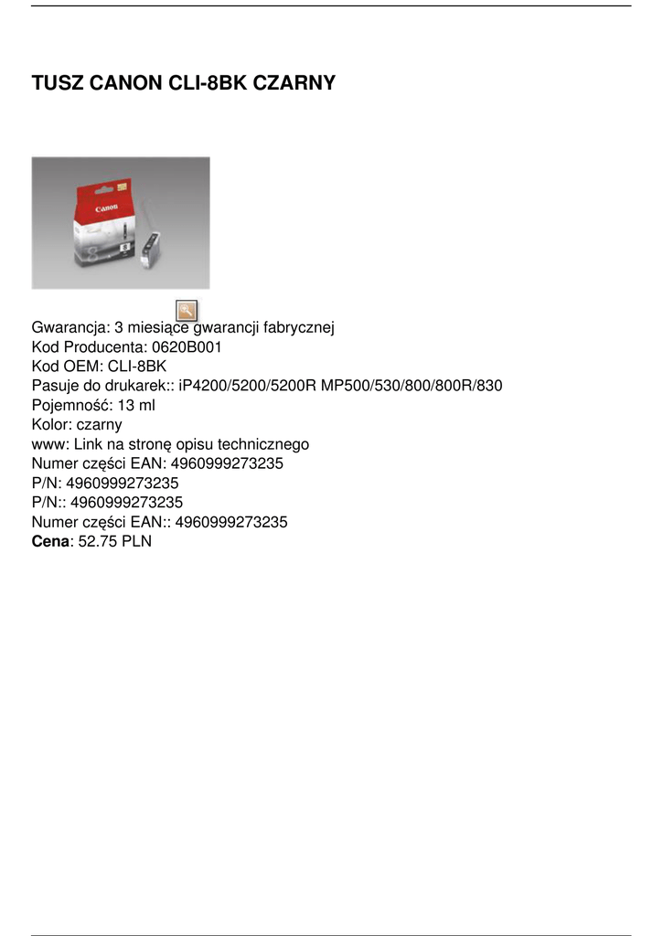 TUSZ CANON CLI-8BK CZARNY Gwarancja: 3 miesiące gwarancji fabrycznej Kod Producenta: 0620B001 Kod OEM: CLI-8BK Pasuje do drukarek:: iP4200/5200/5200R MP500/530/800/800R/830 Pojemność: 13 ml Kolor: czarny www: Link na stronę opisu technicznego Numer części EAN: 4960999273235 P/N: 4960999273235 P/N:: 4960999273235 Numer części EAN:: 4960999273235 Cena: 52.75 PLN Powered by TCPDF (www.tcpdf.org)