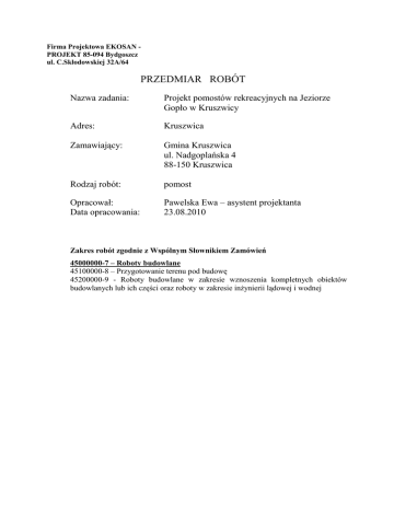 Firma Projektowa EKOSAN PROJEKT 85-094 Bydgoszcz ul. C.Skłodowskiej 32A/64 PRZEDMIAR ROBÓT Nazwa zadania: Projekt pomostów rekreacyjnych na Jeziorze Gopło w Kruszwicy Adres: Kruszwica Zamawiający: Gmina Kruszwica ul. Nadgoplańska 4 88-150 Kruszwica Rodzaj robót: pomost Opracował: Data opracowania: Pawelska Ewa – asystent projektanta 23.08.2010 Zakres robót zgodnie z Wspólnym Słownikiem Zamówień 45000000-7 – Roboty budowlane 45100000-8 – Przygotowanie terenu pod budowę 45200000-9 - Roboty budowlane w zakresie wznoszenia kompletnych obiektów budowlanych lub ich części oraz roboty w zakresie inŜynierii lądowej i wodnej Przedmiar robót LP PODSTAWA E1 E1.A1 KNR 2-33 E1.A1.P1 0309-0300 KNR 2-33 E1.A1.P2 0309-0300 N.Z. 2-14U E1.A1.P3 0026-0100 N.Z. 2-14U E1.A1.P4 0008-0100 N.Z. 2-14U E1.A1.P5 0008-0400 KNNR 4 E1.A1.P6 1409-0400 KNR 2-33 E1.A1.P7 0104-0100 KNR 2-33 E1.A1.P8 0104-0200 KNR 2-05 E1.A1.P9 0201-0700 KNR 2-05 E1.A1.P10 0208-0300 KNR 2-05 E1.A1.P11 0208-0300 OPIS Pomosty rekreacyjne na Jeziorze Gopło w Kruszwicy 2,000 Pomosty 2,000 JM ILOSC_SKL OBMIAR szt. szt. szt. szt. ANAL.MontaŜ belek podchodnikowych stalowych Belki stal aŜurowe z dwuteowników 200 h-280m 11,842 t t ANAL.MontaŜ belek podchodnikowych stalowych - Oczep stal. aŜurowy z dwuteowników 300 h-420m 5,203 t t 2,000 2,000 2,000 2,000 11,842 11,842 5,203 5,203 ANAL.Wbijanie pali stalowych fi 159/10 mm na głębokość 6 m,z lądu,rusztowania lub pomostu.Grunt kategorii I-II (zeszyt 8,9/92) 8,000 szt. szt. 8,000 ANAL.Wbijanie pali stalowych fi 159/10 mm na głębokość 6 m,z jednostki pływającej palownicą Fundex z młotem Delmag.Grunt kategorii I-II (zeszyt 3/92) 2,000 szt. szt. 2,000 szt. szt. 20,000 Wbijanie pali stalowych fi 159/10 mm na głębokość 8 m,z jednostki pływającej palownicą Fundex z młotem Delmag.Grunt kategorii III (zeszyt 3/92) 20,000 ANAL.Układanie mieszanki betonowej w belkach i podciągach pompą do betonu na samochodzie. Wypełnienie pali betonem13,70 4,366 ANAL.UłoŜenie chodnika - Podkład z desek dębowych na łatach 5x6cm 15,276 8,000 2,000 20,000 m3 m3 4,366 m3 m3 15,276 m3 m3 0,820 t t 0,803 ANAL>MontaŜ konstrukcji podparć, zawieszeń i osłon o masie elementu do 20,0 kg - słupki stalowe i pochwyt 0,467 t t 0,467 ANAL>MontaŜ konstrukcji podparć, zawieszeń i osłon o masie elementu do 20,0 kg - Poprzeczki stalowe 0,412 t t UłoŜenie krawęŜnika 0,82 Estakady stalowe dla rurociągów. MontaŜ konstrukcji stalowych stęŜeń kratownic 0,803 4,366 15,276 0,820 0,803 0,467 0,412 0,412 KNNR 4 E1.A1.P12 1408-0100 KNNR 10 E1.A1.P13 0201-0400 KNR 2-33 E1.A1.P14 0718-0200 KNR 2-33 E1.A1.P15 0718-0801 KNR 2-33 E1.A1.P16 0718-0300 KNR 2-33 E1.A1.P17 0718-0902 KNR 4-04 E1.A1.P18 1103-0400 KNR 4-04 E1.A1.P19 1103-0500 Ręczne układanie mieszanki betonowej w ławach fundamentowych i blokach oporowych.Transport mieszanki betonowej japonkami 6,000 Elementy Ŝelbetowe o objętości budowli 1,0110,0 m3 6,000 Czyszczenie ręczne szczotkami kratownic do III stopnia czystości 17,045 m3 m3 6,000 6,000 m3 m3 6,000 6,000 t t 17,045 Ręczne malowanie pędzlem elementów kratowych farbą olejną do gruntowania przeciwrdzewną - jedna warstwa 17,045 t t 17,045 Czyszczenie ręczne szczotkami innych drobnych elementów konstrukcji do III stopnia czystości 1,682 t t 1,682 Ręczne malowanie pędzlem elementów innych farbą ftalową do gruntowania przeciwrdzewną - jedna warstwa 1,682 t t 1,682 Wywiezienie gruzu z terenu rozbiórki przy mechanicznym załadowaniu i wyładowaniu. Transport samochodem samowyładowczym na odległość 1 km 16,5 Wywiezienie gruzu z terenu rozbiórki przy mechanicznym załadunku i wyładunku.Nakłady uzupełniające na kaŜdy dalszy rozpoczęty km odl.transportu ponad 1 km 16,5 17,045 17,045 1,682 1,682 m3 m3 16,500 16,500 m3 m3 16,500 16,500