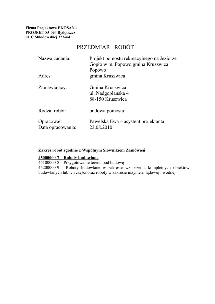 Firma Projektowa EKOSAN PROJEKT 85-094 Bydgoszcz ul. C.Skłodowskiej 32A/64 PRZEDMIAR ROBÓT Nazwa zadania: Adres: Projekt pomostu rekreacyjnego na Jeziorze Gopło w m. Popowo gmina Kruszwica Popowo gmina Kruszwica Zamawiający: Gmina Kruszwica ul. Nadgoplańska 4 88-150 Kruszwica Rodzaj robót: budowa pomostu Opracował: Data opracowania: Pawelska Ewa – asystent projektanta 23.08.2010 Zakres robót zgodnie z Wspólnym Słownikiem Zamówień 45000000-7 – Roboty budowlane 45100000-8 – Przygotowanie terenu pod budowę 45200000-9 - Roboty budowlane w zakresie wznoszenia kompletnych obiektów budowlanych lub ich części oraz roboty w zakresie inŜynierii lądowej i wodnej Przedmiar robót LP PODSTAWA E1 E1.A1 KNR 2-33 E1.A1.P1 0309-0300 KNR 2-33 E1.A1.P2 0309-0300 N.Z. 2-14U E1.A1.P3 0026-0100 N.Z. 2-14U E1.A1.P4 0008-0100 N.Z. 2-14U E1.A1.P5 0008-0400 KNNR 4 E1.A1.P6 1409-0400 KNR 2-33 E1.A1.P7 0104-0100 KNR 2-33 E1.A1.P8 0104-0200 KNR 2-05 E1.A1.P9 0201-0700 KNR 2-05 E1.A1.P10 0208-0300 KNR 2-05 E1.A1.P11 0208-0300 KNNR 10 E1.A1.P12 0201-0400 OPIS Pomost rekreacyjny na Jeziorze Gopło w m. Popowo gmina Kruszwica 1,000 Pomost 1,000 JM ILOSC_SKL OBMIAR szt. szt. szt. szt. ANAL.MontaŜ belek podchodnikowych stalowych Belki stal aŜurowe z dwuteowników 200 h-280m 4,35 t t ANAL.MontaŜ belek podchodnikowych stalowych - Oczep stal. aŜurowy z dwuteowników 300 h-420m 1,95 t t 1,000 1,000 1,000 1,000 4,350 4,350 1,950 1,950 ANAL.Wbijanie pali stalowych fi 159/10 mm na głębokość 6 m,z lądu,rusztowania lub pomostu.Grunt kategorii I-II (zeszyt 8,9/92) 4 szt. szt. 4,000 ANAL.Wbijanie pali stalowych fi 159/10 mm na głębokość 6 m,z jednostki pływającej palownicą Fundex z młotem Delmag.Grunt kategorii I-II (zeszyt 3/92) 1 szt. szt. 1,000 Wbijanie pali stalowych fi 159/10 mm na głębokość 8 m,z jednostki pływającej palownicą Fundex z młotem Delmag.Grunt kategorii III (zeszyt 3/92) 7 szt. szt. 7,000 ANAL.Układanie mieszanki betonowej w belkach i podciągach pompą do betonu na samochodzie. Wypełnienie pali betonem 1,707 ANAL.UłoŜenie chodnika - Podkład z desek dębowych na łatach 5x6cm 123*0,038 UłoŜenie krawęŜnika 71*0,05*0,1 Estakady stalowe dla rurociągów. MontaŜ konstrukcji stalowych stęŜeń kratownic 0,402 ANAL>MontaŜ konstrukcji podparć, zawieszeń i osłon o masie elementu do 20,0 kg - słupki stalowe i pochwyt 0,232 ANAL>MontaŜ konstrukcji podparć, zawieszeń i osłon o masie elementu do 20,0 kg - Poprzeczki stalowe 0,178 Elementy Ŝelbetowe o objętości budowli 1,0110,0 m3 m3 m3 4,000 1,000 7,000 1,707 1,707 m3 m3 4,674 m3 m3 0,355 t t 0,402 t t t t m3 4,674 0,355 0,402 0,232 0,232 0,178 0,178 3,000 KNR 2-33 E1.A1.P13 0718-0200 KNR 2-33 E1.A1.P14 0718-0801 KNR 2-33 E1.A1.P15 0718-0300 KNR 2-33 E1.A1.P16 0718-0902 KNR 4-04 E1.A1.P17 1103-0400 KNR 4-04 E1.A1.P18 1103-0500 3 Czyszczenie ręczne szczotkami kratownic do III stopnia czystości 6,3 m3 3,000 t t 6,300 Ręczne malowanie pędzlem elementów kratowych farbą olejną do gruntowania przeciwrdzewną - jedna warstwa 6,3 t t 6,300 Czyszczenie ręczne szczotkami innych drobnych elementów konstrukcji do III stopnia czystości 0,812 t t 0,812 Ręczne malowanie pędzlem elementów innych farbą ftalową do gruntowania przeciwrdzewną - jedna warstwa 0,812 t t 0,812 Wywiezienie gruzu z terenu rozbiórki przy mechanicznym załadowaniu i wyładowaniu. Transport samochodem samowyładowczym na odległość 1 km 8 Wywiezienie gruzu z terenu rozbiórki przy mechanicznym załadunku i wyładunku.Nakłady uzupełniające na kaŜdy dalszy rozpoczęty km odl.transportu ponad 1 km 8 m3 m3 m3 m3 6,300 6,300 0,812 0,812 8,000 8,000 8,000 8,000