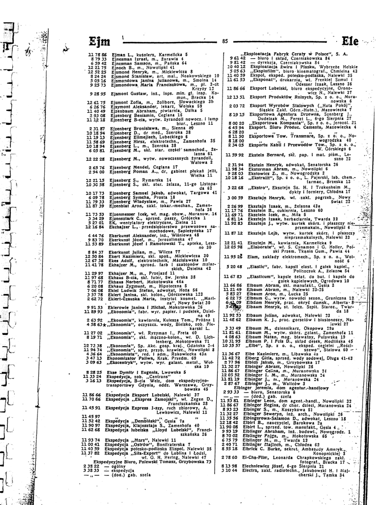 Ejm Ele 85 „Eksploatacja Fabryk Ceraty w Polsce", S. A. 11 78 86 Ejman L., kuśnierz, Karmelicka 5 9 6142 — biuro I skład, Czerniakowska 84 8 79 33 Ejnesman Izrael, m., żurawia 4 9 31 42 — dyrekcja, Czerniakowska 84 6 59 42 Ejnesman Samson, m., Pańska 64 10 4012 Eksploatacja żwiru i Piasku, Wybrzeże Helskie 12 21 75 Ejnoch B., m., Nowolipki 41 5 05 63 „Eksplofilm", biuro • kinematograf., Chmielna 43 ' 12 52 25 Ejsmond Henryk, m., Mickiewicza 8 1140 59 Ekspol, eksped. polesko-podlaska, Nalewki 35 8 24 24 Ejsmond Stanisław, art. mai., Noakowskiego 10 116153 „Eksponat", drukarnia, wł. Frenkiel Szmul i 5 05 16 Ejsmondowa Janina Julianowa, m., Smolna 14 Odesser Izaak, Leszno 36 9 25 73 Ejsmondowa Maria Franciszkowa, m., pl. 3-ch 1186 66 Eksport Lubelski, biuro ekspedycyjne, OronoKrzyży 12 wicz N., Nalewki 37 9 28 95 Ejsmont Gustaw, inż., inps. min. gł. insp. Ko 12 13 51 Eksport Produktów Rolnych, Sp. z o. o., Mura mun., Bracka 14 nowska 6 3b Ejsmont Zofia, m., Żoliborz, Słowackiego 12 61 75 2 03 72 Eksport Wyrobów Stalowych („Huta Pokój", 6 26 76 Ejsymont Aleksander, lekarz, Wolska 59 Śląskie Zakł. Górn.-Hutn.), Mazowiecka 7 11 40 49 Ejzenbaum Abraham, piwiarnia, Dzika 5 819 15 Eksportowa Agentura Drzewna, Szenberg J., 2 93 08 Ejzenberg Beniamin, Ceglana 16 Dudełzak M . , Ferszt L., 6-go Sierpnia 27 1112 18 Ejzenberg B-cia, wytw. żyrandoli nowocz. i lamp 8 00 20 „Eksportowa Kompania", Sp. z o. o., Jerozol. 21 biur., Leszno 11 6 45 94 Eksport. Biuro Produc. Cementu, Mazowiecka 4 Ejzenberg Bronisława, m., Sienna 40 2 3187 6 28 20 10 18 94 Ejzenberg D., dr med., Szeroka 38 Ejzenberg Elimejlech, Lubeckiego 6 8 1 1 5 0 Eksportowe Tow. Transmare, Sp. z o; o., No1119 13 818 00 „ „ „ wogrodzka 40 11 58 69 Ejzenberg Hirsz, elektrotechn., Zamenhofa 35 2 34 05 Eksportu Kabli i Przewodów Tow., Sp. z o. o.,' 10 18 94 Ejzenberg L., m., Szeroka 38 Ejzenberg M . , skł. star. części'samochód., Że W. Górskiego 6 6 05 81 lazna 61 1159 92 Ekstein Bernard, sk'ł. pap. I mat. piśm., Le szno 22 12 22 28 Ejzenberg M . , wytw. nowoczesnych żyrandoli, Wałowa 2 2 31 94 Ekstein Henryk, adwokat, Senatorska 26 2 65 76 Ejzenberg Mendel, Ceglana 17 1198 34 Eksterman Abram, m., Nowolipki 6 2 94 00 Ejzenberg Roman A.„ dr, gabinet płukań jelit, 9 28 03 Ekstowicz Z-., m., Nowogrodzka 2 Wielka 11 10 18 16 „Ekstraiłt", Sp. z o. o., L. Pajerski, lab. chem.12 2115 Ejzenberg S., Rymarska 14 iarmac, Brzeska 13 10 30 58 Ejzenberg 5., skł. star. żelaza, 11-go Listopa 3 22 68 „ E k s t r o " , Eksztejn Sz. H. I Trokenheim M., da 62 dykty i forniery, Chłodna 17 10 17 73 Ejzenberg Samuel Jakub, adwokat, Targowa 41 6 09 78 Ejzenberg Symcha, Prosta 18 3 00 59 Eksztajn Henryk, wł. zakł. pogrzeb., Nowy Ejzenberg Władysław, m., Pawia 27 11 79 33 Świat 22 • 1187 39 Ejzenblat Aron, zakł. tokar.-mechan., Zamen 2 26 99 Eksztajn Izask, m., Żelazna 43a hofa 36 1117 76 Eksztein B., cukiernia, Leszno 60 11 73 53 Ejzenmesser Icek, wł. mag. obuw., Muranów. 14 1169 7 1 Eksztein Icek, m., Miła 5 3 34 29 Ejzensztark C , sprzed, paszy, Grójecka 1 6 8114 Eksztejn Izaak, herbaciarnia, Twarda 32 • ' EK, wentylatory elektryczne, Zielna 11 5 27 01 1192 83 Eksztejn J . , wytw. kurtek skórz. i płaszczy n;e-__ 12 16 84 Ekchajzer L., • przedsiębiorstwo przewozowe sa przemakatn., Nowolipki 6 •" mochodowe, Sapieżyńska 17 1 1 8 7 1 2 Eksztejn Lejb, wytw. kurtek skórz. i płaszczy 4 44 76 Ekerkunst Aleksander, inż., Wiśniowa 48 nieprzemakalnych, Nalewki 33 9 83 70 Ekerkunst Józef, m., Jerozolimska 47 12 21 41 Eksztejn M . , kawiarnia, Karmelicka 9 11 53 89 Ekerkunst Józef I Ramotowski T., apteka, Lesz no 30 12 05 98 „ E i a b o r a t e " , wł. S. Cynamon i G. Holler, Pol 8 84 37 Ekerkunst Julian, m., Wilcza 77 ski Przem. Tkanin Gum., Pawia 44 12 50 84 Ekert Kazimierz, skl. spoż., Mickiewicza 30 1195 25 Elam, zakłady elektromech., Sp. z o. o., Wol 12 67 38 Ekes Adolf, elektrotechnik, Mścisławska 10 ność 6 11 41 78 Ekhajzer M . , sprzed, farb i szablonów malar 5 20 48 „Elastlc", fabr. kapsli elast. i gałek kąpiel., < skich, Dzielna 42 Poliszczuk A., żelazna 54 11 29 97 Ekhajzer M . , m., Przejazd 11 1167 83 „Elasticum", kapsle źelat. do but. i kapsle do 11 97 68 Ekhaus B-cia, skł. futer, Św. Jerska 38 • gałek kąpielowych, Ogrodowa 10 8 71 77 Ekhaus Norbert, Mokotowska 46a 11 66 86 Elbaum Abram, skl. manufakt., Gęsta 2 6 20 08 Ekhaus Zygmunt, m., Hipoteczna 5 112149 Elbaum Abram, m., Nalewki 23-25 7 06 08 Ekiel Ludwik Stefan, adwokat, Hoża 56 Ekiert Janina, skl. kolon., Górczewska 123 5 85 27 Elbaum Aron, m., Łucka 25 '» 3 37 78 6 22 75 .Elbaum C , wytw. nowości sezon., Graniczna 12. . 2 62 72 Ekiert-Czauska Maria, instytut kosmet. „Mari na", Nowy świat 30 6«,4109 Elbaum Henryk, prac okryć damsk., Alberta • 8— 9 9153 Ekterowle Janina I Michał, Mokotowska 26 5 > « Ä p Elbaum Henryk, st. felcz. Szpit. Staroz., Twar11 89 93 „Ekonomia", fabr. wyr. papier, i pudełek, Dziel da 13 na 49 1192 53 Elbaum Julian, adwokat, Nalewki 23 2 63 92 „Ekonomia", kawiarnia, Kulesza Tom., Próżna 1 U 42 62 Elbaum K. J., prac. gorsetów i biustonoszy, Na 4 58 6 3 * „Ekonomia", oczyszcz. wody, Bielsko, zob. Pie lewki 27 karski L. 3 33 49 Elbaum M . , dziennikarz, Okopowa 29a 1127 02 „Ekonomia", wł. Ryzyman I . , Freta 40 LI 81 61 Elbaum M . , wytw. skórz. galant., Zamenhofa 11 8 19 71 „Ekonomia",. skl. maczno-kolon., wł. D. Lich4 08 63 Elbaum Natan, mag. bławatny, Puławska 19 tenberg, Mokotowska 71 10 3195 Elbaum P. I Fcls D., skład desek, Modlińska 45 12 72 38 „Ekonomia", Sp. Akc. gosp. kraj.. Gdańska 2-4 LO 35 57 „ E l b e " , Sp. z o. o., eksped. cegielni „Rości 11 94 74 „Ekonomia", sprz. przyb. krawiec, Nowolipki 3 szewo", Stalowa 60 — * 4 36 64 „Ekonomista", red. i adm., Rakowiecka 43a LI 36 67 Elbe Kazimierz, m., Libawska 4a 3 47 13 Ekonomizator Paliwa, Krak. Przedm. 69 .1 42 72 Elberg Gitla, sprzed, wody sodowej, Długa 41-
