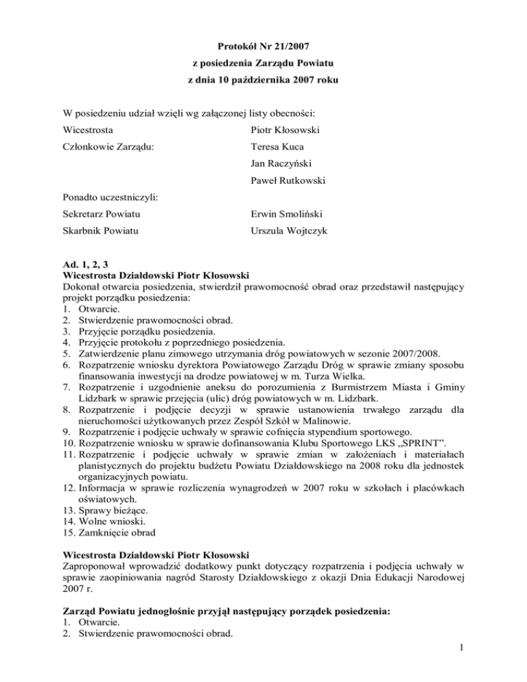 1 Protokół Nr 21/2007 z posiedzenia Zarządu Powiatu z dnia 10