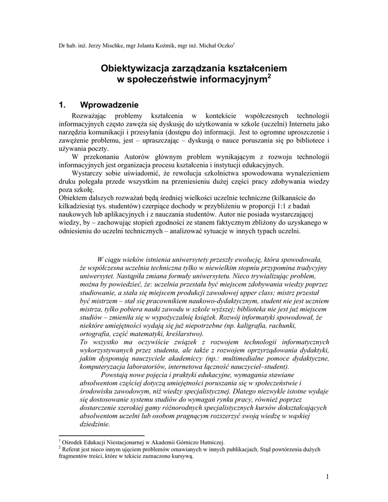 Dr hab. inż. Jerzy Mischke, mgr Jolanta Koźmik, mgr inż. Michał Oczko1 Obiektywizacja zarządzania kształceniem w społeczeństwie informacyjnym2 1. Wprowadzenie Rozważając problemy kształcenia w kontekście współczesnych technologii informacyjnych często zawęża się dyskusję do użytkowania w szkole (uczelni) Internetu jako narzędzia komunikacji i przesyłania (dostępu do) informacji. Jest to ogromne uproszczenie i zawężenie problemu, jest – upraszczając – dyskusją o nauce poruszania się po bibliotece i używania poczty. W przekonaniu Autorów głównym problem wynikającym z rozwoju technologii informacyjnych jest organizacja procesu kształcenia i instytucji edukacyjnych. Wystarczy sobie uświadomić, że rewolucja szkolnictwa spowodowana wynalezieniem druku polegała przede wszystkim na przeniesieniu dużej części pracy zdobywania wiedzy poza szkołę. Obiektem dalszych rozważań będą średniej wielkości uczelnie techniczne (kilkanaście do kilkadziesiąt tys. studentów) czerpiące dochody w przybliżeniu w proporcji 1:1 z badań naukowych lub aplikacyjnych i z nauczania studentów. Autor nie posiada wystarczającej wiedzy, by – zachowując stopień zgodności ze stanem faktycznym zbliżony do uzyskanego w odniesieniu do uczelni technicznych – analizować sytuacje w innych typach uczelni. W ciągu wieków istnienia uniwersytety przeszły ewolucję, która spowodowała, że współczesna uczelnia techniczna tylko w niewielkim stopniu przypomina tradycyjny uniwersytet. Nastąpiła zmiana formuły uniwersytetu. Nieco trywializując problem, można by powiedzieć, że: uczelnia przestała być miejscem zdobywania wiedzy poprzez studiowanie, a stała się miejscem produkcji zawodowej upper class; mistrz przestał być mistrzem – stał się pracownikiem naukowo-dydaktycznym, student nie jest uczniem mistrza, tylko pobiera nauki zawodu w szkole wyższej; biblioteka nie jest już miejscem studiów – zmieniła się w wypożyczalnię książek. Rozwój informatyki spowodował, że niektóre umiejętności wydają się już niepotrzebne (np. kaligrafia, rachunki, ortografia, część matematyki, kreślarstwo). To wszystko ma oczywiście związek z rozwojem technologii informatycznych wykorzystywanych przez studenta, ale także z rozwojem oprzyrządowania dydaktyki, jakim dysponują nauczyciele akademiccy (np.: multimedialne pomoce dydaktyczne, komputeryzacja laboratoriów, internetowa łączność nauczyciel–student). Powstają nowe pojęcia i praktyki edukacyjne, wymagania stawiane absolwentom częściej dotyczą umiejętności poruszania się w społeczeństwie i środowisku zawodowym, niż wiedzy specjalistycznej. Dlatego niezwykle istotne wydaje się dostosowanie systemu studiów do wymagań rynku pracy, również poprzez dostarczenie szerokiej gamy różnorodnych specjalistycznych kursów dokształcających absolwentom uczelni lub osobom pragnącym rozszerzyć swoją wiedzę w wąskiej dziedzinie. 1 Ośrodek Edukacji Niestacjonarnej w Akademii Górniczo Hutniczej. Referat jest nieco innym ujęciem problemów omawianych w innych publikacjach. Stąd powtórzenia dużych fragmentów treści, które w tekście zaznaczono kursywą. 2 1 Jednocześnie , z uwagi na dużą liczbę studiujących, ekonomia procesu dydaktycznego staje się kluczowym problemem do rozwiązania. Powstają nowe pojęcia i praktyki edukacyjne, wymagania stawiane absolwentom przesuwają się z wiedzy specjalistycznej w kierunku umiejętności poruszania się w społeczeństwie i środowisku zawodowym. Edukacja zaczyna być domeną przedsiębiorczości, a jednocześnie – wobec wysokich kosztów edukacji i wymiernej w pieniądzu wartości wykształcenia – podatnicy zaczęli się domagać dbałości o efektywne wydawanie swoich pieniędzy. Zarządzanie uczelnią upodabnia się do kierowania przedsiębiorstwem rynkowym, z całym instrumentarium rynku (planowanie, rachunek kosztów, sterowanie jakością, promocja, reklama itp.). Edukacja staje się problemem międzynarodowym, zarówno w aspekcie mobilności nauczycieli i uczniów, jak i finansowym – organizacje międzynarodowe inwestują w edukację duże pieniądze w nadziei na zwiększenie konkurencyjności Unii Europejskiej (PHARE, program „Sokrates” itp.). Poszukiwania praktycznych realizacji tych idei idą w wielu, uzupełniających się, kierunkach: w pracy pracowników uniwersytetu zmniejsza się liczba godzin kontaktowych na rzecz czasu przeznaczonego na przygotowanie pomocy dydaktycznych (podręczników, testów, zeszytów ćwiczeń, programów symulacyjnych itp.), pogłębia się podział na tych co więcej badają i tych co więcej uczą, przesuwa się naukę pewnych szczegółowych umiejętności poza uczelnię lub/ oraz na czas po studiach, częste egzaminy zastępuje się zespołowymi pracami projektowymi, bieżące sprawdziany – testami, przedmiot mierzy się nie w liczbie godzin kontaktu ale w przeciętnym czasie potrzebnym na opanowanie zawartości modułu i jego znaczeniu wyrażonym w liczbie tzw. kredytów. Kierując się zasadą: „absolwent uczelni technicznej musi bezpośrednio po studiach umieć przetworzyć nabytą wiedzę na zastosowanie praktyczne" – rozszerzanie wiedzy i umiejętności na nowe elementy stopniowo – odpowiednio do zmieniających się indywidualnych potrzeb – przesuwa na się czas po studiach. Można przewidywać, że w obronie przed – nagminnym już ściąganiem – z Internetu zostanie przywrócony system prac klauzurowych (w latach pięćdziesiątych tak wyglądał dyplom na Politechnice Krakowskiej). W celu osiągnięcia możliwie najwyższej finansowej efektywności kształcenia (sprawność zawodowa absolwenta / ilości wydanych pieniędzy) uczelnie dążą do precyzyjnego dawkowania wiedzy w czasie studiów. Wykorzystuje się ludzi z zewnątrz uczelni, wymusza się mobilność kadr kontraktami, stypendiami, grantami itp. (czasem nawet wprowadzany jest formalny zakaz za