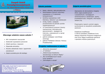Zespół Szkół Ponadgimnazjalnych im. Marii Skłodowskiej– Curie w Oleśnicy Szkoła posiada:  basen, siłownię i salę gimnastyczną  Multimedialne Centrum Informacji wyposażone w 12 stanowisk komputerowych  świetlicę wyposażoną w stół bilardowy, telewizor i gry edukacyjne  windę, toalety i podjazdy przystosowane do potrzeb uczniów niepełnosprawnych  15 nowoczesnych pracowni (branży mechanicznej, informatycznej, ekonomicznej) z dostępem do Internetu, wyposażonych w sprzęt Dlaczego właśnie nasza szkoła ? multimedialny   Mili i kompetentni nauczyciele  Doskonale wyposażone pracownie szkolnego   Wysoka zdawalność matur i egzaminów zawodowych  Zajęcia pozalekcyjne dla każdego gabinet Profilaktyki Zdrowia i Pomocy Przedlekarskiej  Obiekt sportowy z basenem  Wspaniała atmosfera gabinet pedagoga i psychologa Projekty realizowane w szkole:  „Ekonomia stosowana”  „IT-SZKOŁA”  „Modernizacja Kształcenia  „Być przedsiębiorczym-nauka Zawodowego na Dolnym Śląsku” przez działanie”  Adres szkoły: Zespół Szkół Ponadgimnazjalnych im. Marii Skłodowskiej—Curie ul. Wojska Polskiego 67/69 Tel. (71) 314 30 41; fax (71) 314 30 42 www.zsp.olesnica.pl E-mail: [email protected] „Dolnośląska e-szkoła” Zajęcia pozalekcyjne: Zapraszamy do skorzystania z bogatej oferty zajęć pozalekcyjnych i pozaszkolnych, rozwijających zainteresowania w dziedzinach: sportu, przedsiębiorczości, fotografii, informatyki, reklamy itp. Proponujemy naszym uczniom zajęcia wyrównawcze ze wszystkich przedmiotów szkolnych. Dodatkowe kwalifikacje: w ofercie posiadamy dodatkowe kursy obsługi programów finansowo-księgowych oraz kursy dające kwalifikacje spawacza i operatora wózków jezdniowych. Rekrutacja TECHNIKUM Rok szkolny 2015/2016  technik informatyk – rozszerzona matematyka, fizyka  technik spedytor - rozszerzona matematyka, geografia  technik ekonomista – rozszerzona matematyka, wiedza o społeczeństwie  technik mechanik – rozszerzona matematyka, fizyka  technik handlowiec – rozszerzona geografia, język niemiecki Warunki przyjęcia: Kierunek Punkty rekrutacyjne z: technik spedytor technik handlowiec technik ekonomista j. polskiego, j. obcego, geografii, matematyki technik mechanik j. polskiego, j. obcego, fizyki, matematyki j. polskiego, j. obcego, matematyki, informatyki technik informatyk Minimalna liczba punktów rekrutacyjnych: technik technik technik technik ekonomista: 33 spedytor, mechanik,: 35 informatyk: 40 handlowiec: 30 Jak policzyć punkty rekrutacyjne? Zasadnicza Szkoła Zawodowa Jak policzyć punkty rekrutacyjne?  zsumować wyniki egzaminu gimnazjalnego z j. polskiego, historii i wos, matematyki, przedmiotów przyrodniczych, języka obcego na poziomie podstawowym i pomnożyć przez 0,2 a uzyskamy wynik podzielić przez 2;  do uzyskanej liczby dodać punkty za oceny z wybranych przedmiotów ze świadectwa, stosując następujące wskaźniki: celujący: 10 pkt., bardzo dobry: 8 pkt., dobry: 6 pkt., dostateczny: 4 pkt. (za ocenę dopuszczającą nie przyznajemy punktów);  w przypadku szczególnych osiągnięć odnotowanych na świadectwie ukończenia gimnazjum:  ukończenie szkoły z wyróżnieniem (świadectwo z paskiem) — 3pkt.  konkursy i olimpiady na szczeblu wojewódzkim (1 konkurs — 2 pkt., 2 konkursy — 3 pkt., powyżej 2 — 4 pkt.)  osiągnięcia sportowe i artystyczne na szczeblu powiatowym (1 dyplom — 1 pkt., 2 i więcej — 2 pkt.) Dla młodzieży Operator obrabiarek skrawających WYMAGANE DOKUMENTY:  podanie (wydruk z komputera – nabór elektroniczny),  świadectwo ukończenia gimnazjum,  zdjęcie legitymacyjne – 2 sztuki,  zaświadczenie o wynikach egzaminu gimnazjalnego,  zaświadczenie lekarskie z Poradni Medycyny Pracy – (skierowanie wydaje sekretariat uczniowski pok.119). WARUNKI PRZYJĘCIA  odpowiedni stan zdrowia potwierdzony przez lekarza i wyniki egzaminu gimnazjalnego, oceny ze świadectwa: j. polski, j. obcy, matematyka, informatyka,  zajęcia praktyczne zapewnia szkoła w PCKZ w Oleśnicy,  możliwość zdobycia dodatkowych kwalifikacji spawacza lub operatora wózków jezdniowych (dla wielu uczniów kursy są bezpłatne),  możliwa kontynuacja nauki w liceum w ZSP od klasy drugiej oraz na kwalifikacyjnych kursach zawodowych (w szkole dla dorosłych),  minimalna liczba punktów rekrutacyjnych: 20. Dla młodocianych pracowników sprzedawca, mechanik pojazdów samochodowych; piekarz, cukiernik, stolarz, tapicer itp. w klasach wielozawodowych WARUNKI PRZYJĘCIA  odpowiedni stan zdrowia potwierdzony przez lekarza oraz wyniki egzaminu gimnazjalnego, oceny ze świadectwa: j. polski, j. obcy, matematyka, informatyka,  szkoła nie zapewnia praktyki zawodowej, należy ją znaleźć samodzielnie (w zawodach rzemieślniczych zakład musi być zrzeszony w Cechu),  w klasach wielozawodowych przedmioty zawodowe są realizowane na kursach (również wyjazdowych) – na koszt pracownika młodocianego (dojazd, noclegi, wyżywienie),  status młodocianego pracownika reguluje Kodeks pracy,  możliwa kontynuacja nauki w liceum dla dorosłych, oraz na kwalifikacyjnych kursach zawodowych (od klasy drugiej)