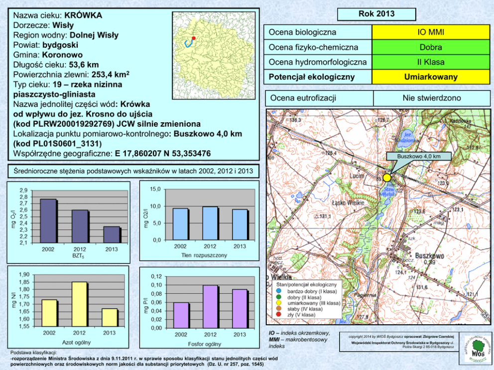 Nazwa cieku: KRÓWKA Dorzecze: Wisły Region wodny: Dolnej Wisły Powiat: bydgoski Gmina: Koronowo Długość cieku: 53,6 km Powierzchnia zlewni: 253,4 km2 Typ cieku: 19 – rzeka nizinna piaszczysto-gliniasta Nazwa jednolitej części wód: Krówka od wpływu do jez. Krosno do ujścia (kod PLRW200019292769) JCW silnie zmieniona Lokalizacja punktu pomiarowo-kontrolnego: Buszkowo 4,0 km (kod PL01S0601_3131) Współrzędne geograficzne: E 17,860207 N 53,353476 Rok 2013 Ocena biologiczna IO MMI Ocena fizyko-chemiczna Dobra Ocena hydromorfologiczna II Klasa Potencjał ekologiczny Umiarkowany Ocena eutrofizacji Nie stwierdzono Buszkowo 4,0 km Średnioroczne stężenia podstawowych wskaźników w latach 2002, 2012 i 2013 IO – indeks okrzemkowy, MMI – makrobentosowy indeks Podstawa klasyfikacji: -rozporządzenie Ministra Środowiska z dnia 9.11.2011 r. w sprawie sposobu klasyfikacji stanu jednolitych części wód powierzchniowych oraz środowiskowych norm jakości dla substancji priorytetowych (Dz. U. nr 257, poz. 1545) copyright 2014 by WIOŚ Bydgoszcz opracował: Zbigniew Czerebiej Wojewódzki Inspektorat Ochrony Środowiska w Bydgoszczy ul. Piotra Skargi 2 85-018 Bydgoszcz Krówka – Buszkowo 4,0 km BZT5 (mg O2/l) OWO (mg C/l) Nasycenie wód tlenem (%) Przewodność w 20oC (uS/cm) Twardość ogólna (mg CaCO3/l) Odczyn pH Azot amonowy (mg N-NH4/l) Azot Kjeldahla (mg N/l) Azot azotanowy (mg N-NO3/l) Azot ogólny (mg N/l) Fosforany (mg PO4/l) Fosfor ogólny (mg P/l) Liczba pomiarów w roku Min Max Średnia Klasa Tlen rozpuszczony (mg O2/l) Wskaźniki Temperatura (oC) Wyniki badań – rok 2013 8 8 8 8 8 8 8 8 8 8 8 8 8 8 0,7 24,0 15,6 I 5,2 13,8 9,0 I 1,5 3,3 2,3 I 10,9 13,7 12,2 II 53 105 86,6 - 475 605 541 I 263 397 298 I 7,7 8,3 7,9 I 0,02 0,13 0,06 I 0,68 2,12 1,33 II 0,05 0,87 0,33 I 1,27 2,18 1,67 I 0,05 0,15 0,09 I 0,03 0,16 0,09 I Elementy fizykochemiczne