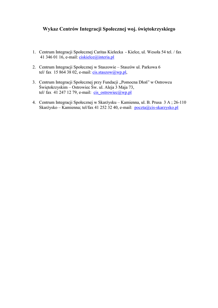 Wykaz Centrów Integracji Społecznej woj. świętokrzyskiego 1. Centrum Integracji Społecznej Caritas Kielecka - Kielce, ul. Wesoła 54 tel. / fax 41 346 01 16, e-mail: [email protected] 2. Centrum Integracji Społecznej w Staszowie – Staszów ul. Parkowa 6 tel/ fax 15 864 38 02, e-mail: [email protected], 3. Centrum Integracji Społecznej przy Fundacji „Pomocna Dłoń” w Ostrowcu Świętokrzyskim – Ostrowiec Św. ul. Aleja 3 Maja 73, tel/ fax 41 247 12 79, e-mail: [email protected] 4. Centrum Integracji Społecznej w Skarżysku – Kamienna, ul. B. Prusa 3 A ; 26-110 Skarżysko – Kamienna; tel/fax 41 252 32 40, e-mail: [email protected]
