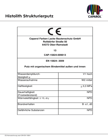 Histolith Strukturierputz Histolith Strukturierputz Caparol Farben Lacke Bautenschutz GmbH Roßdörfer Straße 50 64372 Ober-Ramstadt 13 CAP-15824-009613 EN 15824: 2009 Putz mit organischem Bindemittel außen und innen Wasserdampfdurchlässigkeit µ Wasseraufnahme V1 hoch W2 mittel Haftfestigkeit Dauerhaftigkeit (Frostwiderstand) Wärmeleitfähigkeit 10, dry Brandverhalten > 0,3 MPa NPD 10, dry Gefährliche Substanzen CE-Kennzeichnung nach DIN EN 15824 NPD B -s1, d0 NPD Histolith Strukturierputz LEISTUNGSERKLÄRUNG Nr.: CAP-15824-009613 Produkttyp Putz mit organischem Bindemittel Identifikation/Chargennummer Histolith Strukturierputz Chargennummer - siehe Verpackung des Produkts Verwendungszweck Putz mit organischem Bindemittel zur Verwendung als Außen- und Innenbeschichtung für Wände, Pfeiler, Decken o. ä. Hersteller CAPAROL Farben Lacke Bautenschutz GmbH, Roßdörfer Straße 50, 64372 Ober-Ramstadt System zur Bewertung und Überprüfung der Leistungsbeständigkeit System 3 Erklärte Leistung Wesentliche Merkmale Leistung Wasserdampfdurchlässigkeit Wasseraufnahme Haftfestigkeit V1 hoch W 2 mittel ≥ 0,3 MPa Dauerhaftigkeit (Frostwiderstand) Wärmeleitfähigkeit Brandverhalten Gefährliche Substanzen Harmonisierte technische Spezifikation EN 15824: 2009 EN 15824: 2009 EN 15824: 2009 NPD EN 15824: 2009 NPD B -s1, d0 NPD EN 15824: 2009 EN 15824: 2009 EN 15824: 2009 Die Leistung des Produktes, für das diese Leistungserklärung ausgestellt wurde, entspricht der erklärten Leistung. Verantwortlich für die Erstellung dieser Leistungserklärung ist allein der in dieser Leistungserklärung genannte Hersteller. Unterzeichnet für den Hersteller und im Namen des Herstellers von: Peter Neri, Leiter Histolith Baudenkmalpflege (Name und Funktion) ppa. Ober-Ramstadt, 03.09.2013 Unterschrift Anlage Sicherheitsdatenblatt CE-Kennzeichnung nach DIN EN 15824