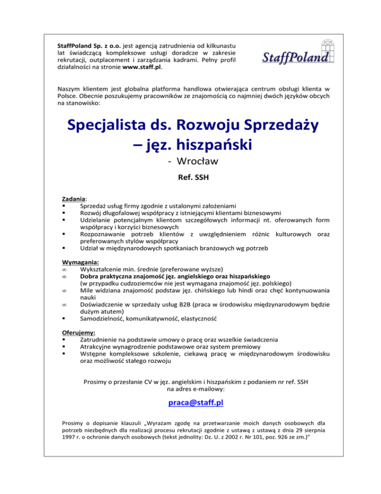 StaffPoland Sp. z o.o. jest agencją zatrudnienia od kilkunastu lat świadczącą kompleksowe usługi doradcze w zakresie rekrutacji, outplacement i zarządzania kadrami. Pełny profil działalności na stronie www.staff.pl. Naszym klientem jest globalna platforma handlowa otwierająca centrum obsługi klienta w Polsce. Obecnie poszukujemy pracowników ze znajomością co najmniej dwóch języków obcych na stanowisko: Specjalista ds. Rozwoju Sprzedaży – jęz. hiszpański - Wrocław Ref. SSH Zadania: Sprzedaż usług firmy zgodnie z ustalonymi założeniami Rozwój długofalowej współpracy z istniejącymi klientami biznesowymi Udzielanie potencjalnym klientom szczegółowych informacji nt. oferowanych form współpracy i korzyści biznesowych Rozpoznawanie potrzeb klientów z uwzględnieniem różnic kulturowych oraz preferowanych stylów współpracy Udział w międzynarodowych spotkaniach branżowych wg potrzeb Wymagania: Wykształcenie min. średnie (preferowane wyższe) Dobra praktyczna znajomość jęz. angielskiego oraz hiszpańskiego (w przypadku cudzoziemców nie jest wymagana znajomość jęz. polskiego) • Mile widziana znajomość podstaw jęz. chińskiego lub hindi oraz chęć kontynuowania nauki • Doświadczenie w sprzedaży usług B2B (praca w środowisku międzynarodowym będzie dużym atutem) Samodzielność, komunikatywność, elastyczność • • Oferujemy: Zatrudnienie na podstawie umowy o pracę oraz wszelkie świadczenia Atrakcyjne wynagrodzenie podstawowe oraz system premiowy Wstępne kompleksowe szkolenie, ciekawą pracę w międzynarodowym środowisku oraz możliwość stałego rozwoju Prosimy o przesłanie CV w jęz. angielskim i hiszpańskim z podaniem nr ref. SSH na adres e-mailowy: [email protected] Prosimy o dopisanie klauzuli „Wyrażam zgodę na przetwarzanie moich danych osobowych dla potrzeb niezbędnych dla realizacji procesu rekrutacji zgodnie z ustawą z ustawą z dnia 29 sierpnia 1997 r. o ochronie danych osobowych (tekst jednolity: Dz. U. z 2002 r. Nr 101, poz. 926 ze zm.)”
