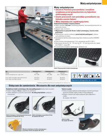 Maty antystatyczne Maty antystatyczne O Chrońcie Państwo pracowników i wrażliwe urządzenia przed gromadzeniem się ładunków elektrostatycznych! O Często pracownik sam powoduje gromadzenie się ładunku swoimi butami. O Maty antystatyczne zapobiegają temu. Podwyższony komfort i bezpieczeństwo • Mata o grubości 14,3 mm z kombinacją sztywnej, laminowanej powierzchni na spienionym winylu • Długość maks. do 22,8 m • Wyposażona w przycisk 10 mm i kabel uziemiający, również mata przycinana • Powierzchnia o wzorze rombowym przeciwdziała poślizgowi i ułatwia ruchy obrotowe na macie • Gromadzenie ładunku elektrostatycznego (test chodzenia) spełnia ISO6356 i EN1815 • Klasa ochrony przeciwpożarowej C (sl), sprawdzona wg EN 13 501-1 • Rezystancja skrośna Rv 106 - 109 oma, RH 106 - 109 oma wg normy dot. badań (EL 61340-4-1, klasa DIF) • 4 zukosowane krawędzie zapobiegające potykaniu się Detal: 10 mm przycisk do kabla uziemiającego Typ Wersja Wymiary zewnętrzne szer. x głęb. (mm) Nr art. kabel uziemiający, złącze pierścieniowe Nr art. kabel uziemiający, przycisk Antystatyczna 1 mata 910 x 1500 Antystatyczna 2 mata 910 x 3000 Antystatyczna 3 rolka (mb) 910 x według wyboru 165-103-37 165-543-37 165-104-37 165-545-37 165-106-37 165-546-37 Objaśnienie piktogramów zob. str. 428 * Dostępne wg Państwa wymiarów przy szerokości 91 cm, cena € za 1 m Dołączam do zamówienia: Akcesoria dla mat antystatycznych Dodatkowe kable uziemiające dla mat podłogowych (każda mata ma jeden) • Kabel o długości 4,5 m ze stykiem do uziemienia • Łatwe zakładanie, po prostu zamocować do maty przyciskiem i połączyć z uziemieniem Taśma na piętę • Taśma na piętę zapewnia przewodzącym sznurem gumowym konieczny kontakt między osobą a matą podłogową. • Wilgoć w butach jest wykorzystywana jako połączenie z ciałem. Nr artykułu 165-109-37 Kabel uziemiający z końcówką pierścieniową do Kabel uziemiający z przyciskiem 10 mm, uziemienia, Nr artykułu 165-114-37 Nr artykułu 165-115-37 taśma na piętę, Nr artykułu 165-109-37 Wtyczka uziemiająca do kabla uziemiającego z przyciskiem 10 mm, Nr artykułu 165-116-37