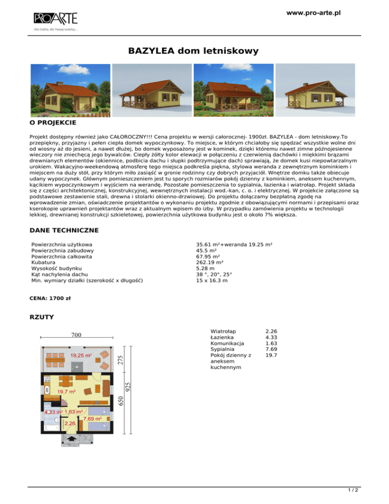 www.pro-arte.pl BAZYLEA dom letniskowy O PROJEKCIE Projekt dostępny również jako CAŁOROCZNY!!! Cena projektu w wersji całorocznej- 1900zł. BAZYLEA - dom letniskowy.To przepiękny, przyjazny i pełen ciepła domek wypoczynkowy. To miejsce, w którym chciałoby się spędzać wszystkie wolne dni od wiosny aż do jesieni, a nawet dłużej, bo domek wyposażony jest w kominek, dzięki któremu nawet zimne późnojesienne wieczory nie zniechęcą jego bywalców. Ciepły żółty kolor elewacji w połączeniu z czerwienią dachówki i miękkimi brązami drewnianych elementów (okiennice, podbicia dachu i słupki podtrzymujące dach) sprawiają, że domek kusi niepowtarzalnym urokiem. Wakacyjno-weekendową atmosferę tego miejsca podkreśla piękna, stylowa weranda z zewnętrznym kominkiem i miejscem na duży stół, przy którym miło zasiąść w gronie rodzinny czy dobrych przyjaciół. Wnętrze domku także obiecuje udany wypoczynek. Głównym pomieszczeniem jest tu sporych rozmiarów pokój dzienny z kominkiem, aneksem kuchennym, kącikiem wypoczynkowym i wyjściem na werandę. Pozostałe pomieszczenia to sypialnia, łazienka i wiatrołap. Projekt składa się z części architektonicznej, konstrukcyjnej, wewnętrznych instalacji wod.-kan, c. o. i elektrycznej. W projekcie załączone są podstawowe zestawienie stali, drewna i stolarki okienno-drzwiowej. Do projektu dołączamy bezpłatną zgodę na wprowadzenie zmian, oświadczenie projektantów o wykonaniu projektu zgodnie z obowiązującymi normami i przepisami oraz kserokopie uprawnień projektantów wraz z aktualnym wpisem do izby. W przypadku zamówienia projektu w technologii lekkiej, drewnianej konstrukcji szkieletowej, powierzchnia użytkowa budynku jest o około 7% większa. DANE TECHNICZNE Powierzchnia użytkowa Powierzchnia zabudowy Powierzchnia całkowita Kubatura Wysokość budynku Kąt nachylenia dachu Min. wymiary działki (szerokość x długość) 35.61 m²+weranda 19.25 m² 45.5 m² 67.95 m² 262.19 m³ 5.28 m 38 °, 20°, 25° 15 x 16.3 m CENA: 1700 zł RZUTY Wiatrołap Łazienka Komunikacja Sypialnia Pokój dzienny z aneksem kuchennym 2.26 4.33 1.63 7.69 19.7 1/2 www.pro-arte.pl tel. (32) 43-50-829, 502 575 920, [email protected], www.pro-arte.pl 2/2 Powered by TCPDF (www.tcpdf.org)