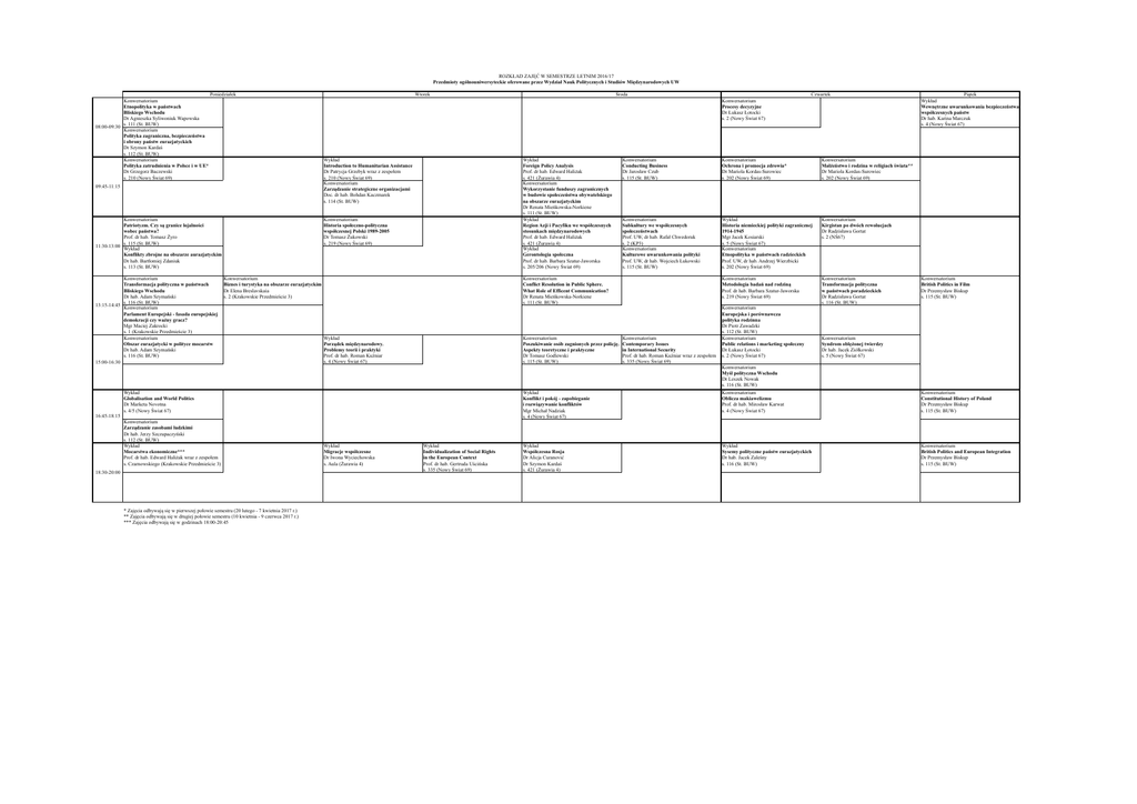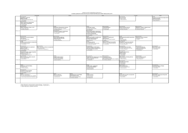 ROZKŁAD ZAJĘĆ W SEMESTRZE LETNIM 2016/17 Przedmioty ogólnouniwersyteckie oferowane przez Wydział Nauk Politycznych i Studiów Międzynarodowych UW Poniedziałek Konwersatorium Etnopolityka w państwach Bliskiego Wschodu Dr Agnieszka Syliwoniuk Wapowska 08:00-09:30 s. 111 (St. BUW) Konwersatorium Polityka zagraniczna, bezpieczeństwa i obrony państw eurazjatyckich Dr Szymon Kardaś s. 112 (St. BUW) Konwersatorium Polityka zatrudnienia w Polsce i w UE* Dr Grzegorz Baczewski s. 210 (Nowy Świat 69) Wykład Introduction to Humanitarian Assistance Dr Patrycja Grzebyk wraz z zespołem s. 210 (Nowy Świat 69) Konwersatorium Zarządzanie strategiczne organizacjami Doc. dr hab. Bohdan Kaczmarek s. 114 (St. BUW) Konwersatorium Patriotyzm. Czy są granice lojalności wobec państwa? Prof. dr hab. Tomasz Żyro 11:30-13:00 s. 115 (St. BUW) Wykład Konflikty zbrojne na obszarze aurazjatyckim Dr hab. Bartłomiej Zdaniuk s. 113 (St. BUW) 16:45-18:15 Środa Czwartek Konwersatorium Procesy decyzyjne Dr Łukasz Łotocki s. 2 (Nowy Świat 67) 09:45-11:15 Konwersatorium Transformacja polityczna w państwach Bliskiego Wschodu Dr hab. Adam Szymański 13:15-14:45 s. 116 (St. BUW) Konwersatorium Parlament Europejski - fasada europejskiej demokracji czy ważny gracz? Mgr Maciej Zakrocki s. 1 (Krakowskie Przedmieście 3) Konwersatorium Obszar eurazjatycki w polityce mocarstw Dr hab. Adam Szymański s. 116 (St. BUW) 15:00-16:30 Wtorek Wykład Foreign Policy Analysis Prof. dr hab. Edward Haliżak s. 421 (Żurawia 4) Konwersatorium Wykorzystanie funduszy zagranicznych w budowie społeczeństwa obywatelskiego na obszarze eurazjatyckim Dr Renata Mieńkowska-Norkiene s. 111 (St. BUW) Wykład Region Azji i Pacyfiku we współczesnych stosunkach międzynarodowych Prof. dr hab. Edward Haliżak s. 421 (Żurawia 4) Wykład Gerontologia społeczna Prof. dr hab. Barbara Szatur-Jaworska s. 205/206 (Nowy Świat 69) Konwersatorium Historia społeczno-polityczna współczesnej Polski 1989-2005 Dr Tomasz Żukowski s. 219 (Nowy Świat 69) Konwersatorium Biznes i turystyka na obszarze eurazjatyckim Dr Elena Breslavskaia s. 2 (Krakowskie Przedmieście 3) 18:30-20:00 * Zajęcia odbywają się w pierwszej połowie semestru (20 lutego - 7 kwietnia 2017 r.) ** Zajęcia odbywają się w drugiej połowie semestru (10 kwietnia - 9 czerwca 2017 r.) *** Zajęcia odbywają się w godzinach 18:00-20:45 Konwersatorium Ochrona i promocja zdrowia* Dr Mariola Kordas-Surowiec s. 202 (Nowy Świat 69) Konwersatorium Małżeństwo i rodzina w religiach świata** Dr Mariola Kordas-Surowiec s. 202 (Nowy Świat 69) Konwersatorium Subkultury we współczesnych społeczeństwach Prof. UW, dr hab. Rafał Chwedoruk s. 2 (KP3) Konwersatorium Kulturowe uwarunkowania polityki Prof. UW, dr hab. Wojciech Łukowski s. 115 (St. BUW) Wykład Historia niemieckiej polityki zagranicznej 1914-1945 Mgr Jacek Kosiarski s. 5 (Nowy Świat 67) Konwersatorium Etnopolityka w państwach radzieckich Prof. UW, dr hab. Andrzej Wierzbicki s. 202 (Nowy Świat 69) Konwersatorium Kirgistan po dwóch rewolucjach Dr Radzisława Gortat s. 2 (NŚ67) Konwersatorium Metodologia badań nad rodziną Prof. dr hab. Barbara Szatur-Jaworska s. 219 (Nowy Świat 69) Konwersatorium Transformacja polityczna w państwach poradzieckich Dr Radzisława Gortat s. 116 (St. BUW) Konwersatorium Conflict Resolution in Public Sphere. What Role of Efficent Communication? Dr Renata Mieńkowska-Norkiene s. 111 (St. BUW) Wykład Porządek międzynarodowy. Problemy teorii i praktyki Prof. dr hab. Roman Kuźniar s. 4 (Nowy Świat 67) Konwersatorium Poszukiwanie osób zagnionych przez policję. Aspekty teoretyczne i praktyczne Dr Tomasz Godlewski s. 115 (St. BUW) Wykład Globalisation and World Politics Dr Marketa Novotna s. 4/5 (Nowy Świat 67) Konwersatorium Zarządzanie zasobami ludzkimi Dr hab. Jerzy Szczupaczyński s. 112 (St. BUW) Wykład Mocarstwa ekonomiczne*** Prof. dr hab. Edward Haliżak wraz z zespołem s. Czarnowskiego (Krakowskie Przedmieście 3) Konwersatorium Conducting Business Dr Jarosław Czub s. 115 (St. BUW) Wykład Konflikt i pokój - zapobieganie i rozwiązywanie konfliktów Mgr Michał Nadziak s. 4 (Nowy Świat 67) Wykład Migracje współczesne Dr Iwona Wyciechowska s. Aula (Żurawia 4) Wykład Individualization of Social Rights in the European Context Prof. dr hab. Gertruda Uścińska s. 335 (Nowy Świat 69) Wykład Współczesna Rosja Dr Alicja Curanović Dr Szymon Kardaś s. 421 (Żurawia 4) Konwersatorium Contemporary Issues in International Security Prof. dr hab. Roman Kuźniar wraz z zespołem s. 335 (Nowy Świat 69) Konwersatorium Europejska i porównawcza polityka rodzinna Dr Piotr Zawadzki s. 112 (St. BUW) Konwersatorium Public relations i marketing społeczny Dr Łukasz Łotocki s. 2 (Nowy Świat 67) Piątek Wykład Wewnętrzne uwarunkowania bezpieczeństwa współczesnych państw Dr hab. Karina Marczuk s. 4 (Nowy Świat 67) Konwersatorium British Politics in Film Dr Przemysław Biskup s. 115 (St. BUW) Konwersatorium Syndrom oblężonej twierdzy Dr hab. Jacek Ziółkowski s. 5 (Nowy Świat 67) Konwersatorium Myśl polityczna Wschodu Dr Leszek Nowak s. 116 (St. BUW) Konwersatorium Oblicza makiawelizmu Prof. dr hab. Mirosław Karwat s. 4 (Nowy Świat 67) Konwersatorium Constitutional History of Poland Dr Przemysław Biskup s. 115 (St. BUW) Wykład Sysemy polityczne państw eurazjatyckich Dr hab. Jacek Zaleśny s. 116 (St. BUW) Konwersatorium British Politics and European Integration Dr Przemysław Biskup s. 115 (St. BUW)